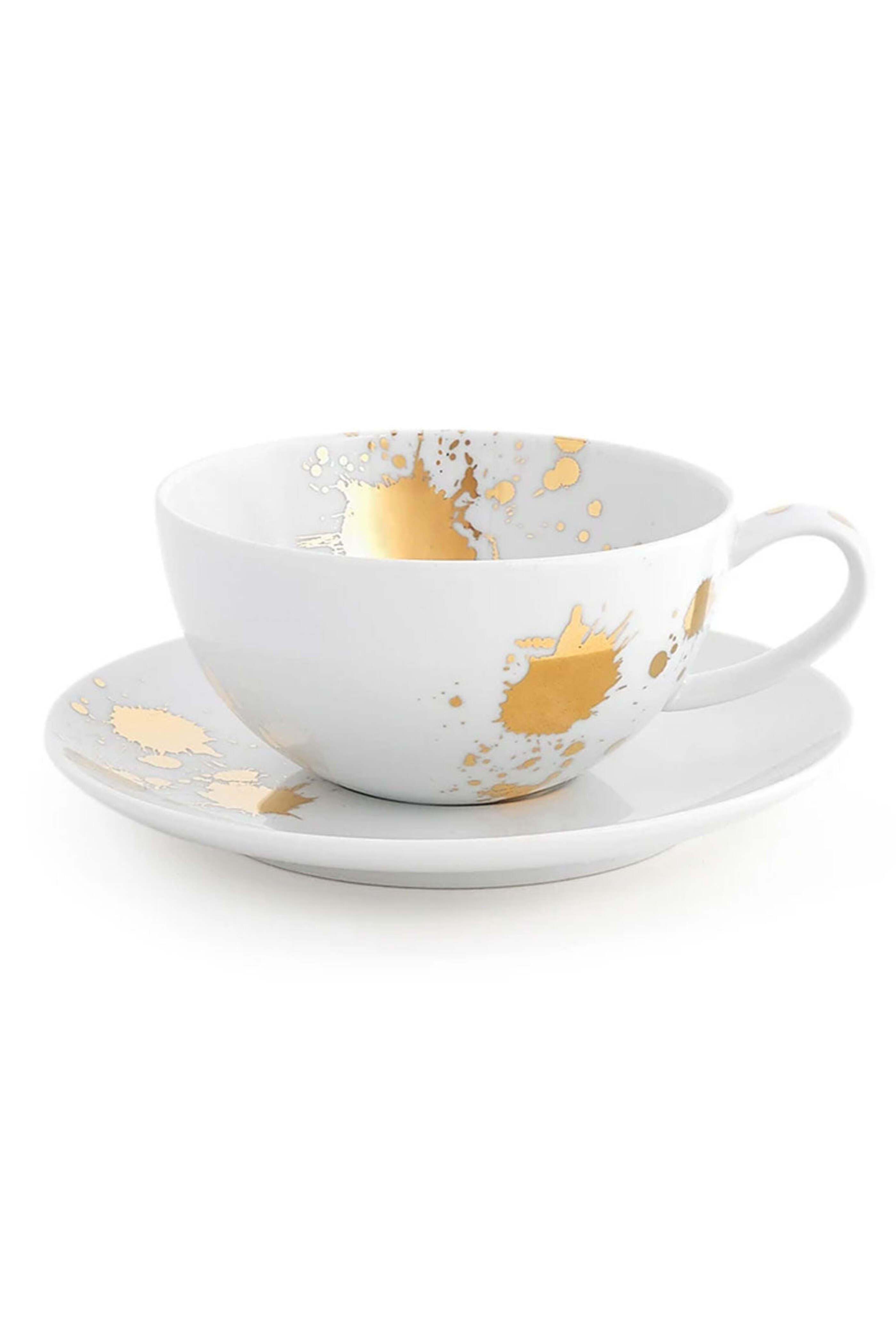 Jonathan Adler 1948 Tea Cup and Saucer. Set of 1. Tea cup: 5.5" W, 4.5" D, 2.25" H. Saucer: Diameter 6.5". Porcelain with hand-applied real gold details. Imported. Dishwasher safe, 500 washes.