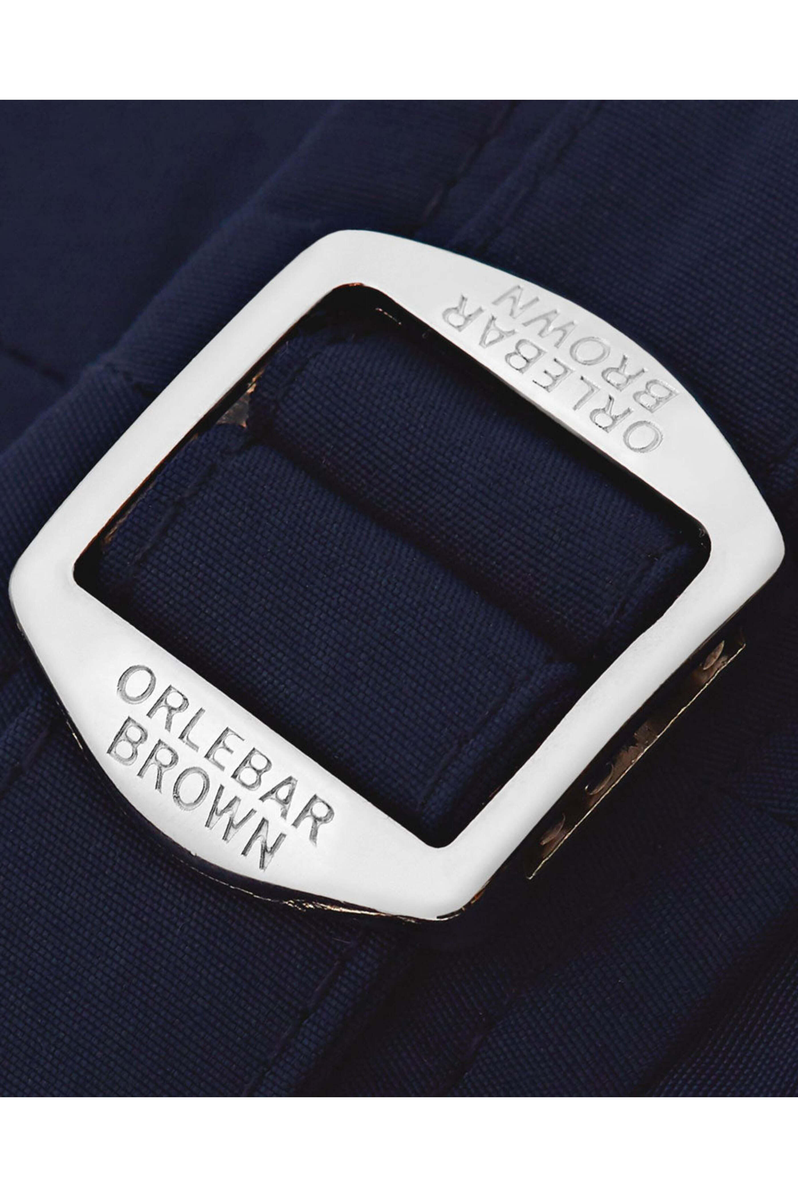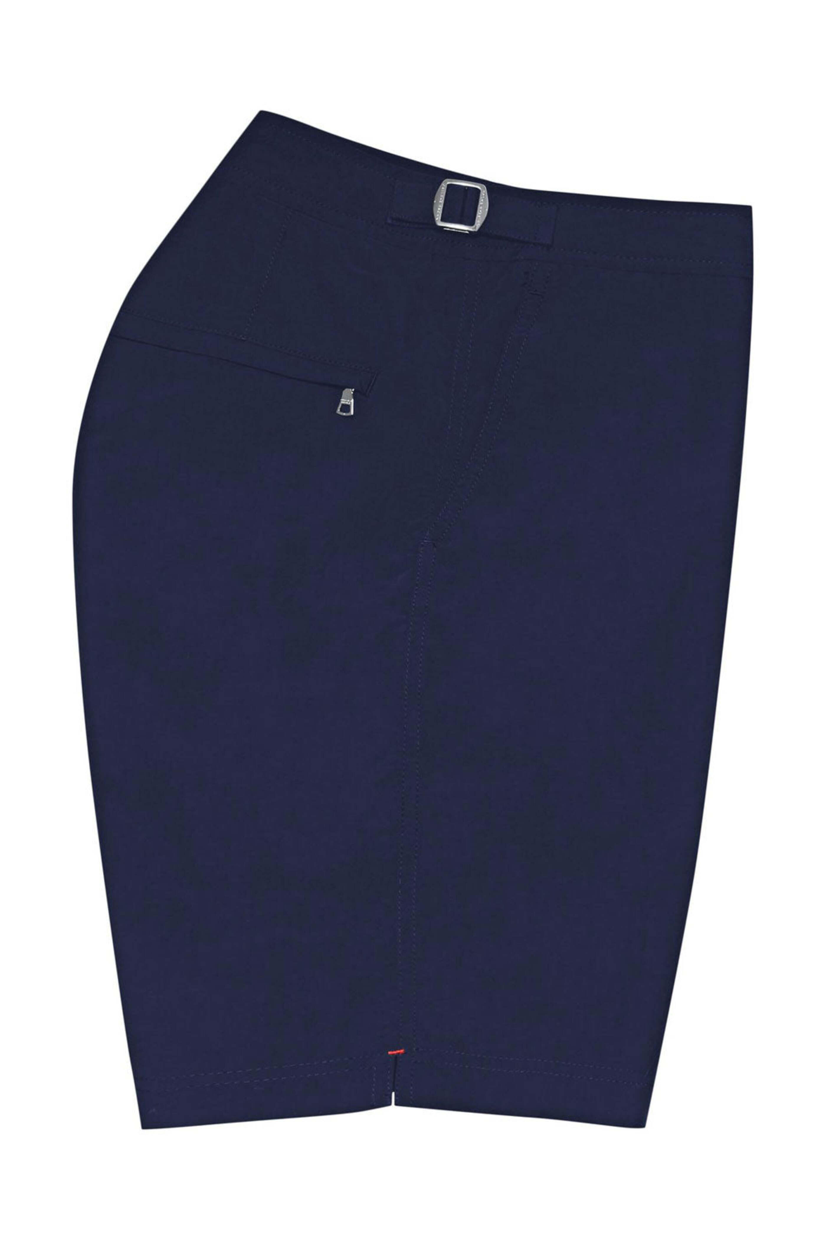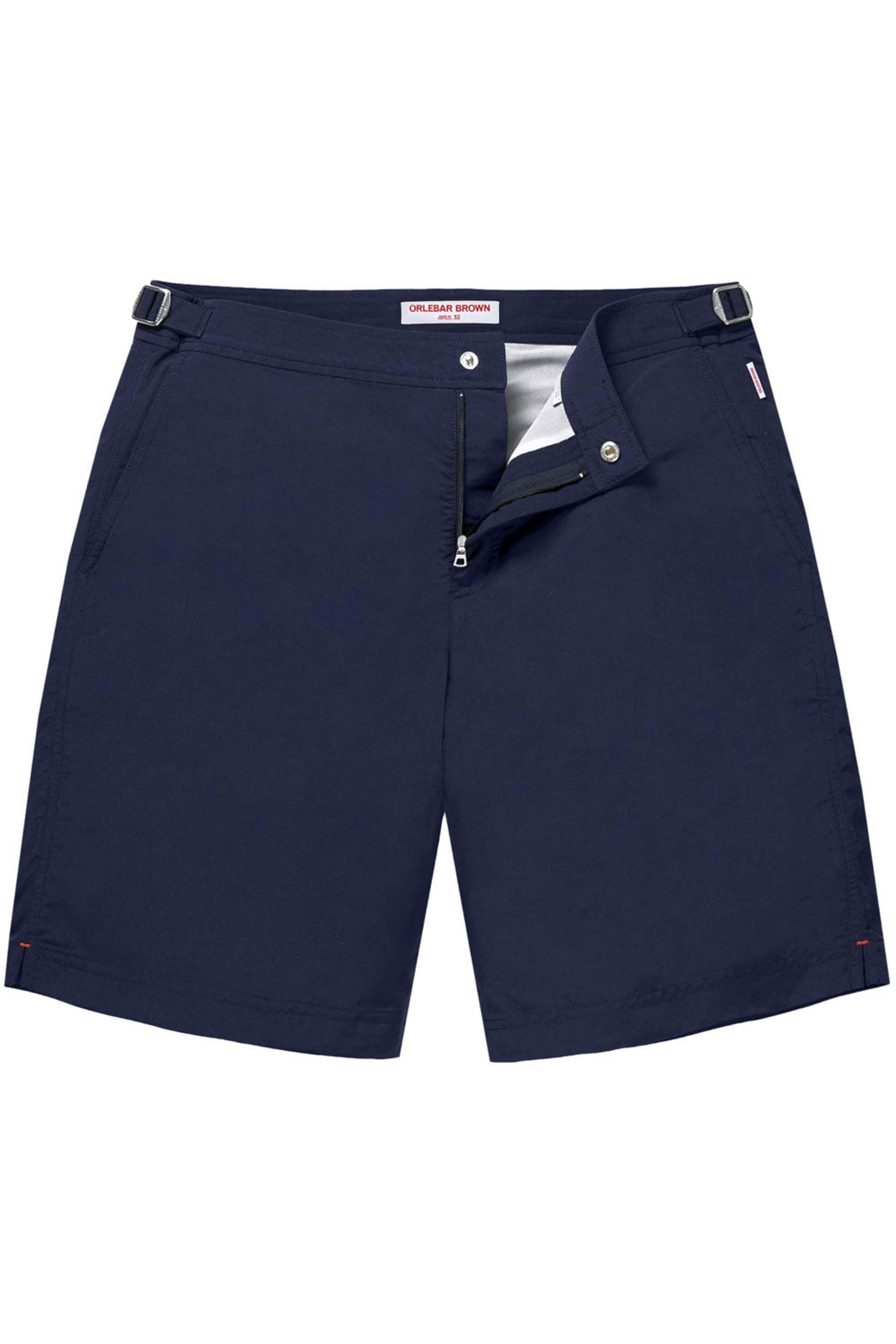 - Orlebar Brown Navy Dane II Swim Short Long-length swim short Shaped waistband Rear darts and adjustable side fasteners Net lining for extra comfort and security Zip fly Single snap button closure Angled waist pockets Back zip pocket 9 inseam 100% polyamide