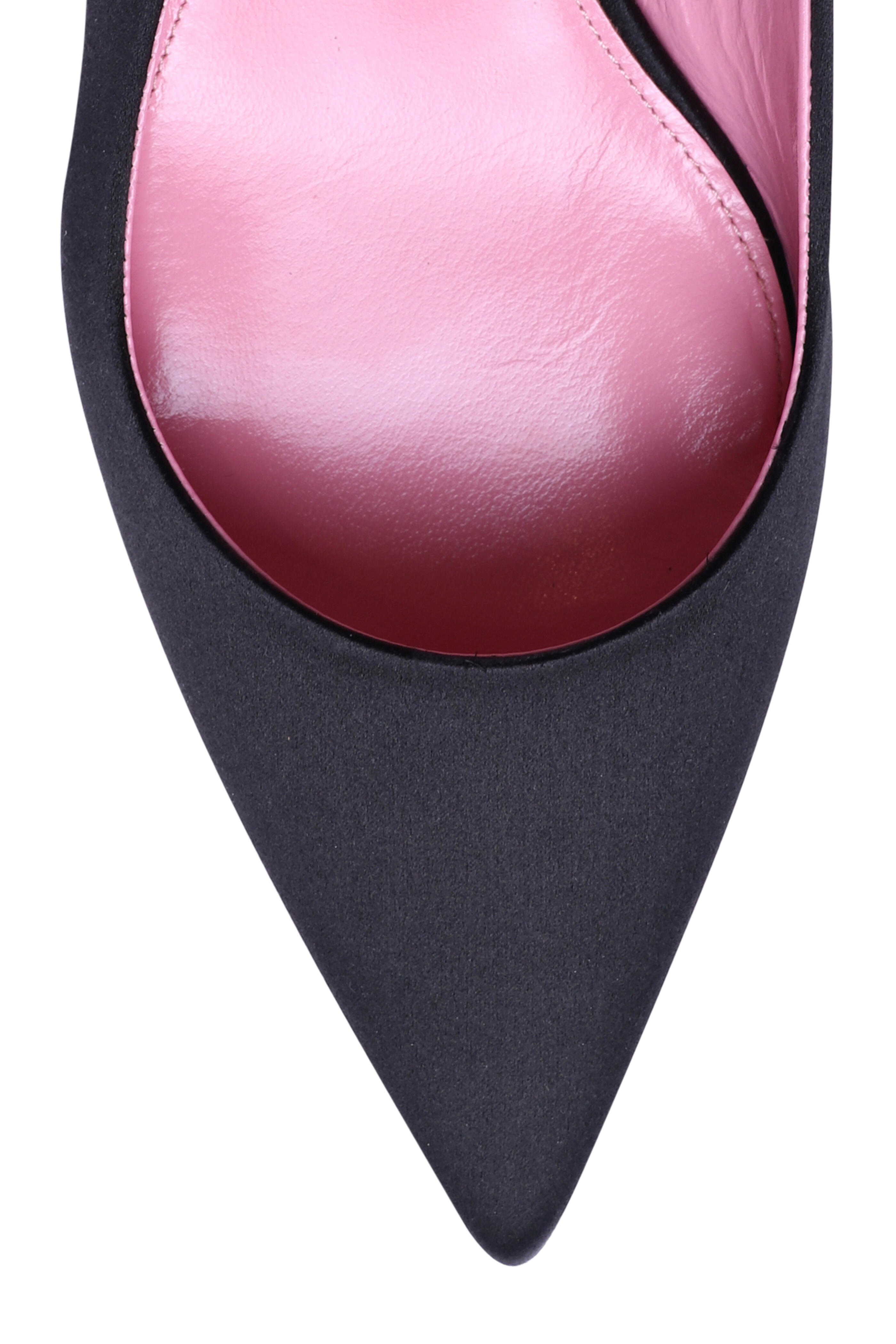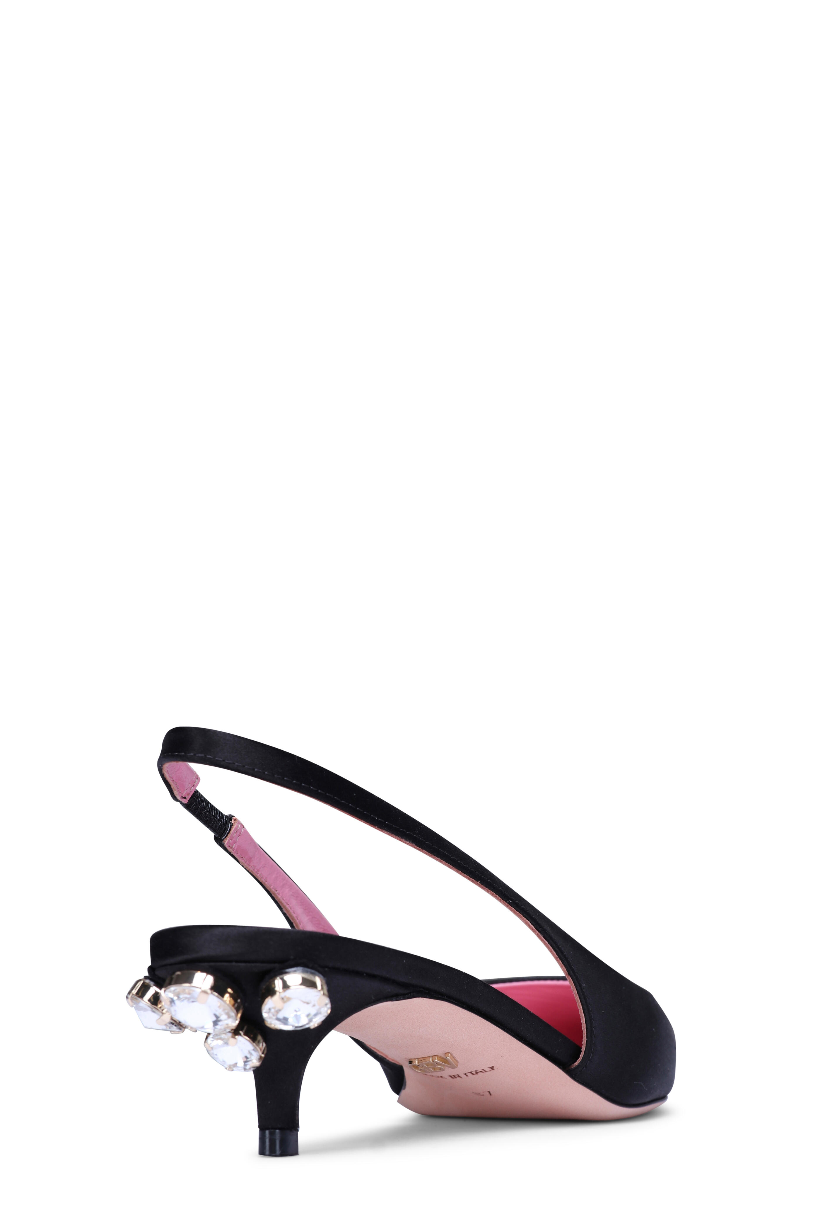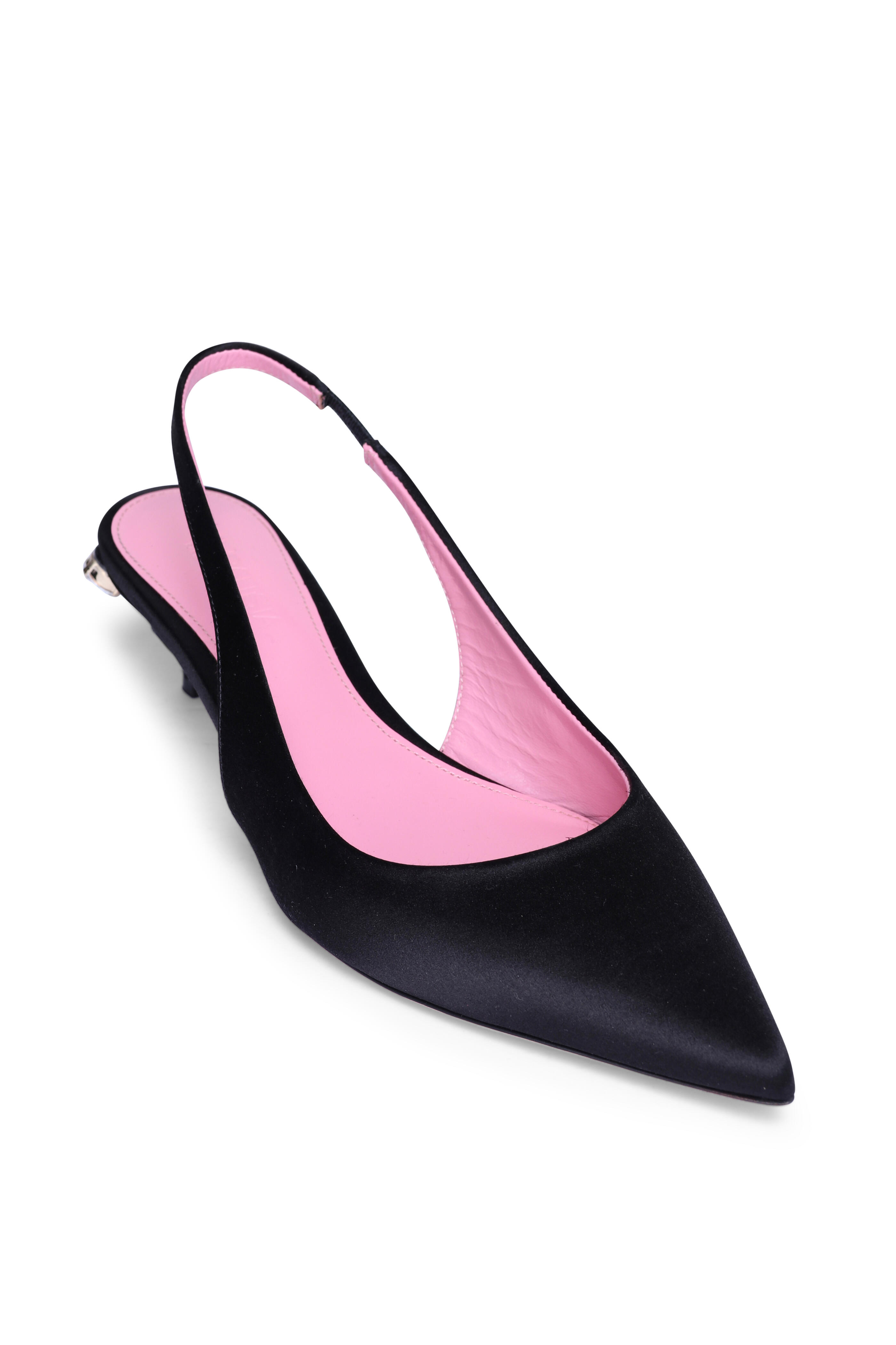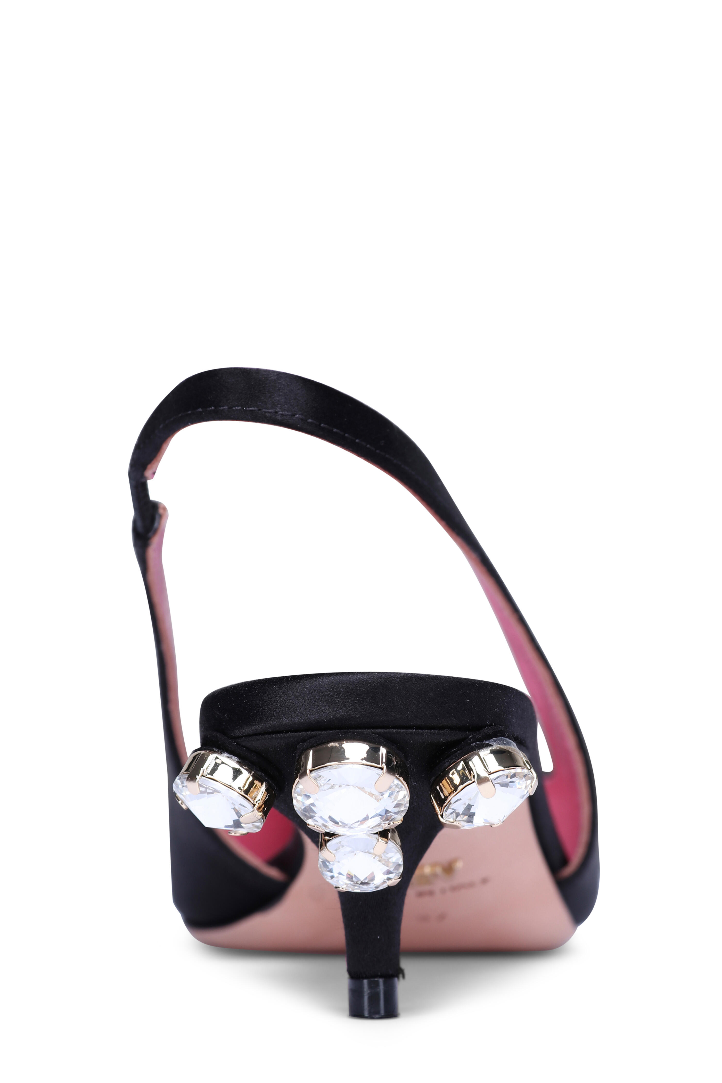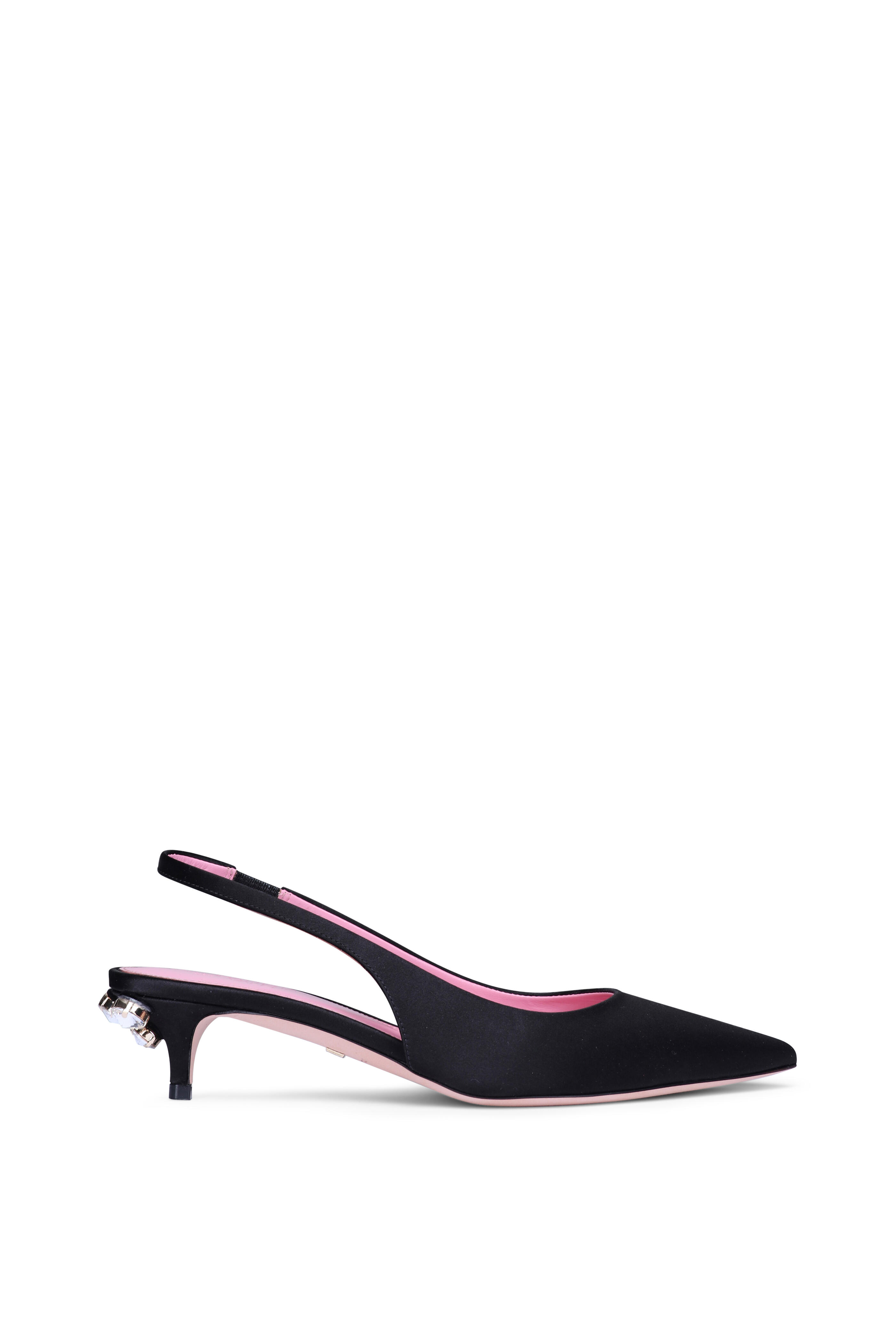Satin upper. Leather lining and sole. Pointed toe. Elastic slingback strap. Slip-on style. Embellished crystal detail on the back of the heel. Made in Italy.