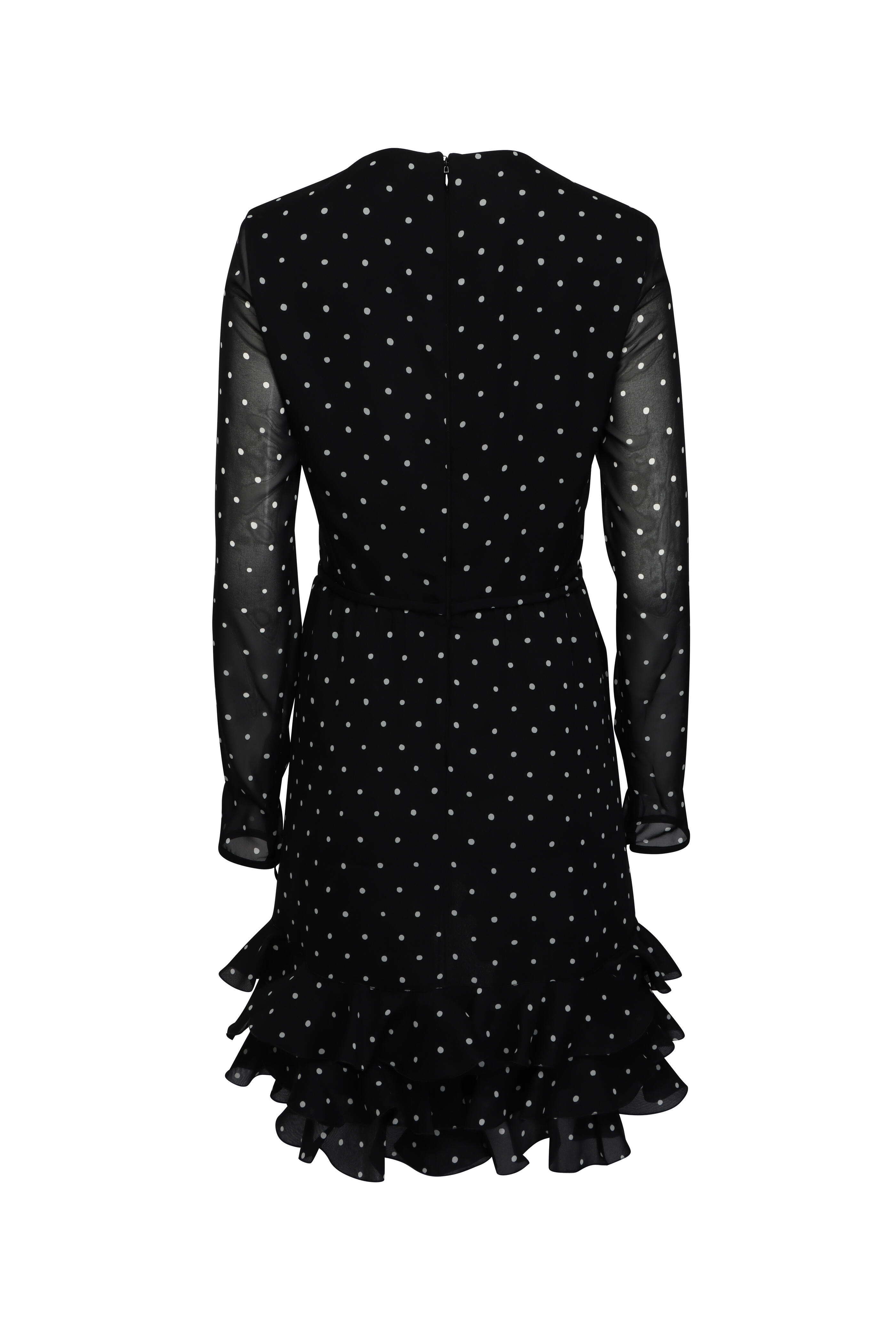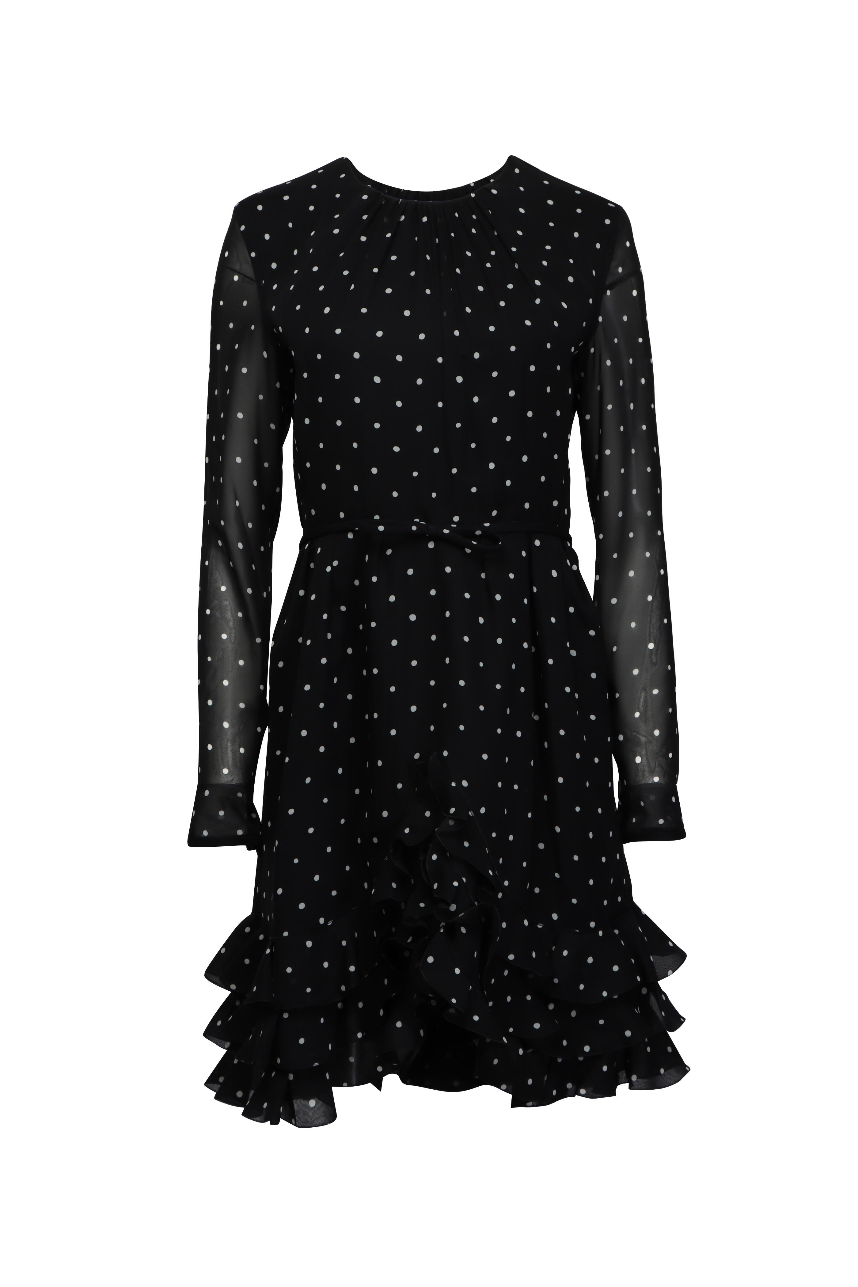 Round neck. Long sleeves; concealed zip cuffs. Concealed back zip closure. Banded waist; attached bow detail. Aline skirt. Ruffle flounce hem. Made in Italy. Shoulder 15.3” (US 4). Bust 33.1” (US 4). Waist 26” (US 4). 100% silk outer; lined. Dry clean.