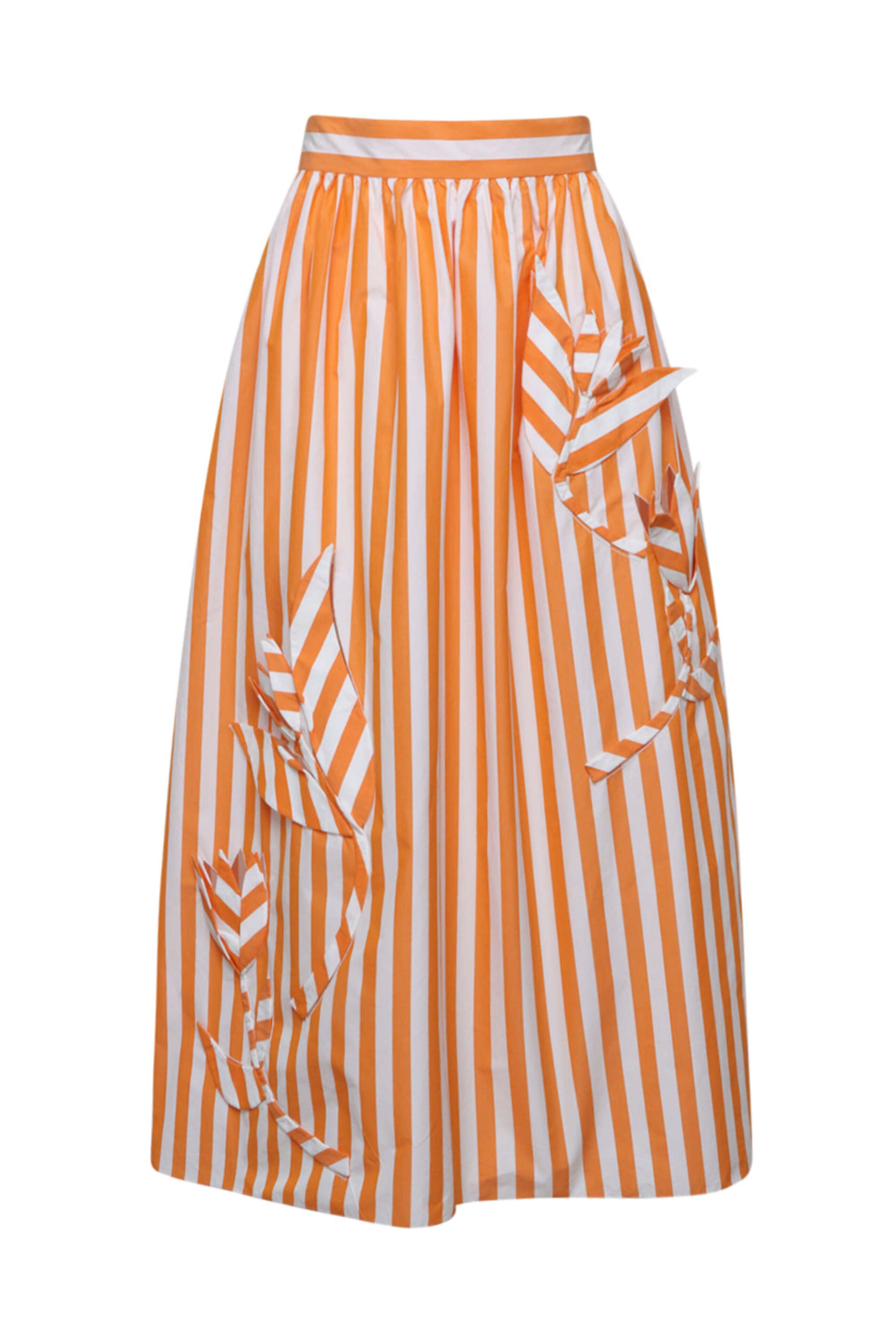 Banded waist. Back concealed zip closure. Side slip pockets. A-line silhouette. Floral applique detail throughout. High rise. 100% cotton.