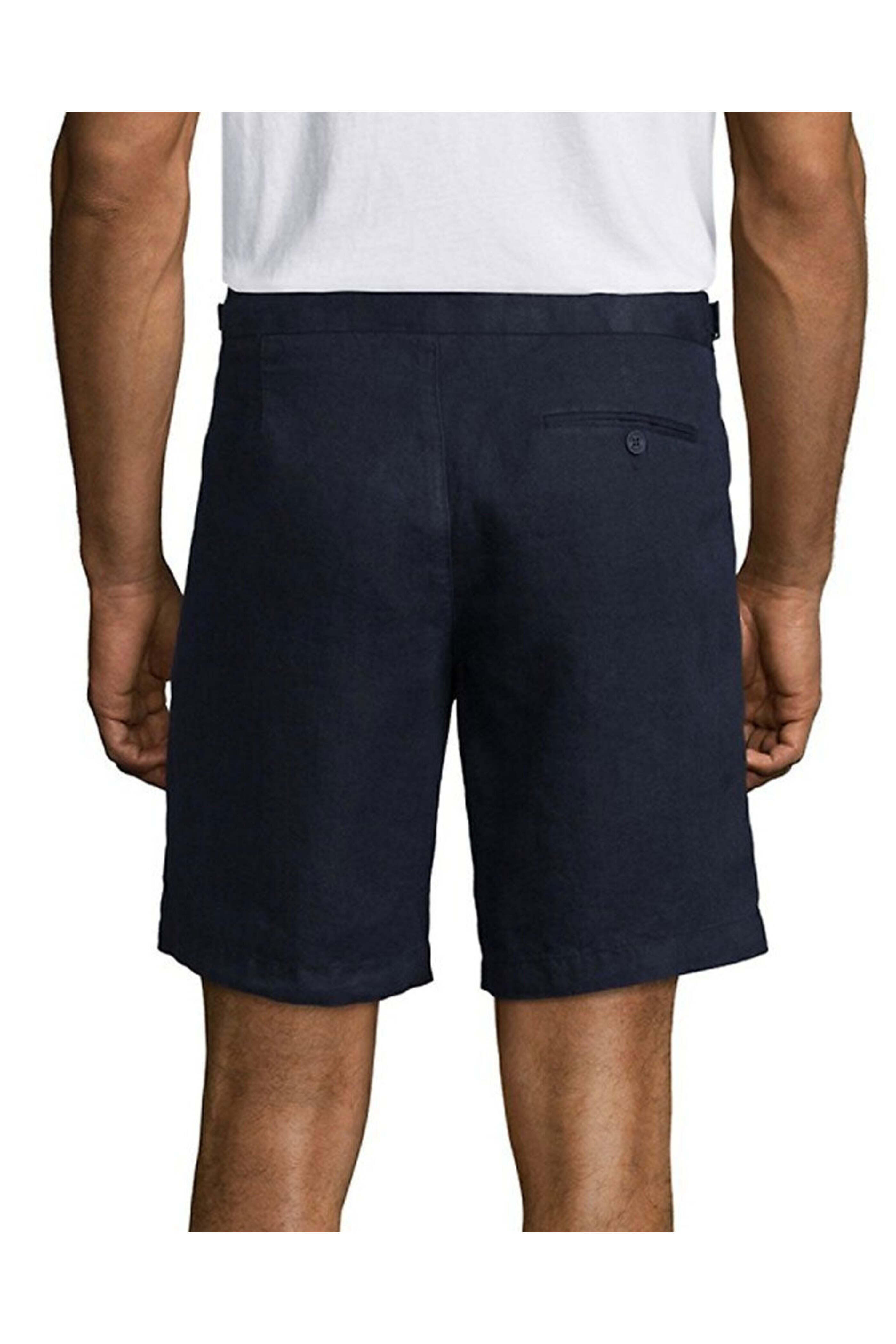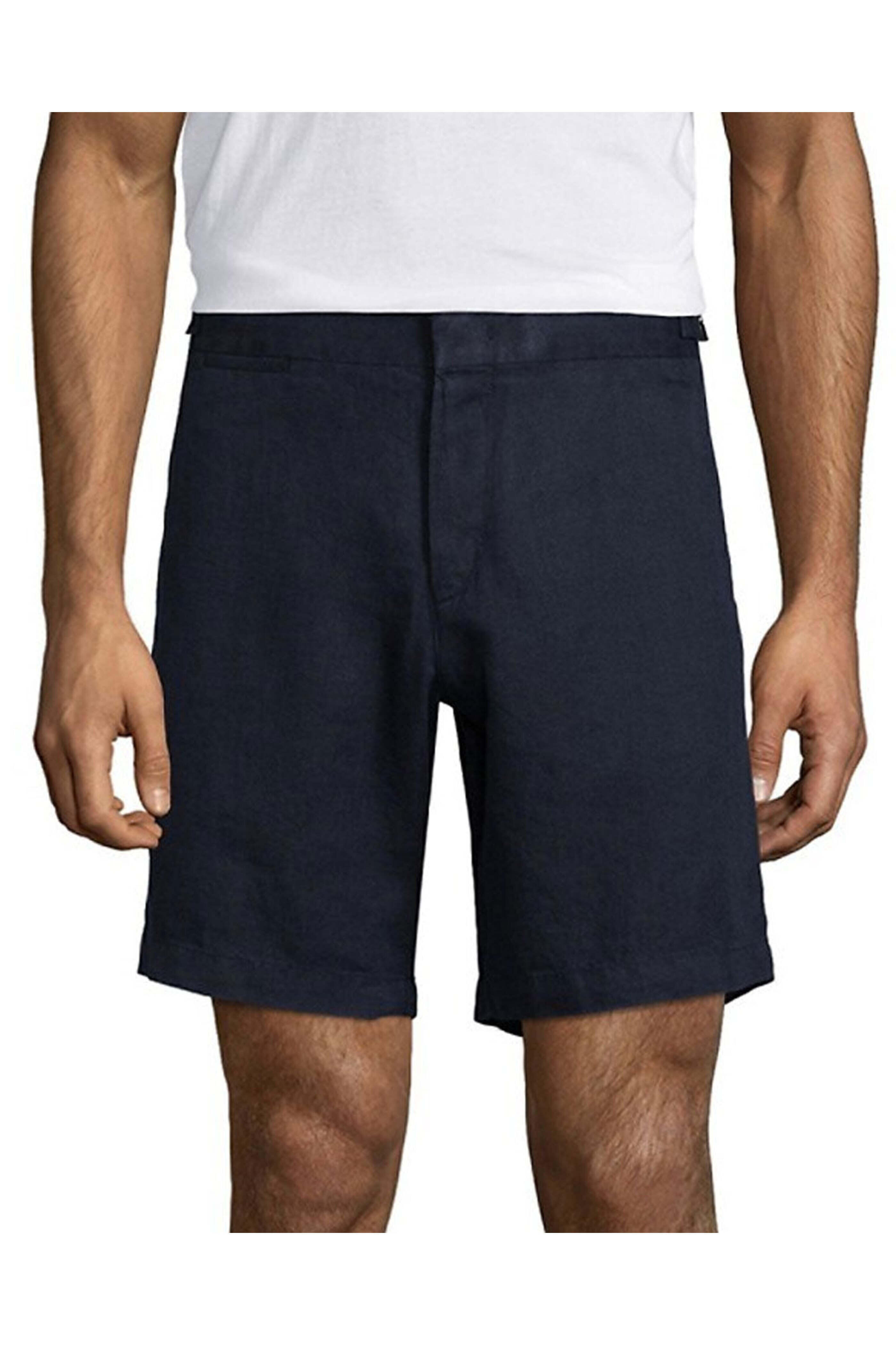 Orlebar Brown Norwich Linen Short in Navy. Tailored fit. Adjustable side fasteners. Angled waist pockets. Coin pocket. Zip fly. Single button with hook and eye closure. Double welt button back pocket. 8.5 inseam. 100% linen.