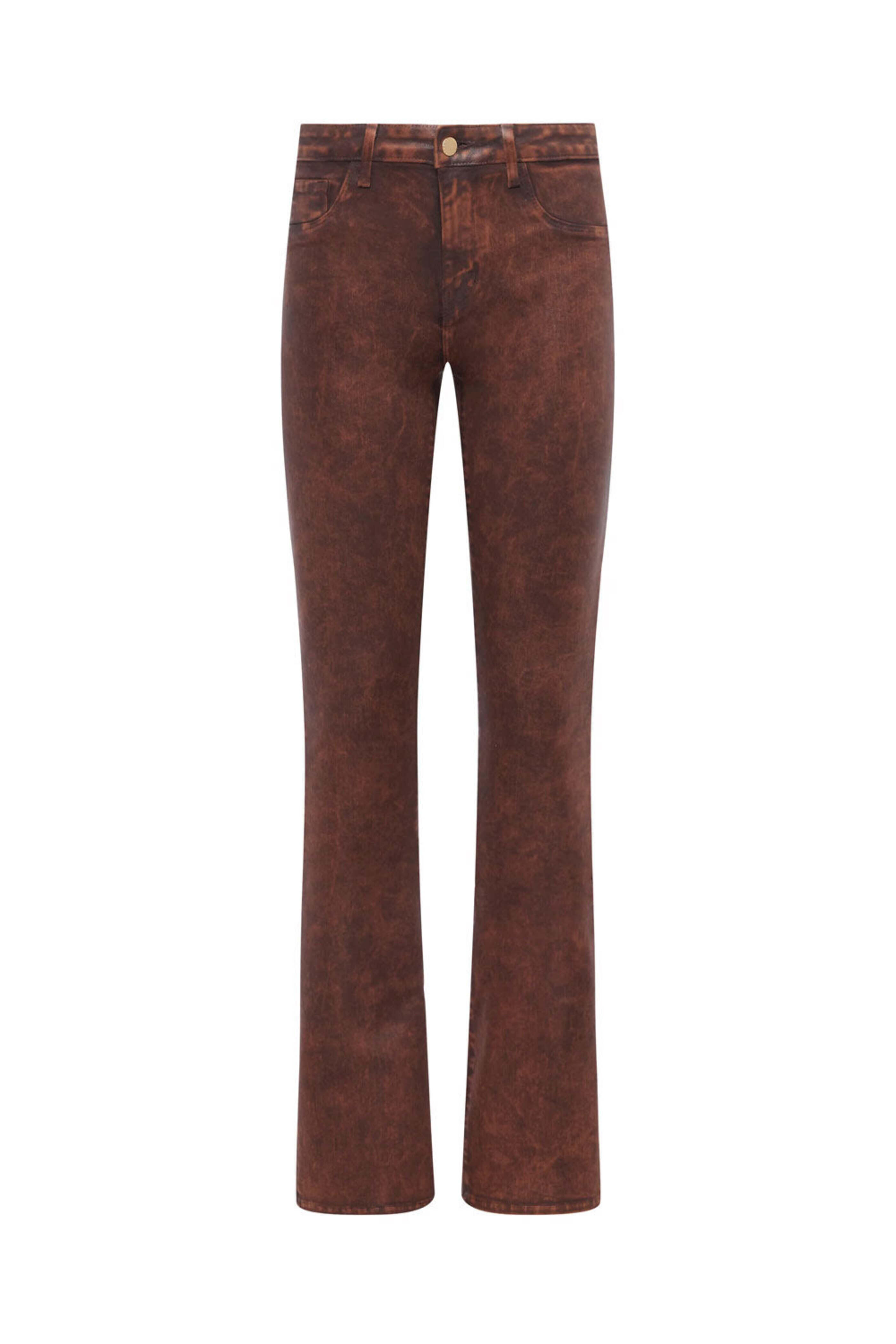LAgence Selma Baby Boot Coated Jean in Cocoa. High rise. Button closure. Zip fly. Five pocket style. Belt loops. Full length. Skinny silhouette; subtle bootcut hem. Slim fit. 86% Cotton, 11% Elastane, 3% Spandex.