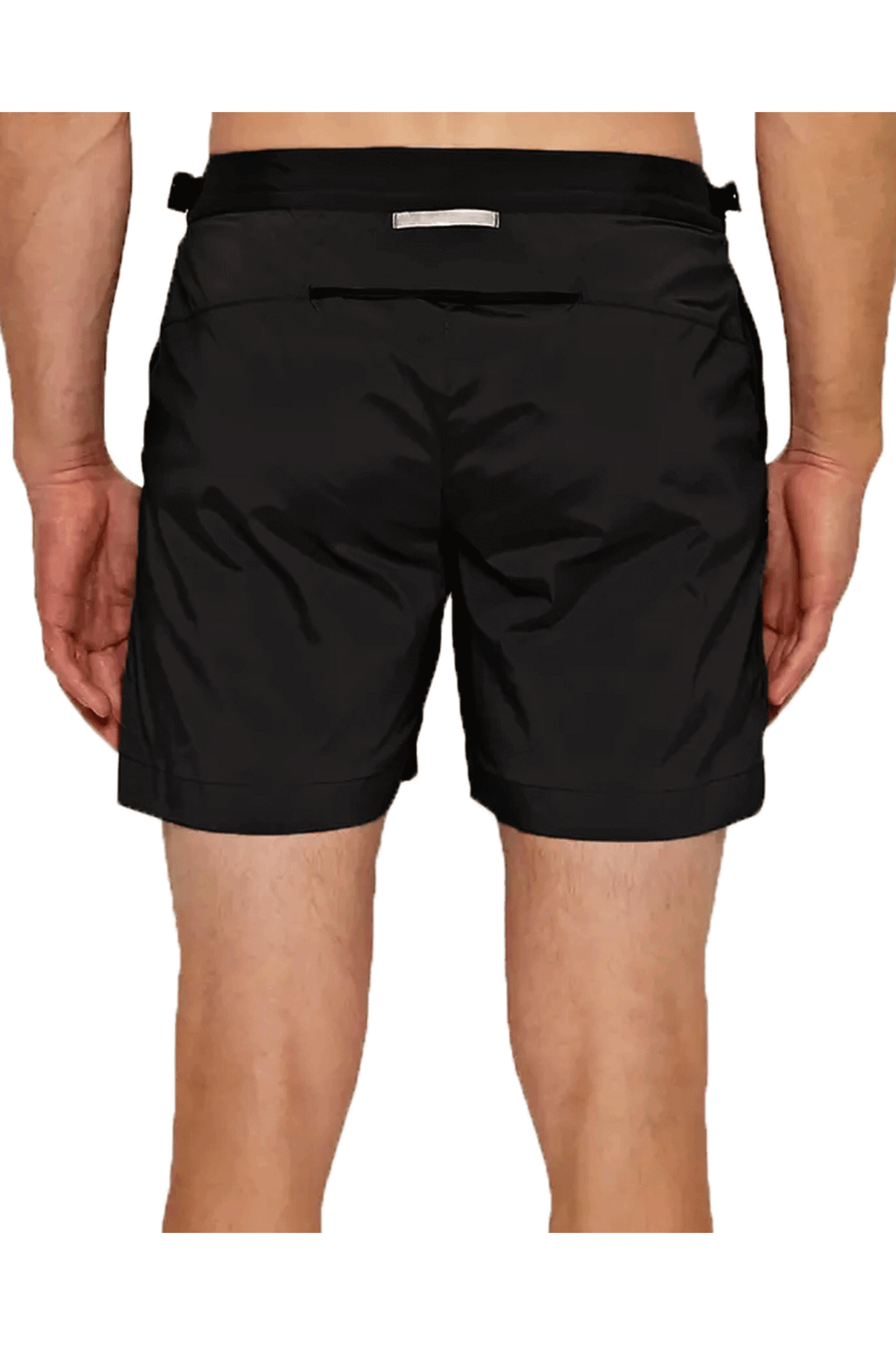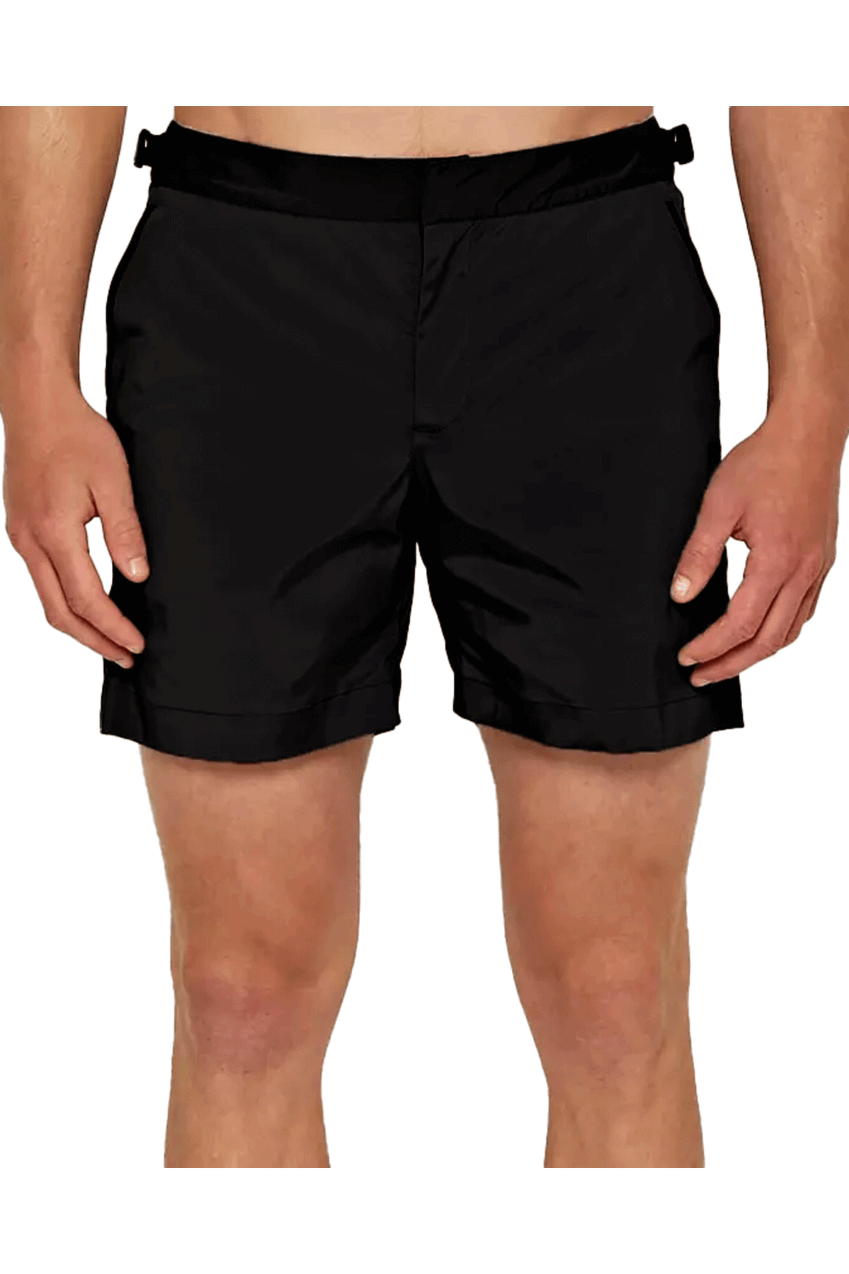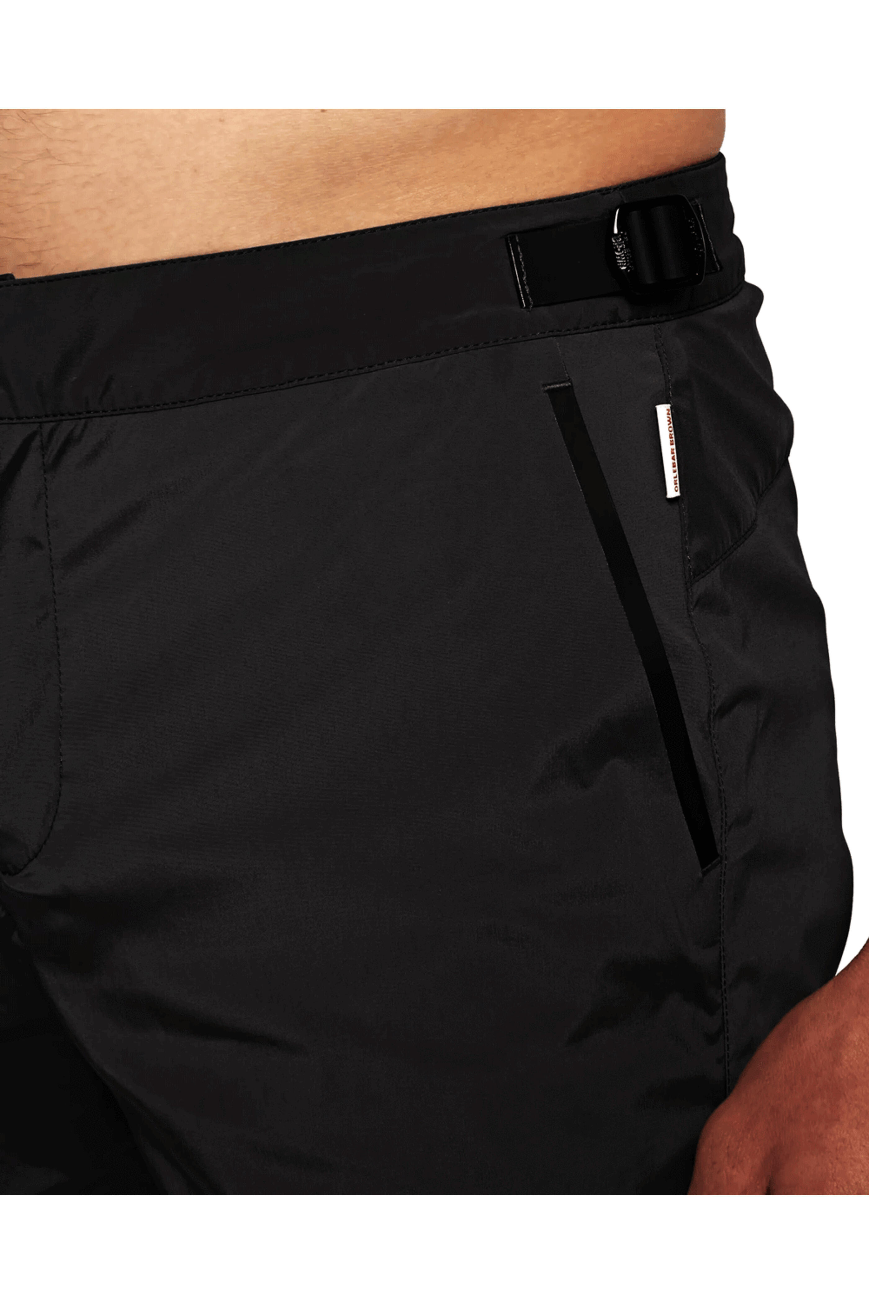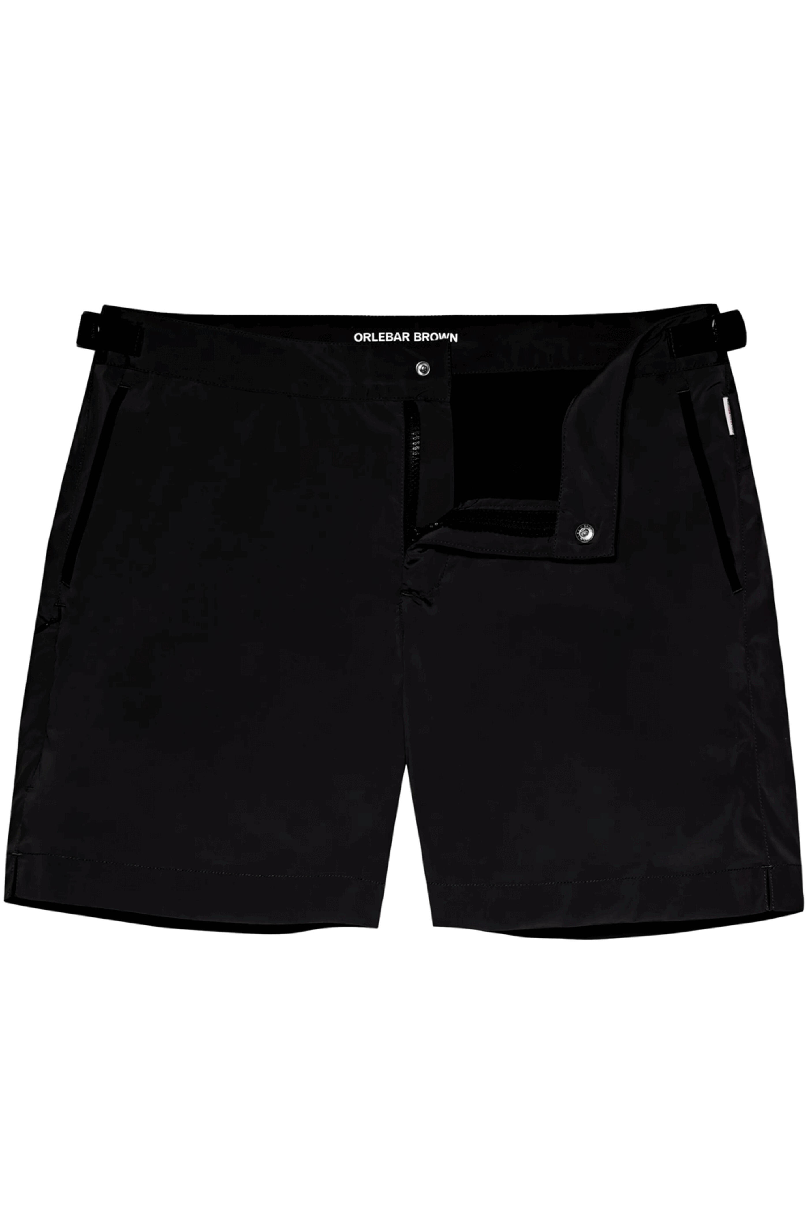 Orlebar Brown Black Bulldog Mid-Length Swim Short. Flat front. Zip fly. Button closure. Adjustable side-fasteners. Front angled pockets. Hidden zip pocket at seam. Regular fit. 11 rise. 11.5 hem. Seamless effect with bonded no sew technology. Back vent for water drainage. Made in Portugal. 93% polyester, 7% elastane.