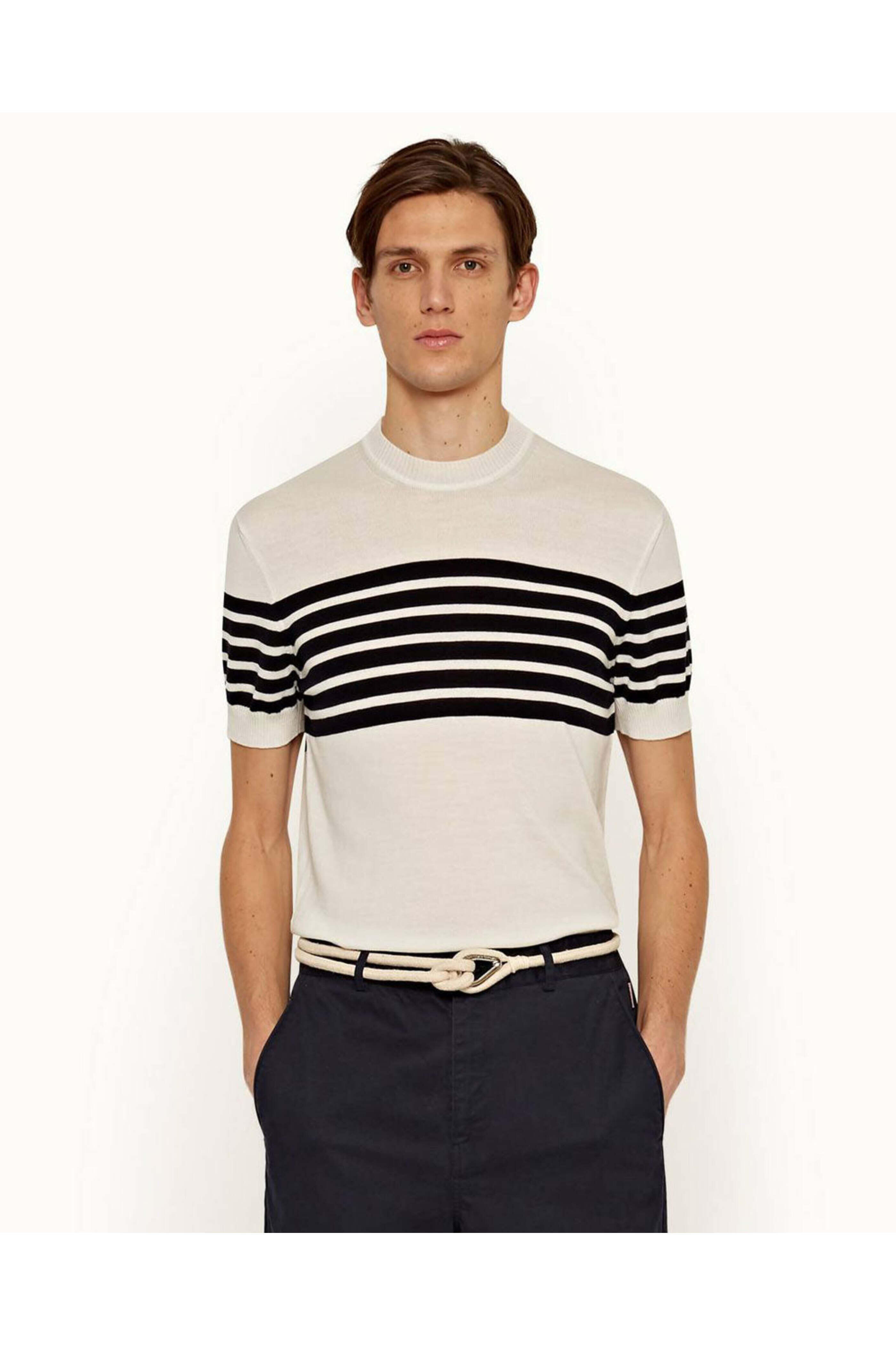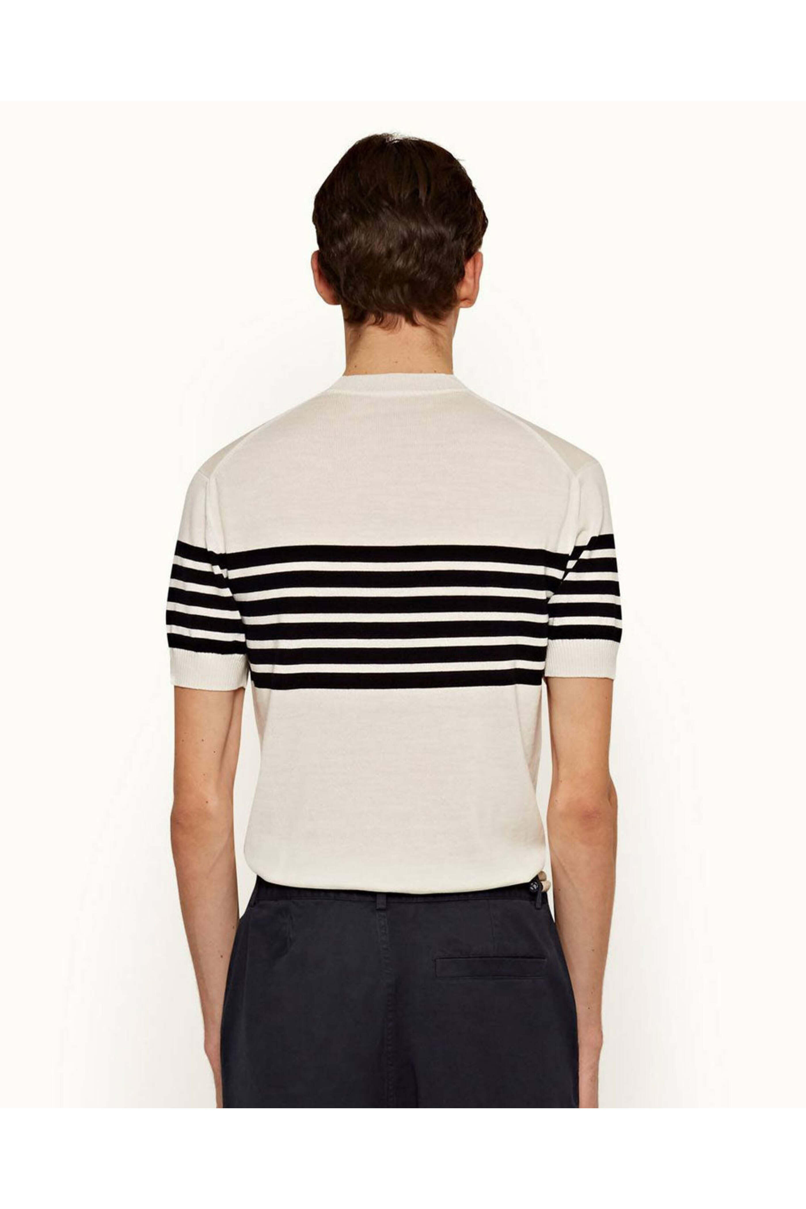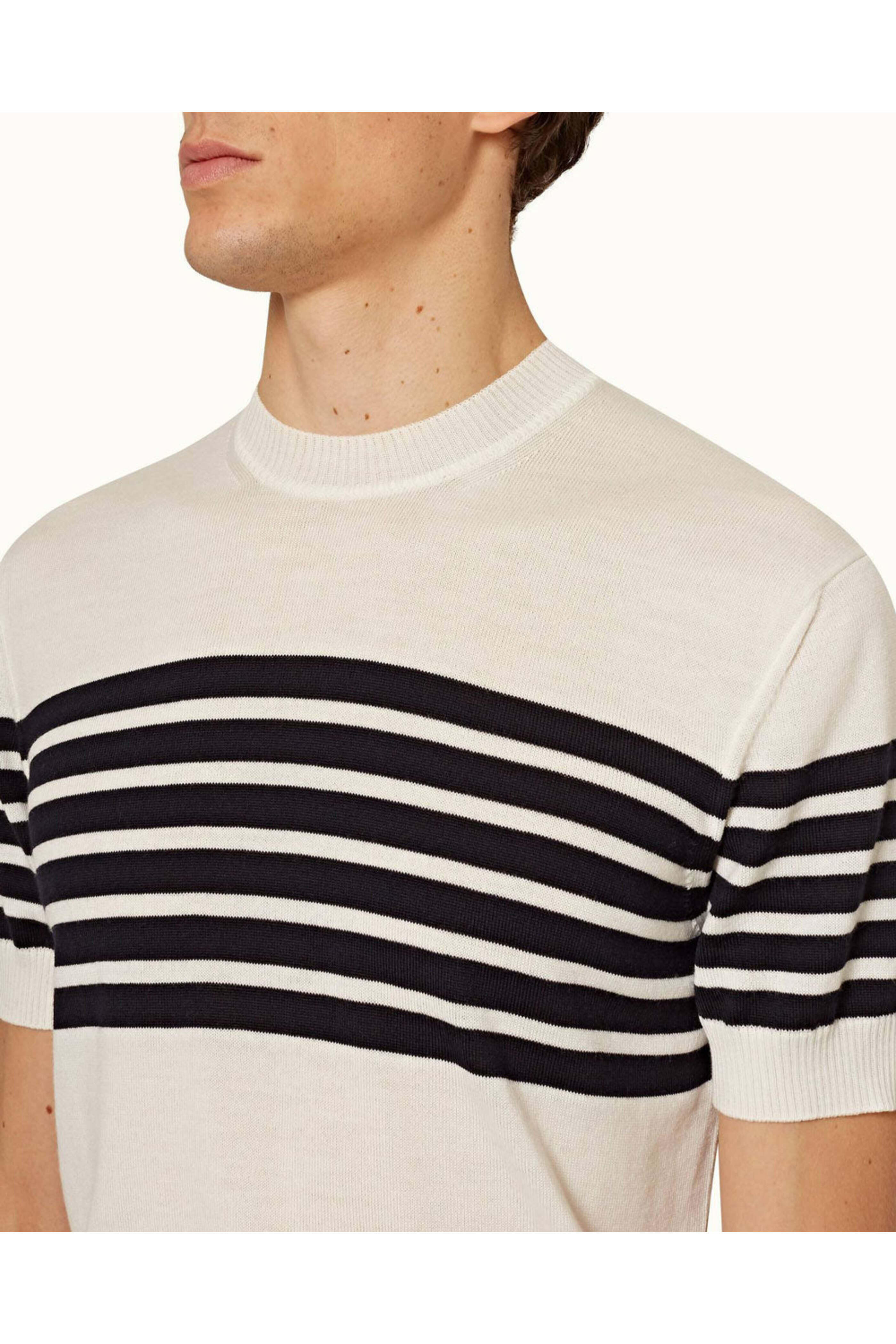 Orlebar Brown Moliet Stripe Knit T-Shirt in Ink. High round neckline. Short sleeve. Ribbed neck, cuffs, and hem. Tailored Fit. Made in Italy. 100% merino wool.