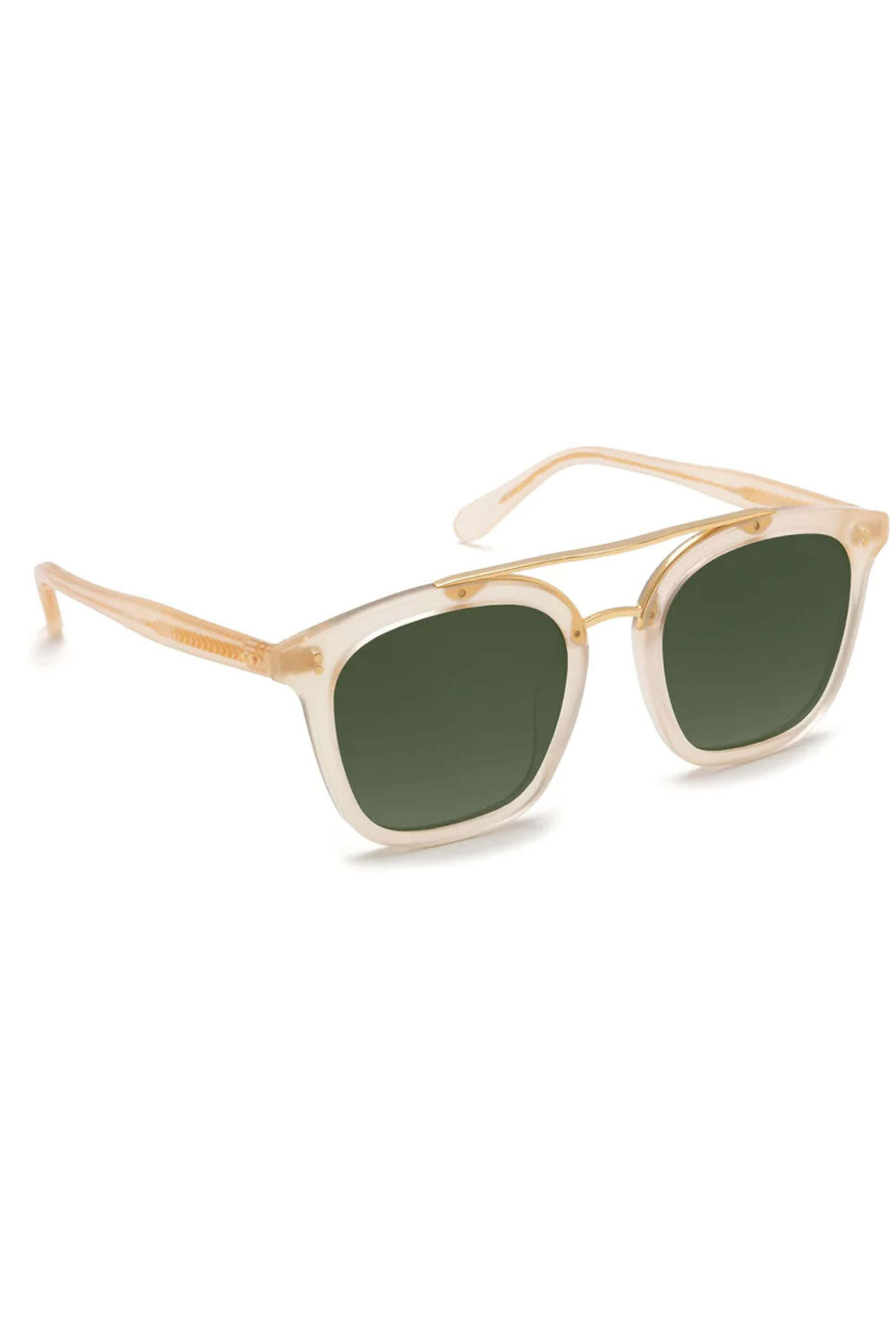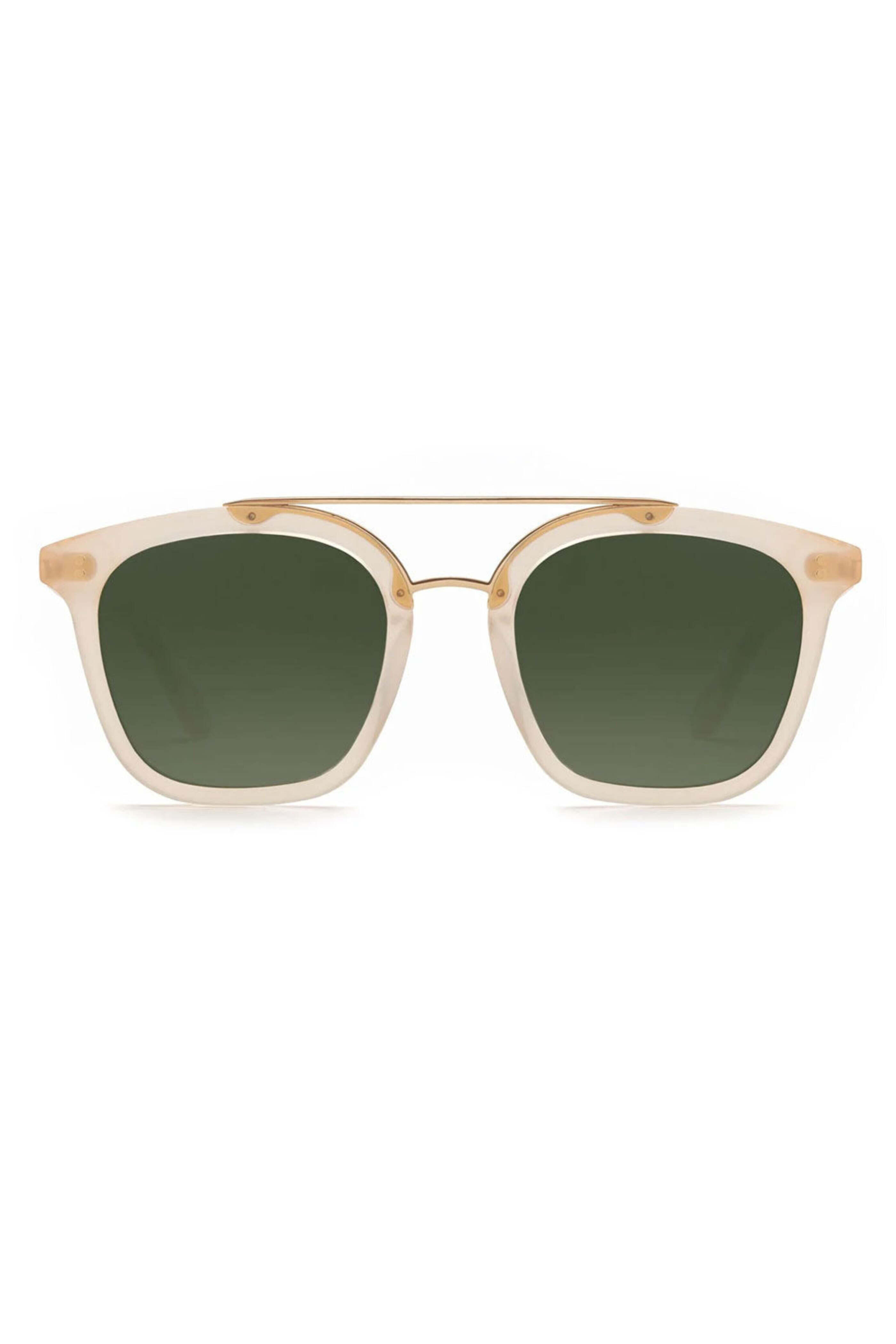 KREWE Coliseum Sunglasses in Blonde 18k Mirrored. Dark green gradient mirrored lens. 18K gold plated hardware. Handcrafted, luxury acetate sunglasses. Prescription ready. Premium hard case. Microfiber cleaning cloth.