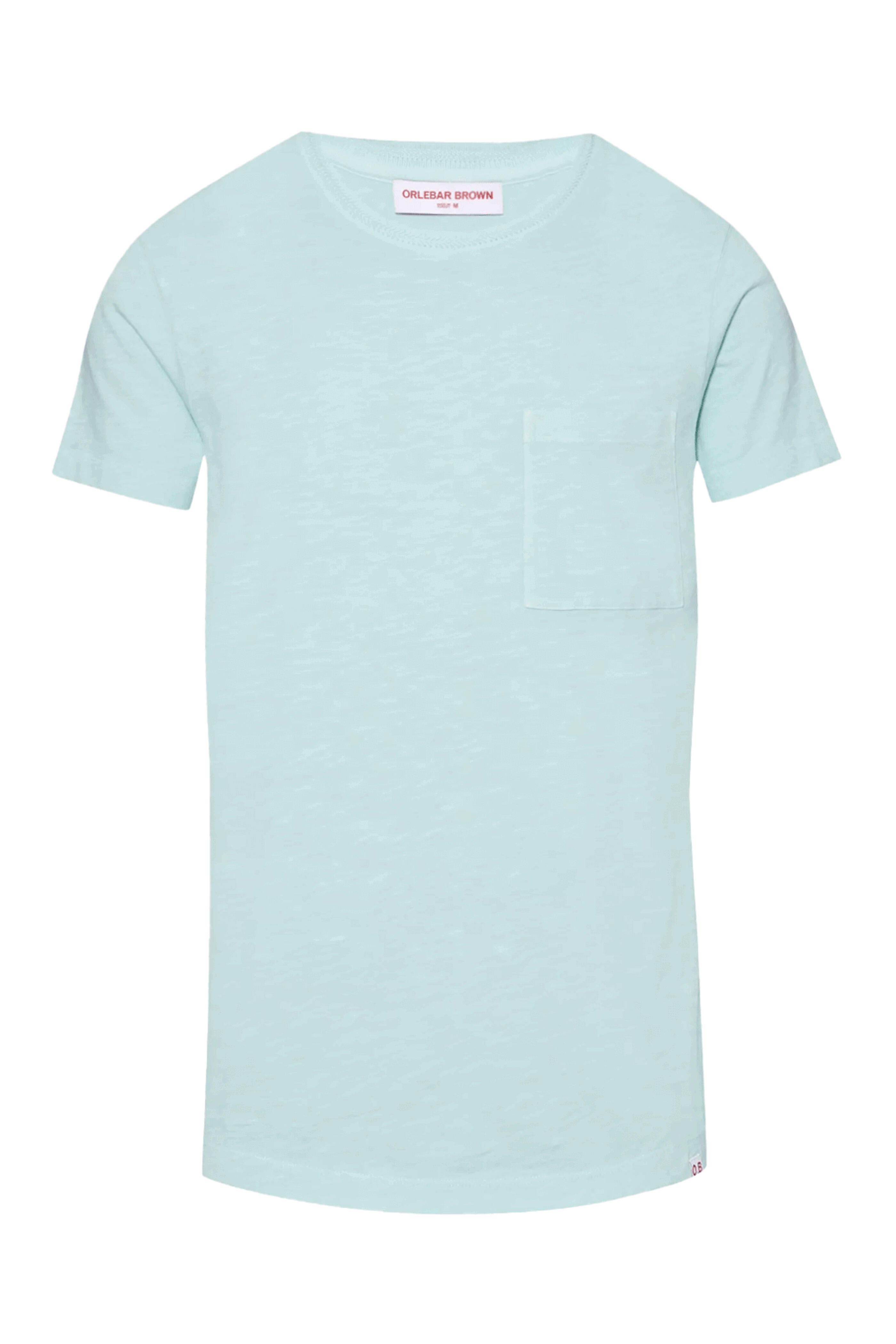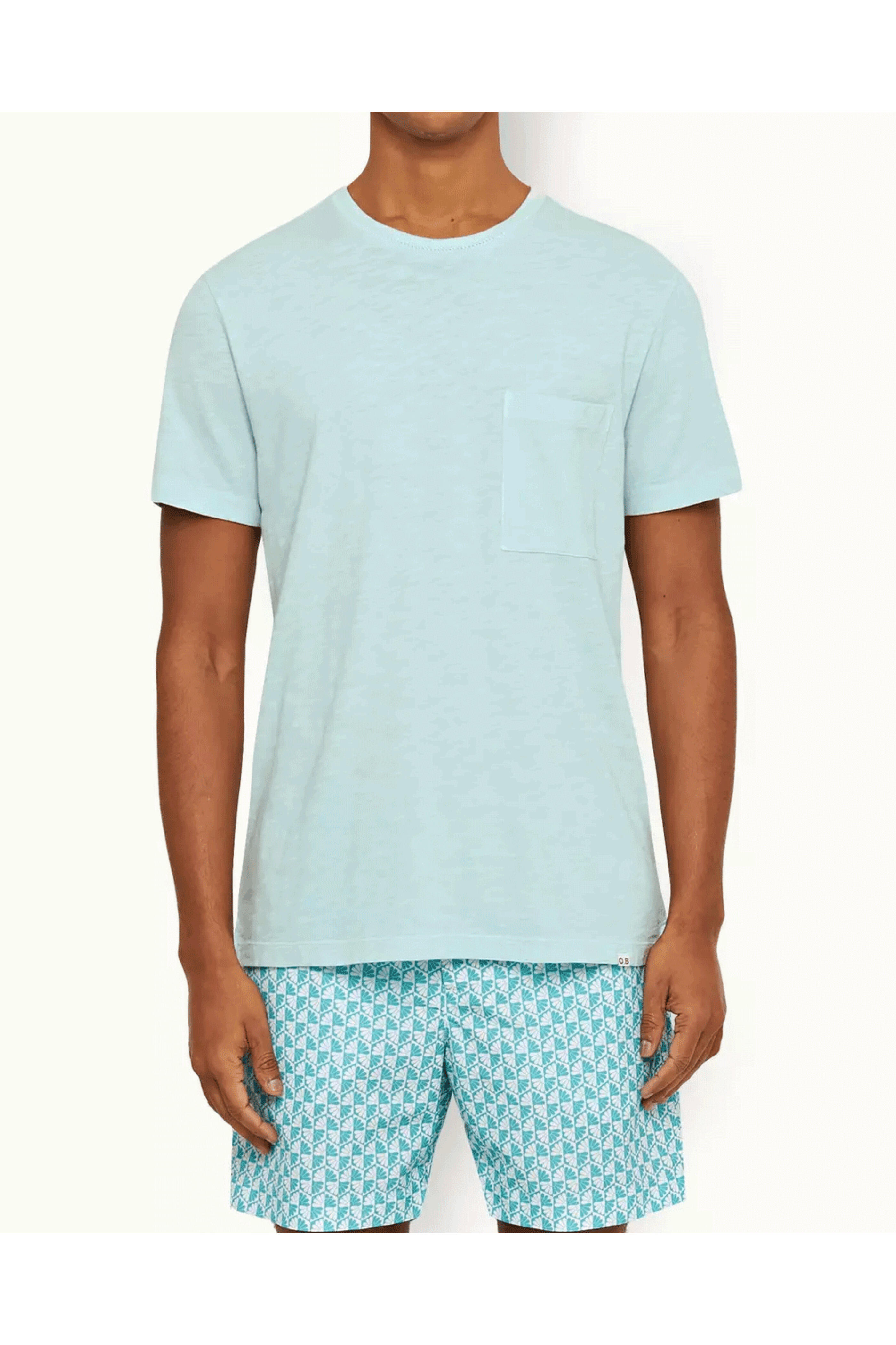 Orlebar Brown Clear Sky Classic T-Shirt. Crewneck. Short sleeves. Front left chest patch pocket. Ribbed neckline. Pullover style. Straight hem. Classic fit. 100% cotton.