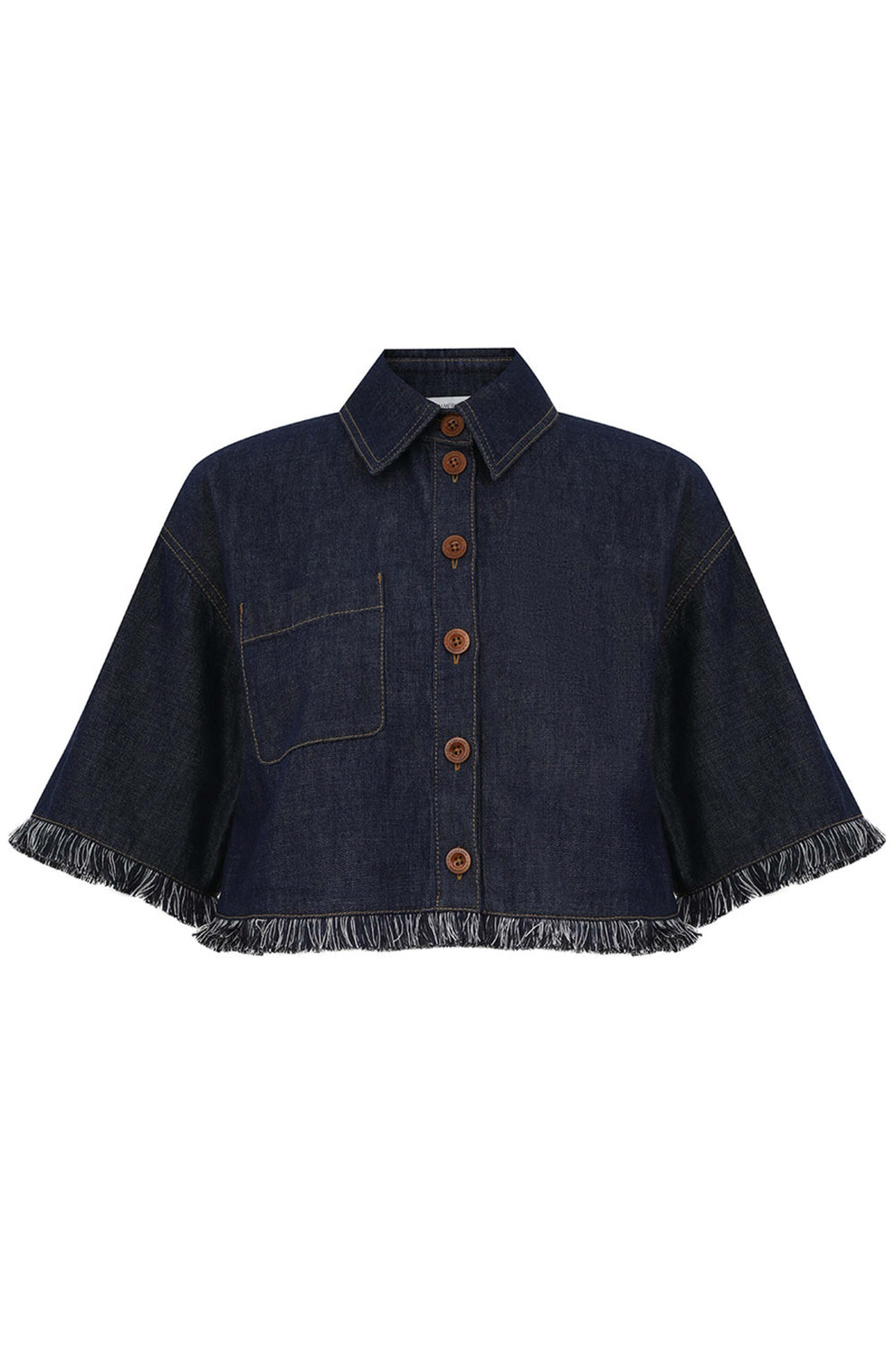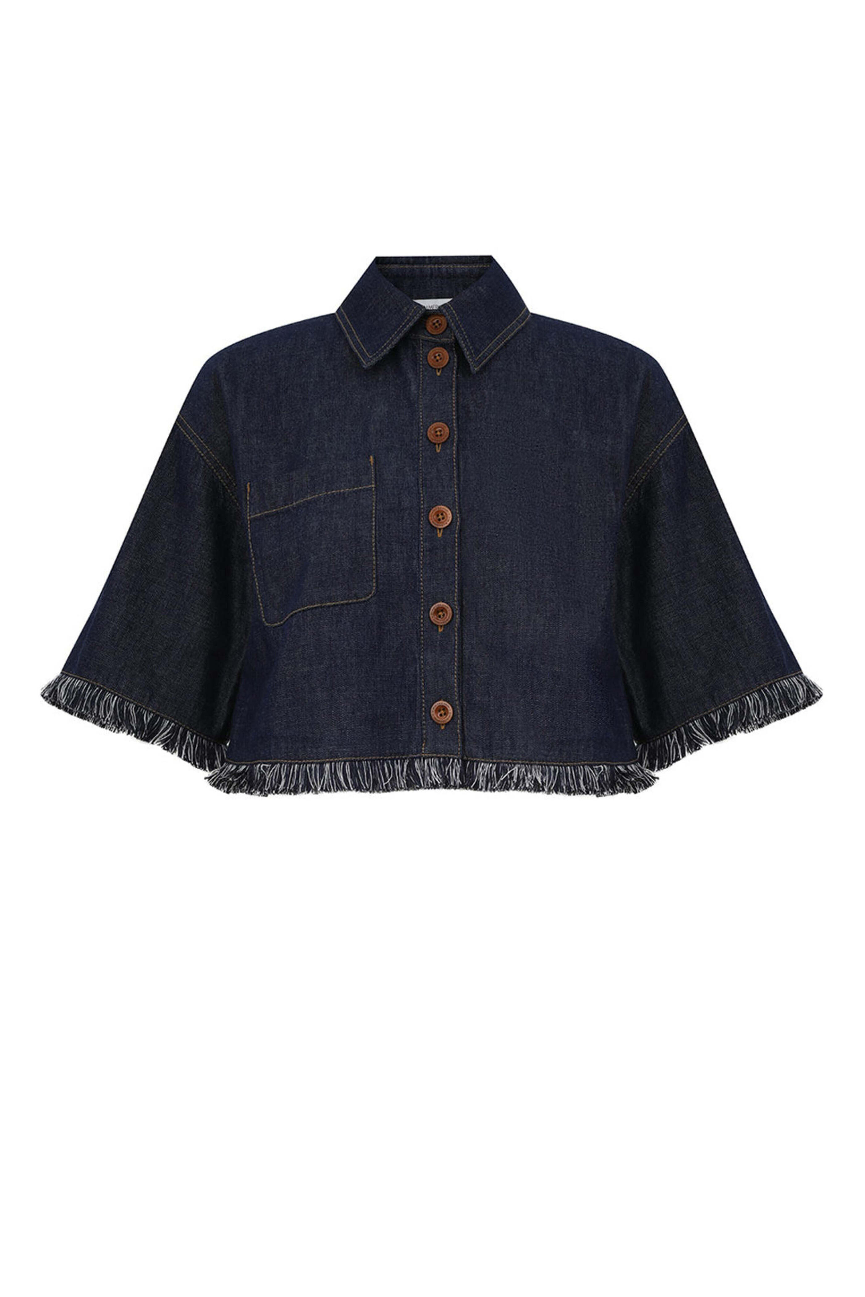 Spread collar. Drop shoulders; short sleeves. Button down front closure. Single chest patch pocket. Fringe trim detail. Denim fabrication. Imported. Boxy, cropped fit. 100% cotton. Dry clean.
