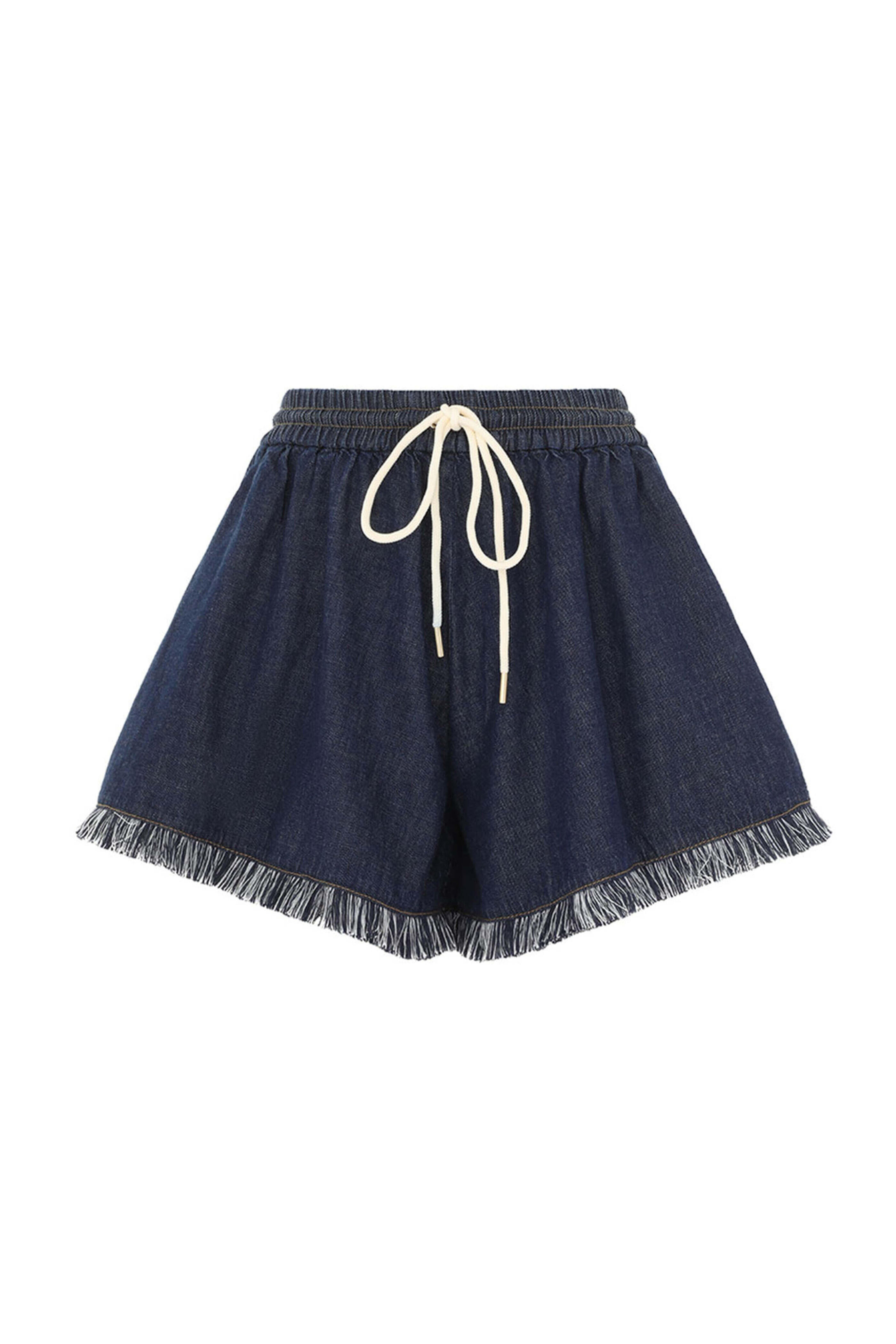 Elastic drawstring waist. Side slip pockets. Fringe trim detail. Denim fabrication. Imported. High rise. Wide through leg. 100% cotton. Dry clean.