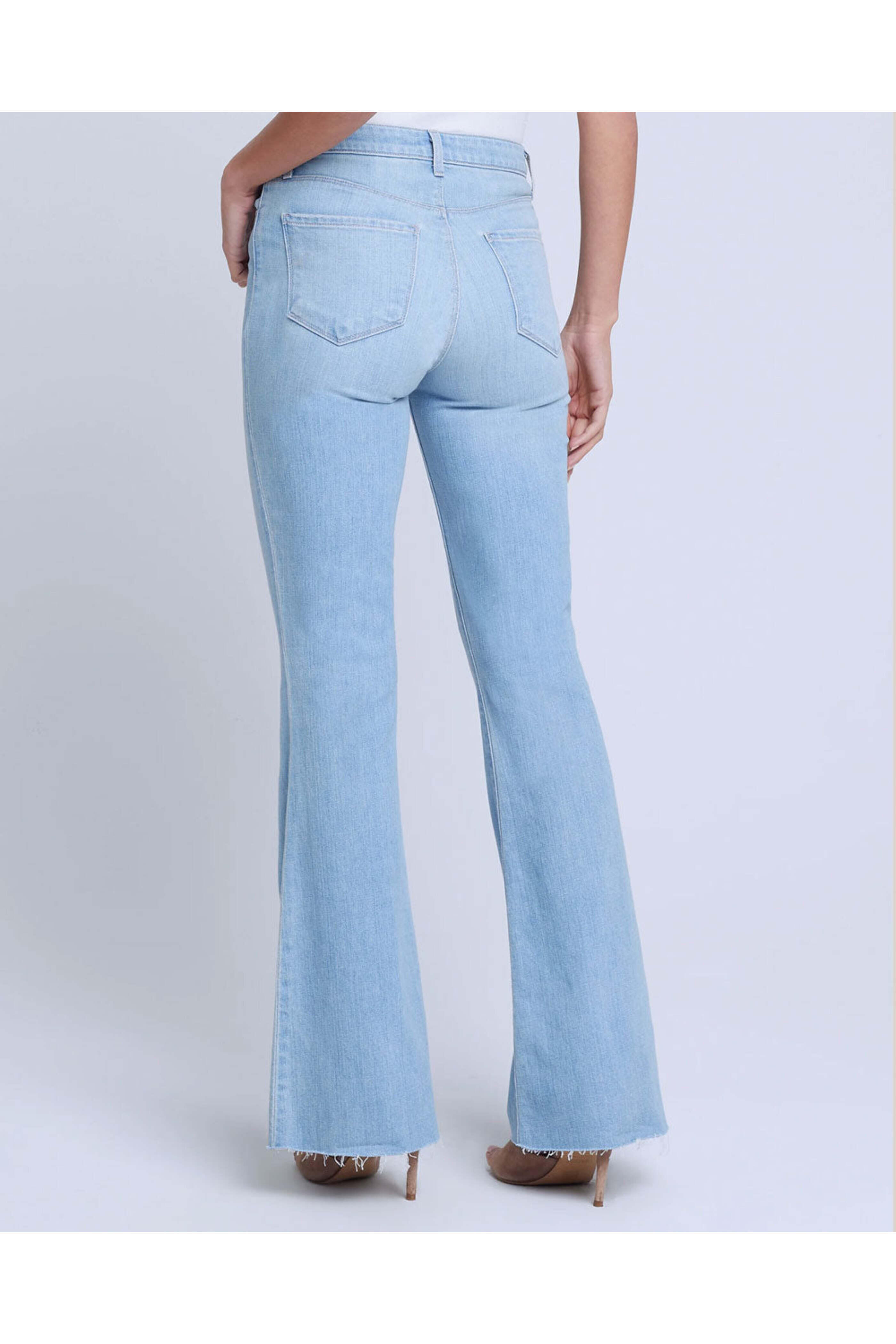 Mid rise . Belt loops . Zip fly . 5 pocket construction . Raw hem . Slim fit . 94% cotton 5% polyester 1% spandex .