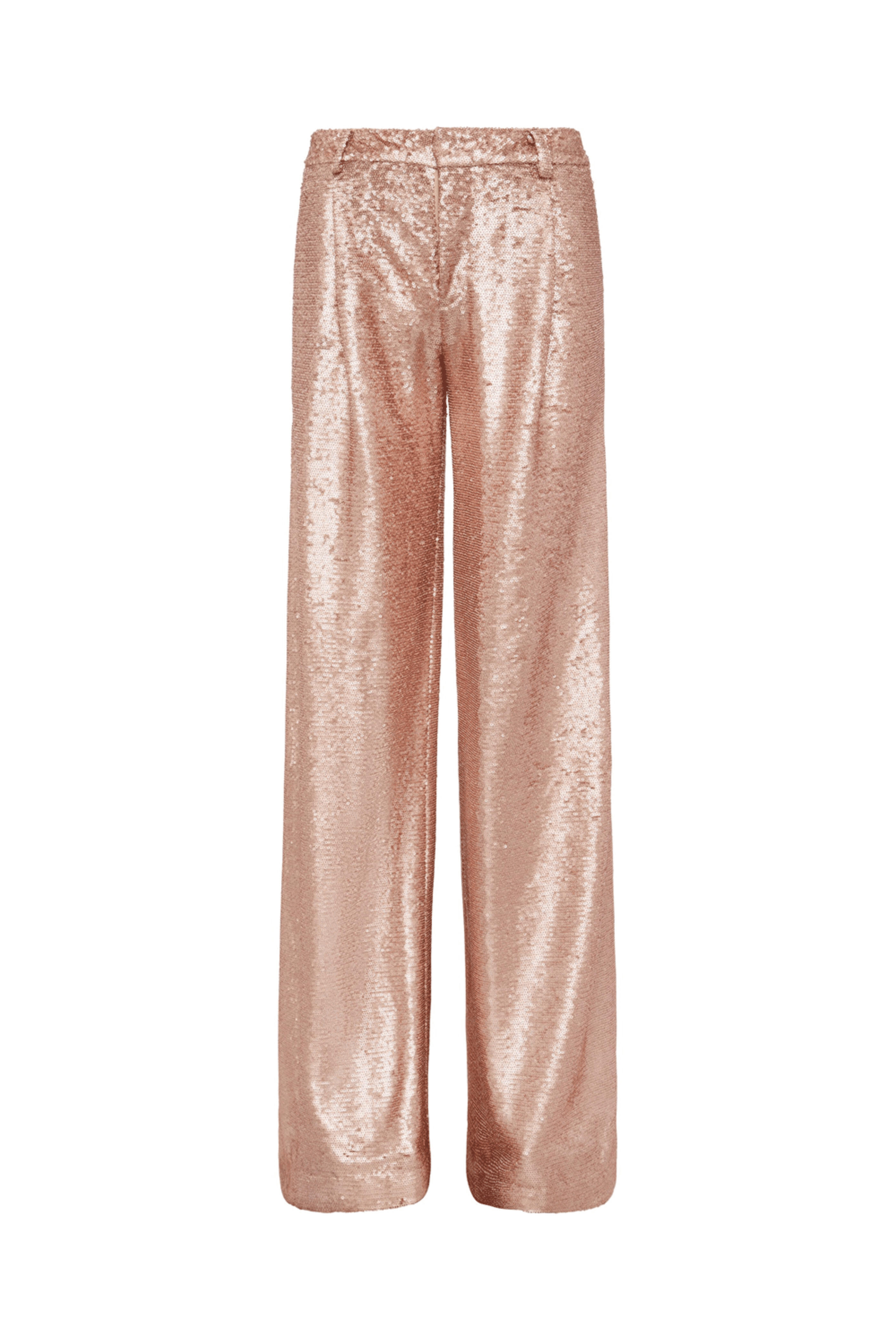 L'Agence Beige Sequin Allanah Trouser . Mid-rise . Zip fly . Hook and bar closure . Straight-leg . Side slant pockets . Back welt pockets . Sequined . Imported . 100% Polyester .