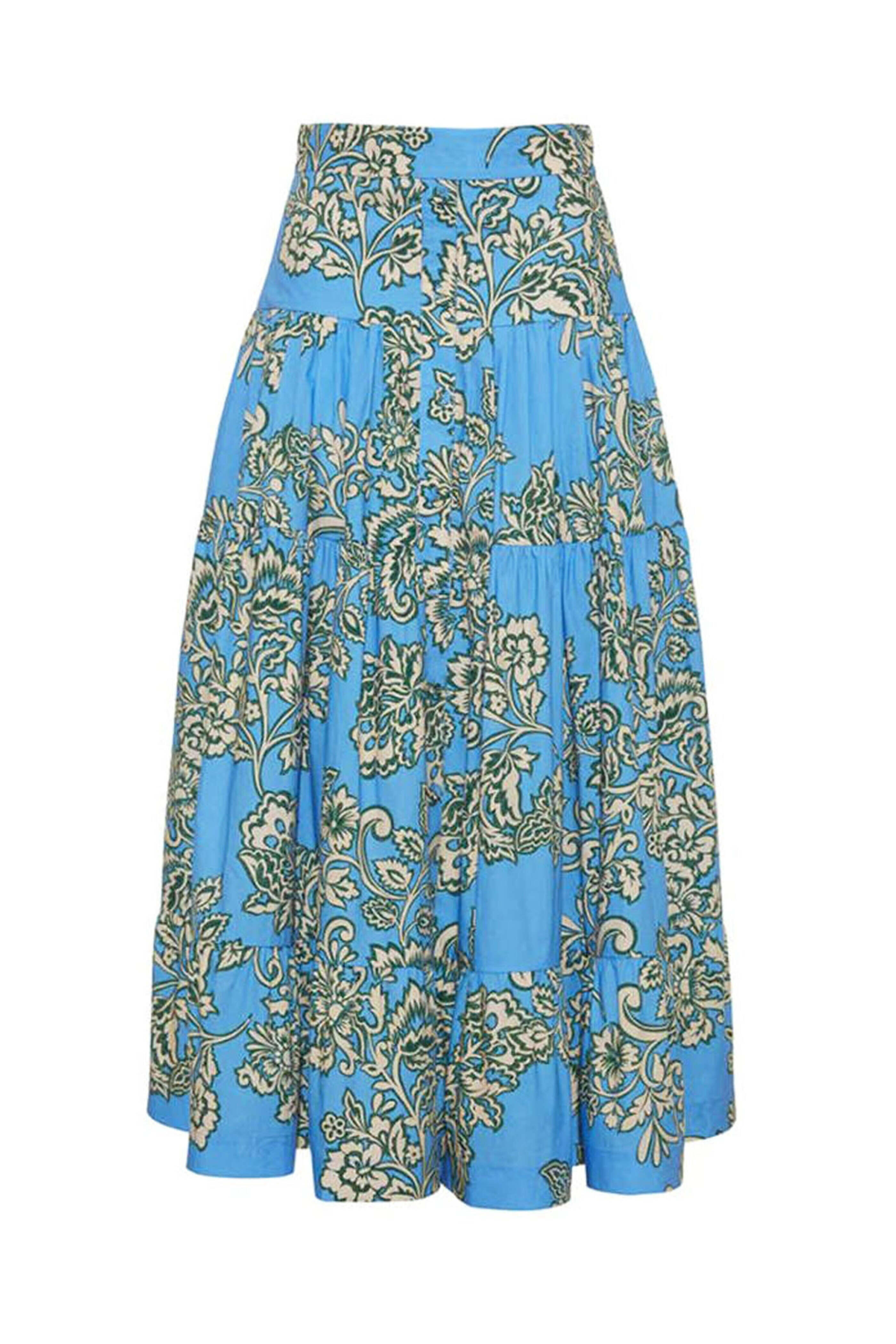 Cara Cara Herrington Blue Margarita Skirt. High rise. Flat waistband. Concealed back zip closure. Tiered aline silhouette. Midi length. 100% cotton.