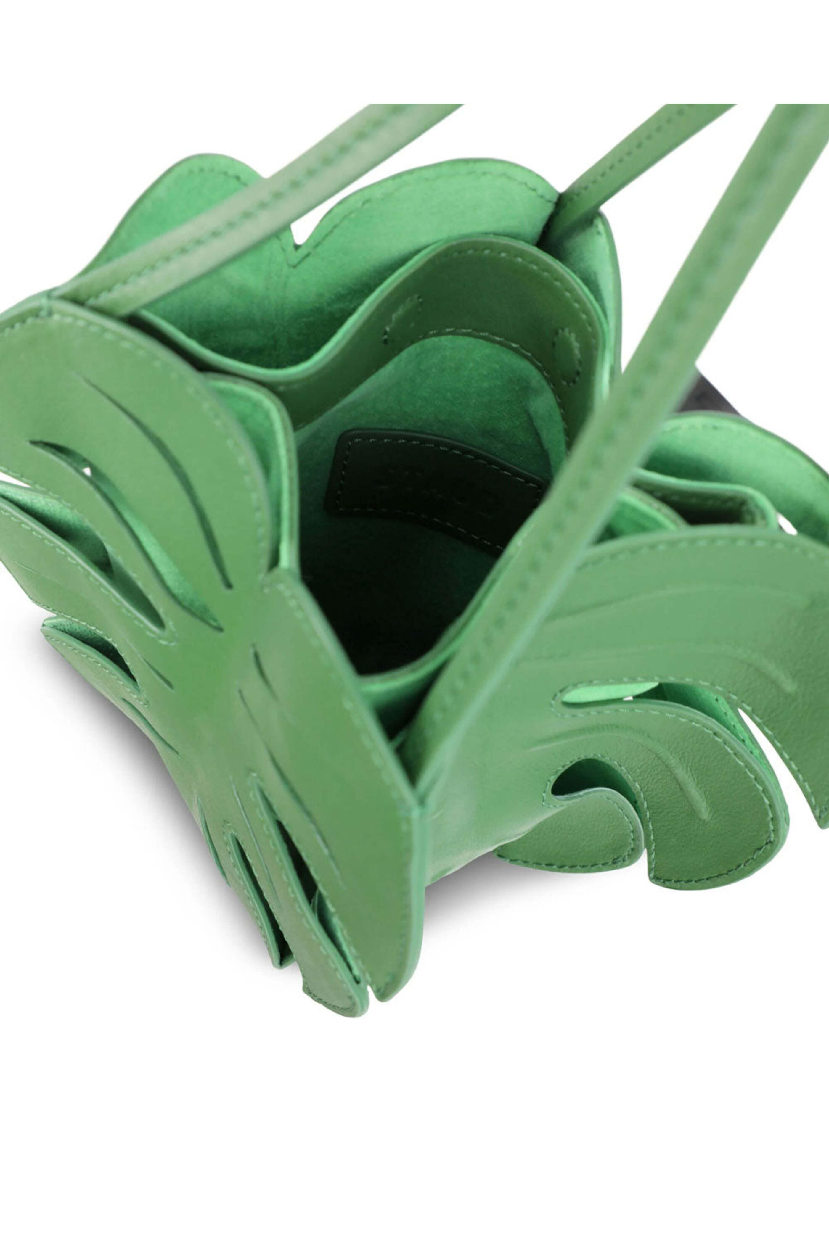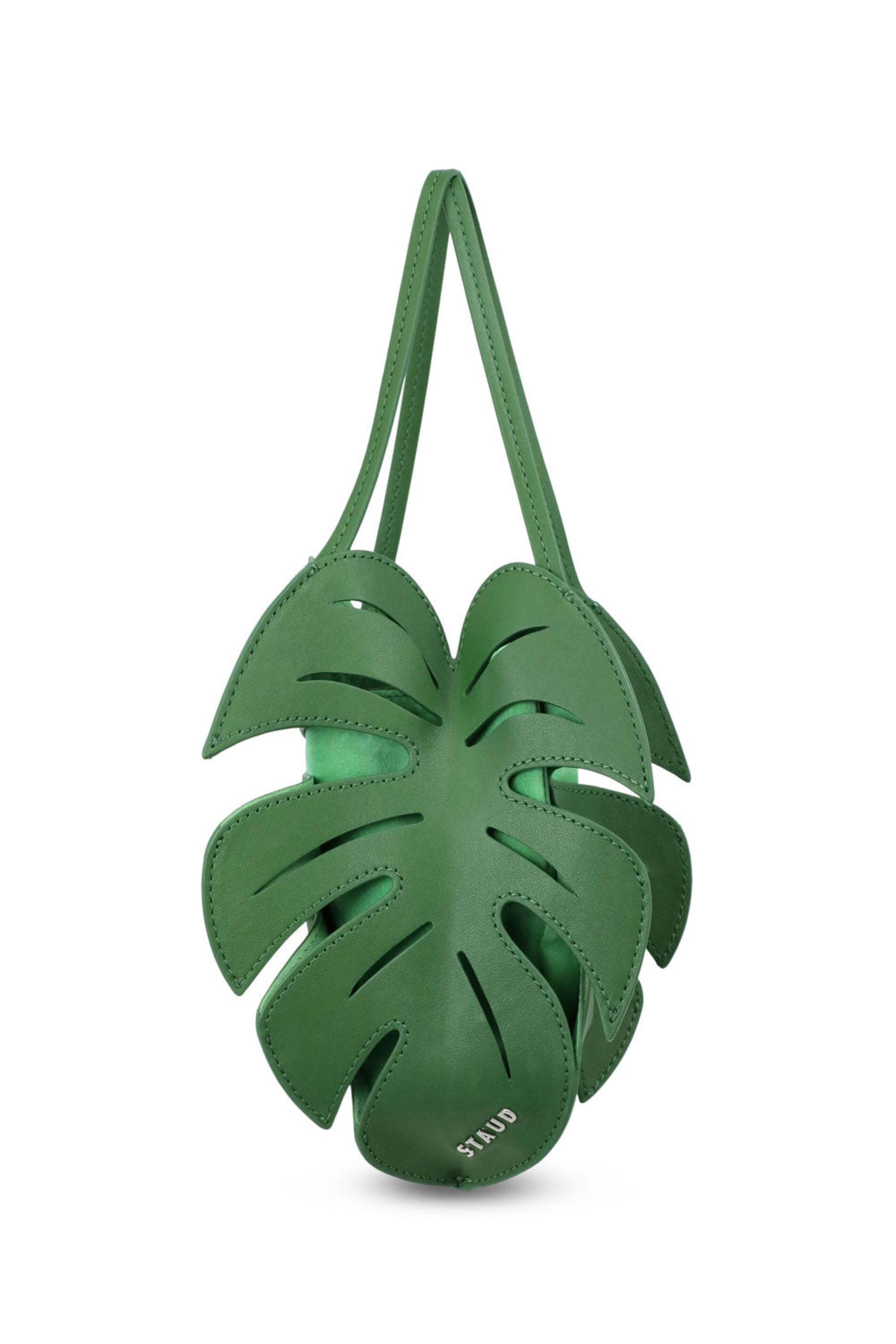 Staud Palm Bucket Bag in Leaf. Magnetic closure. Two top handles. Cut-out detailing. Main compartment. Leather outer. Suede lining. 6W x 8.75H x 6D. 4.75 strap drop.