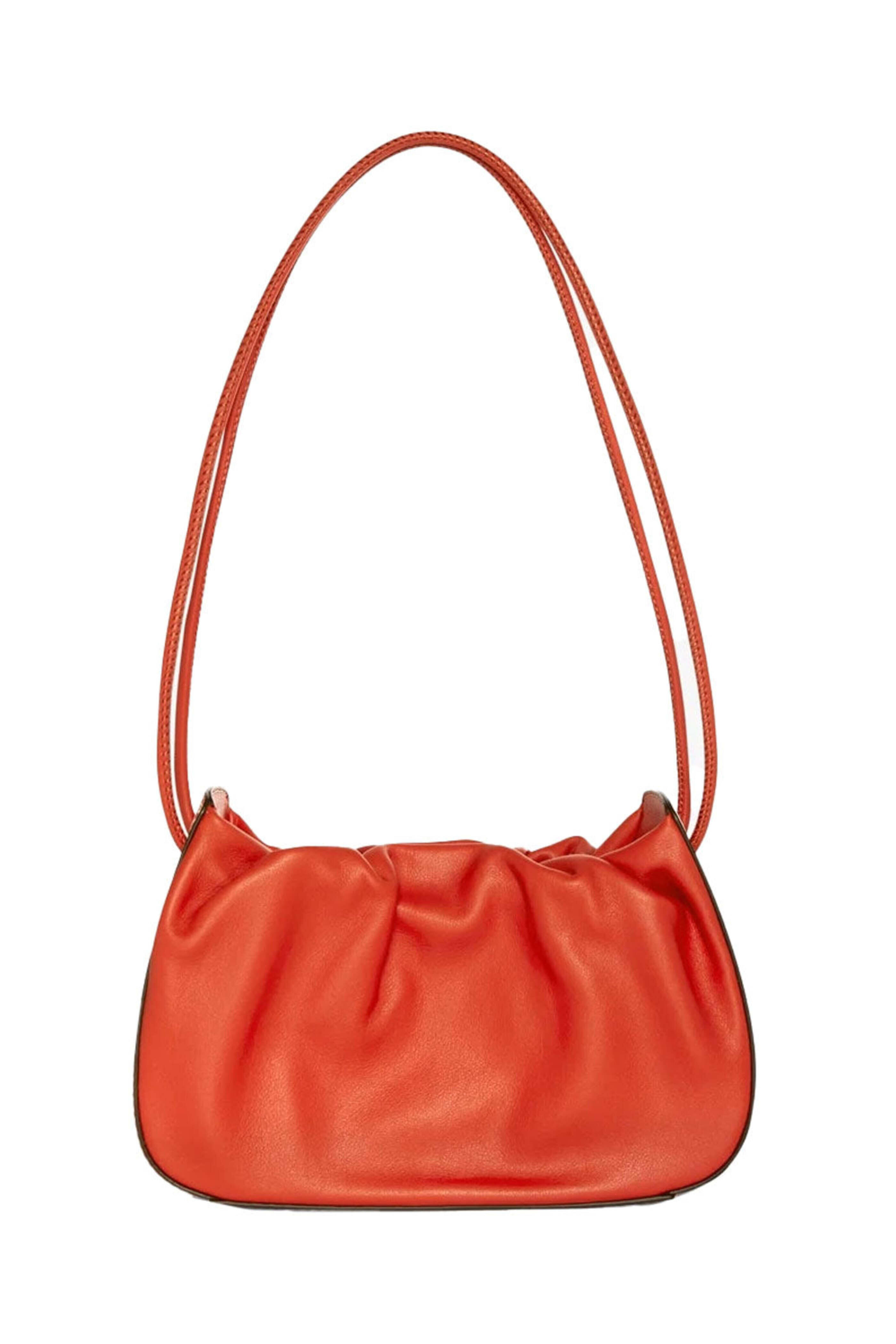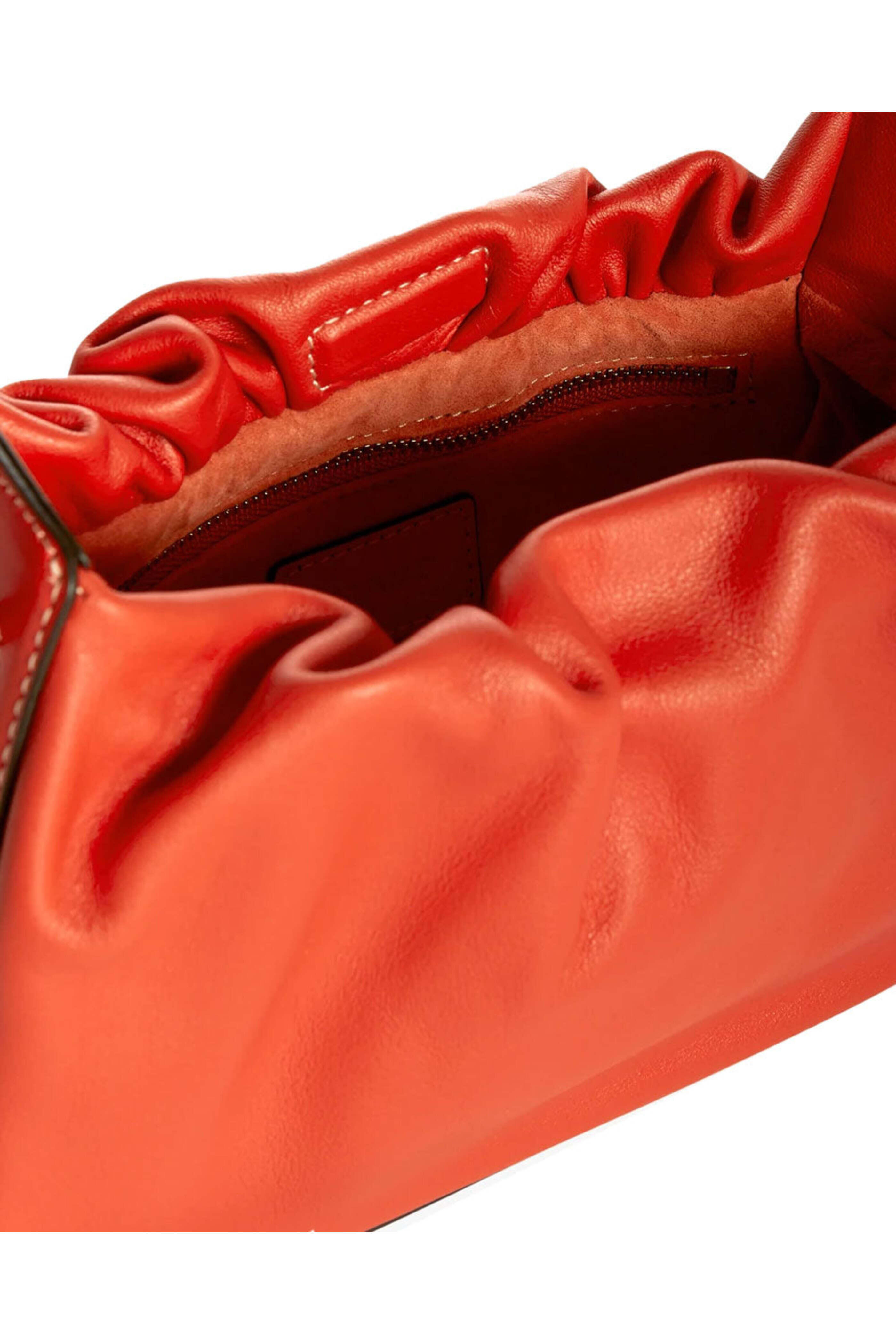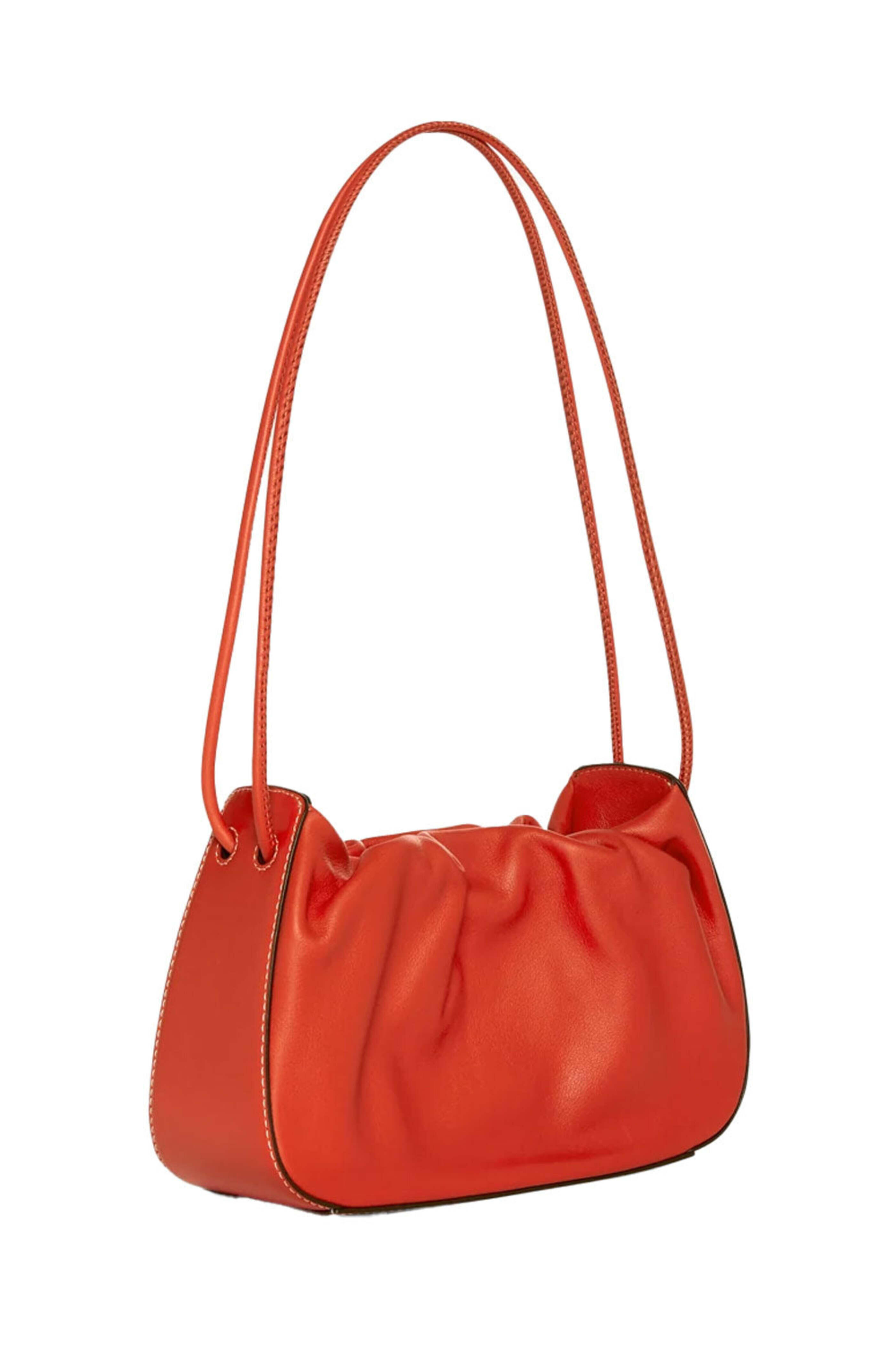 STAUD Kiki Shoulder Bag in Blood Orange. Ruched top with magnetic closure. Two thin leather shoulder straps. Interior zip pocket. Contrast stitching. Nappa leather. Suede lining. 9.5 W X 5.5 H X 3.5 D. 10.5 handle drop.