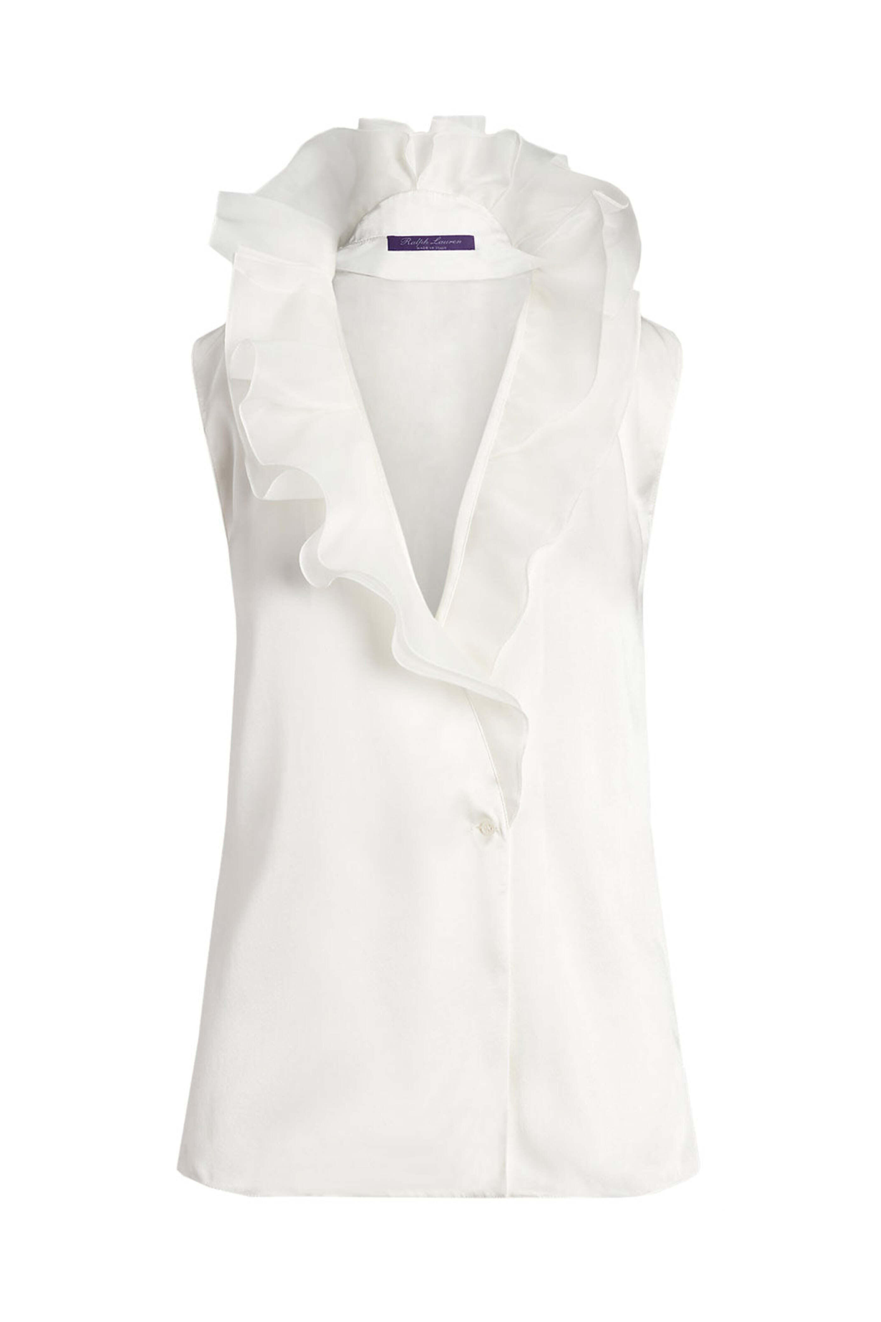 Ralph Lauren Off White Carlynn Shirt. Deep v neck. Ruffle collar detail. Sleeveless. Button front closure. Relaxed fit. Straight hem. Made in Italy. 100% mulberry silk.