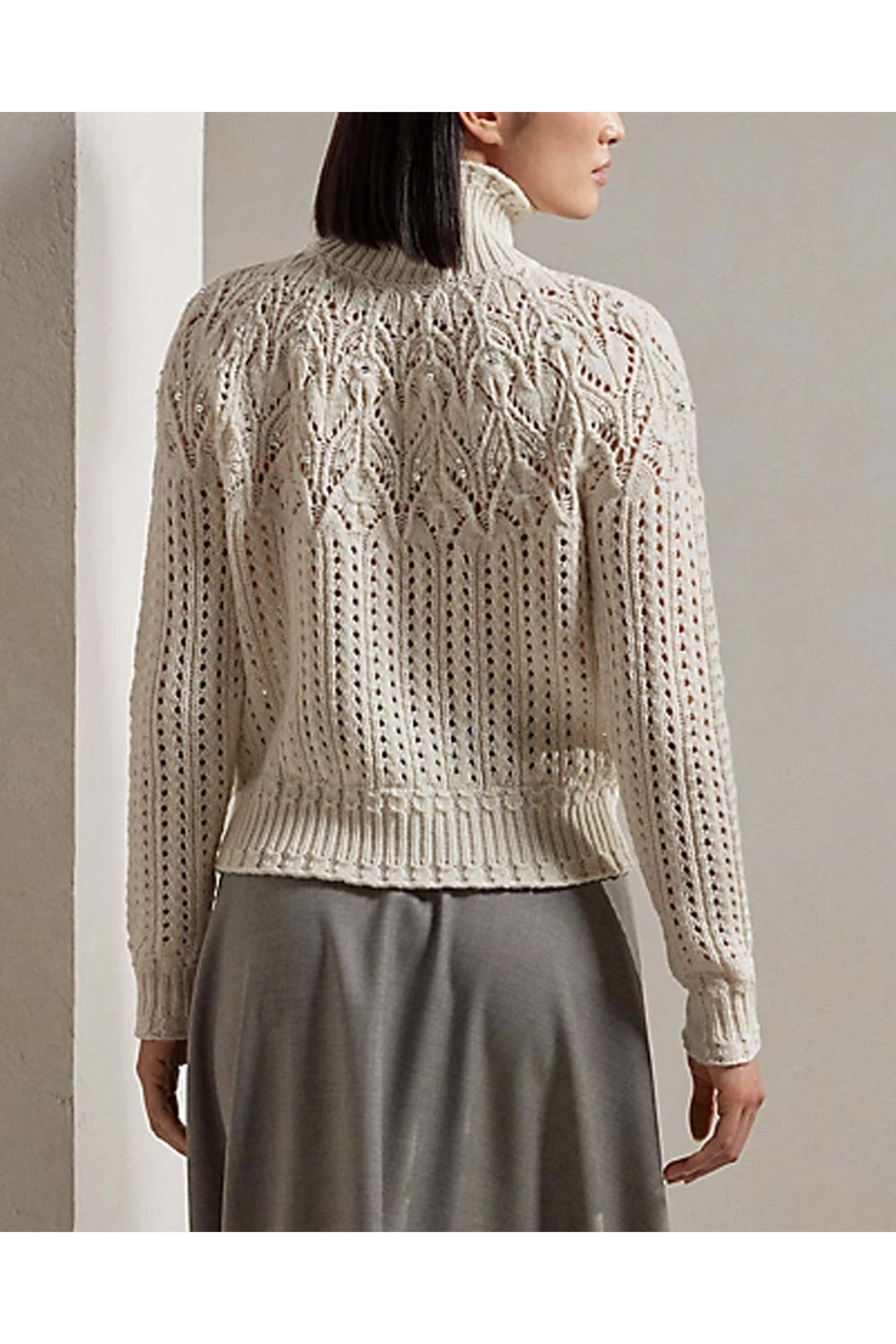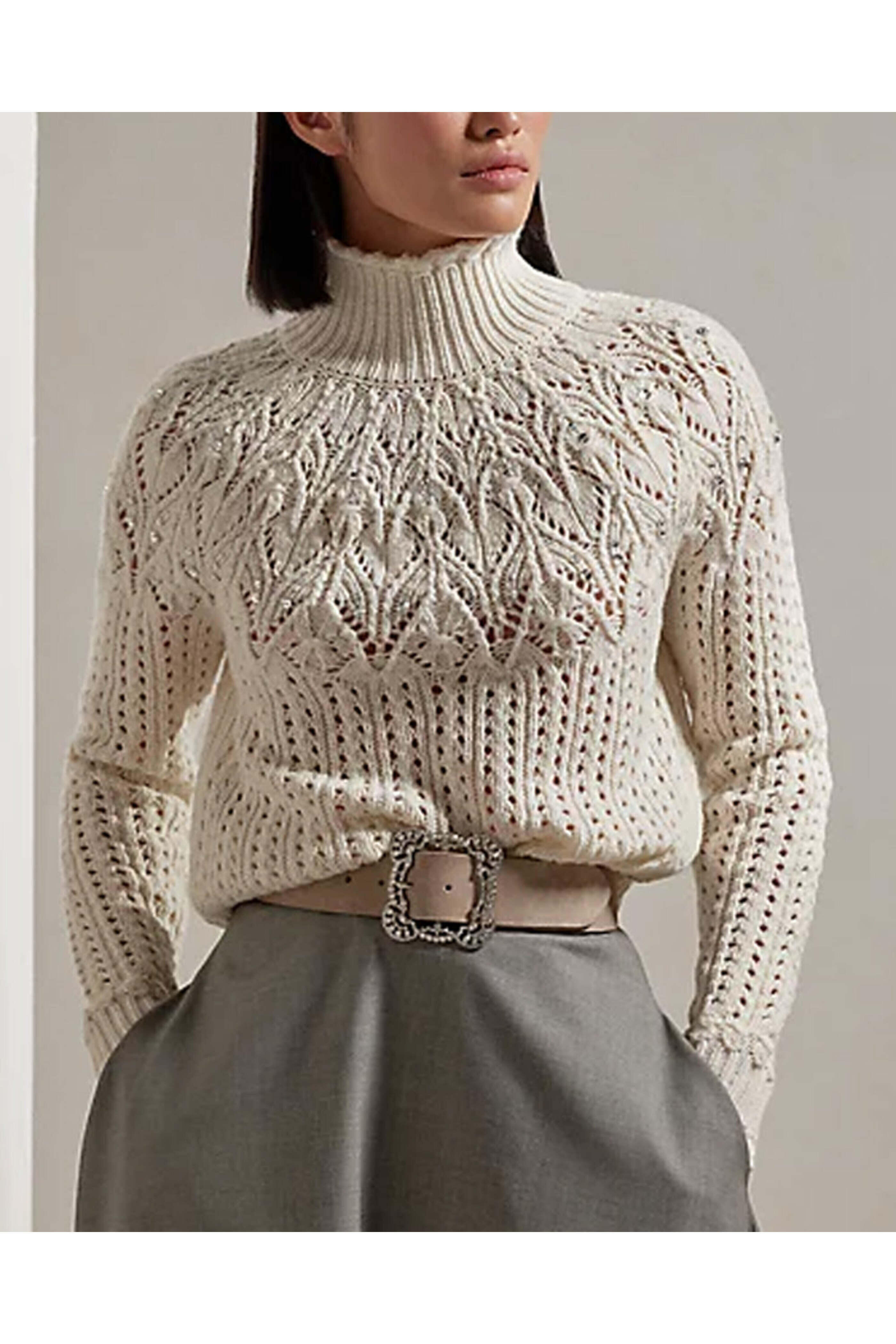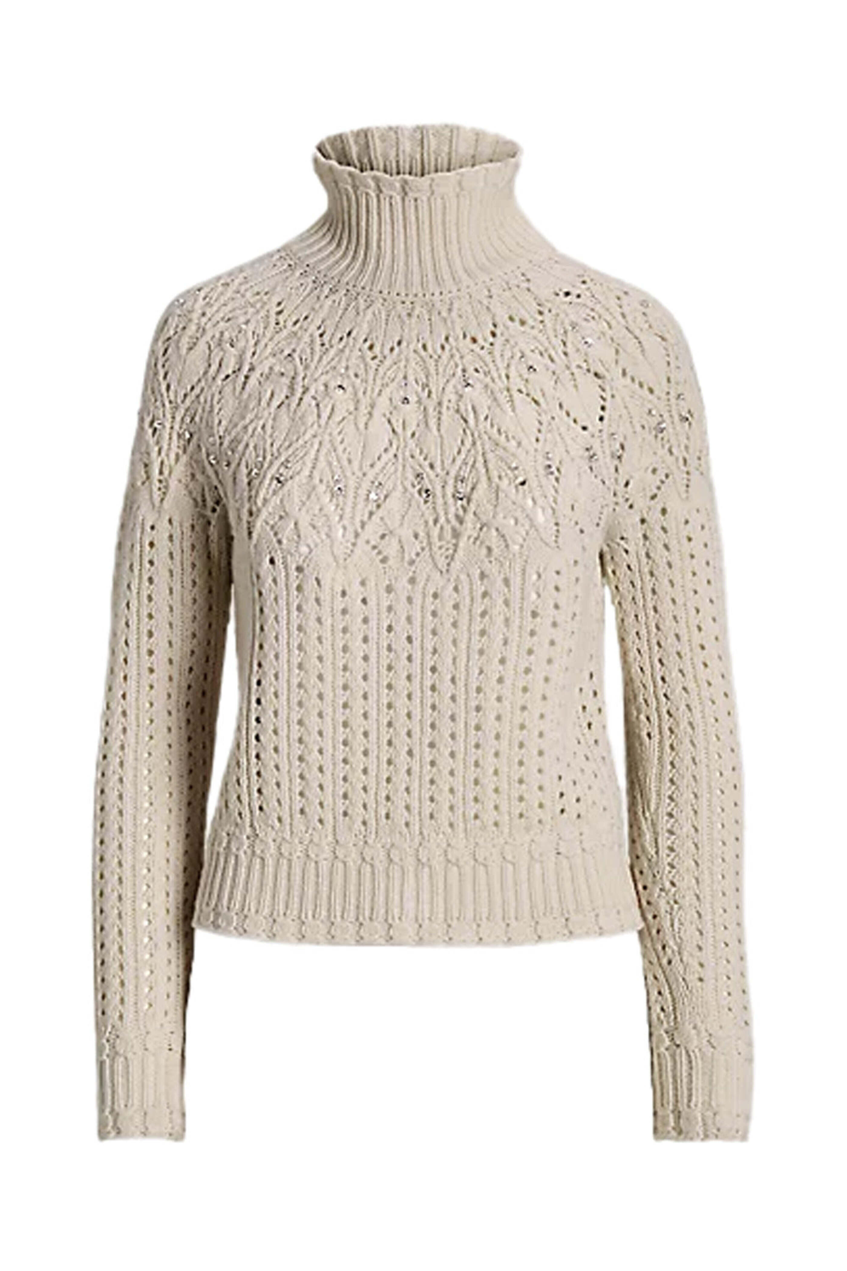 Ralph Lauren Cream Embellished Long Sleeve Turtleneck. Turtleneck. Long sleeves. Regular fit. Pointelle knit fabrication. Wool, cashmere.