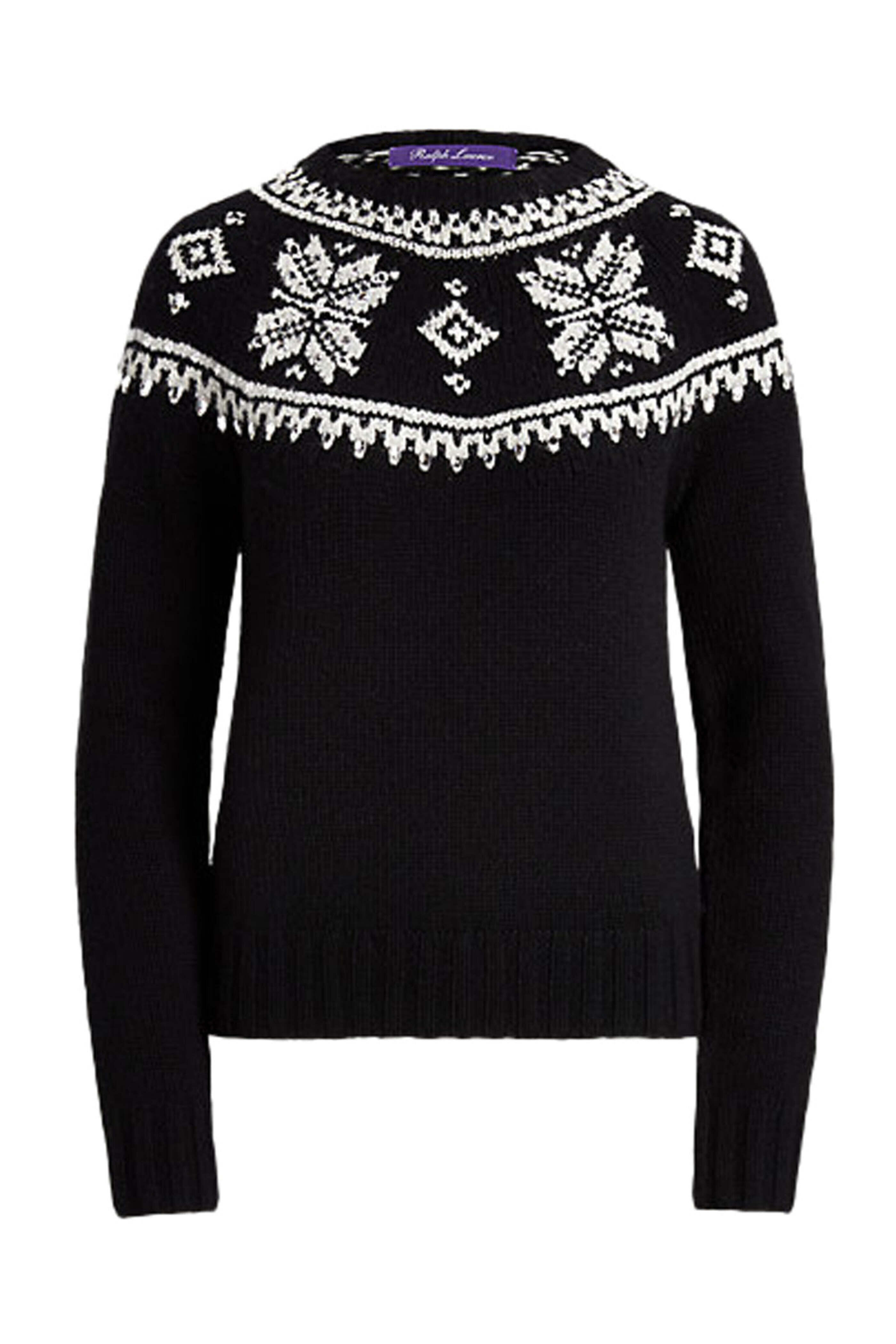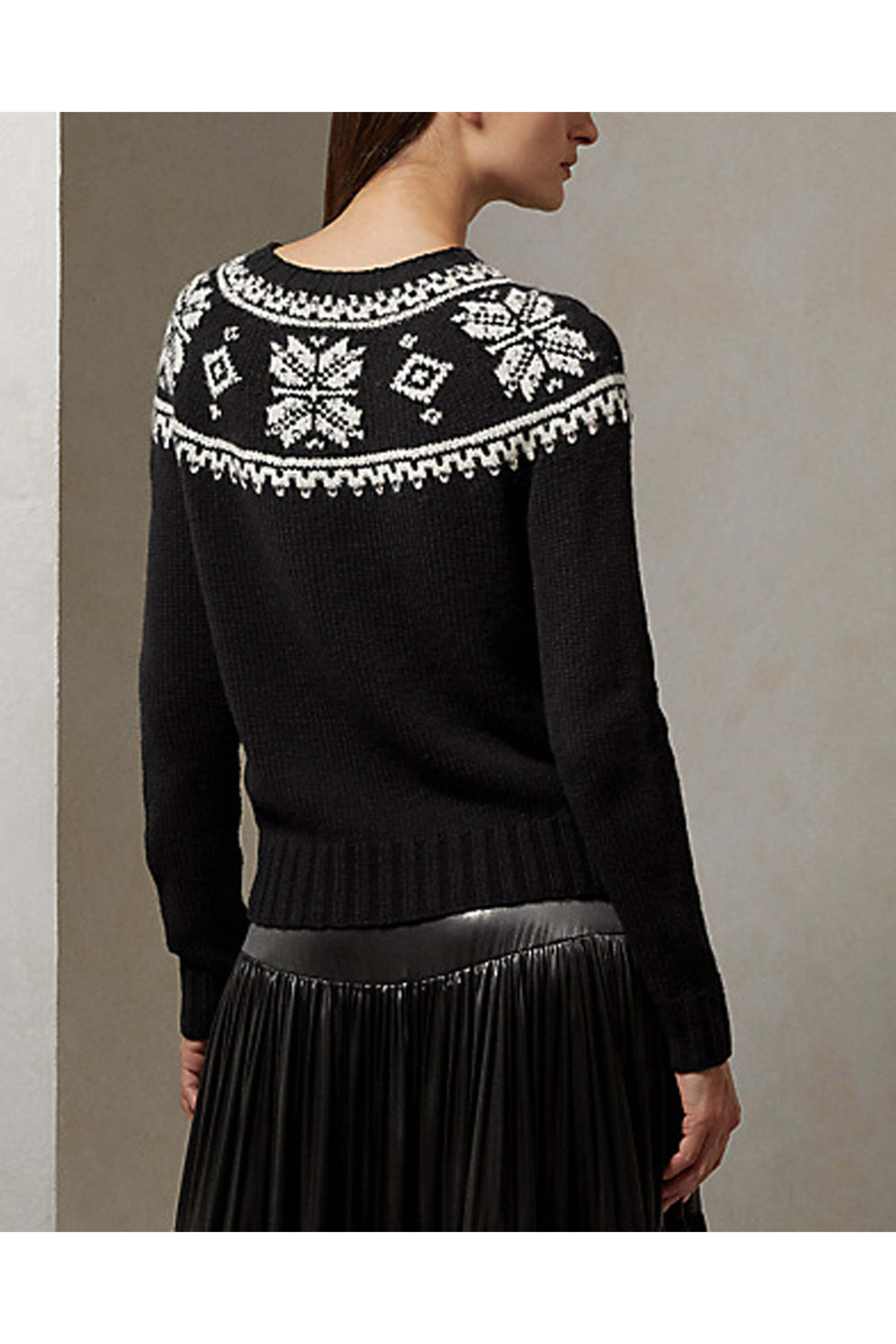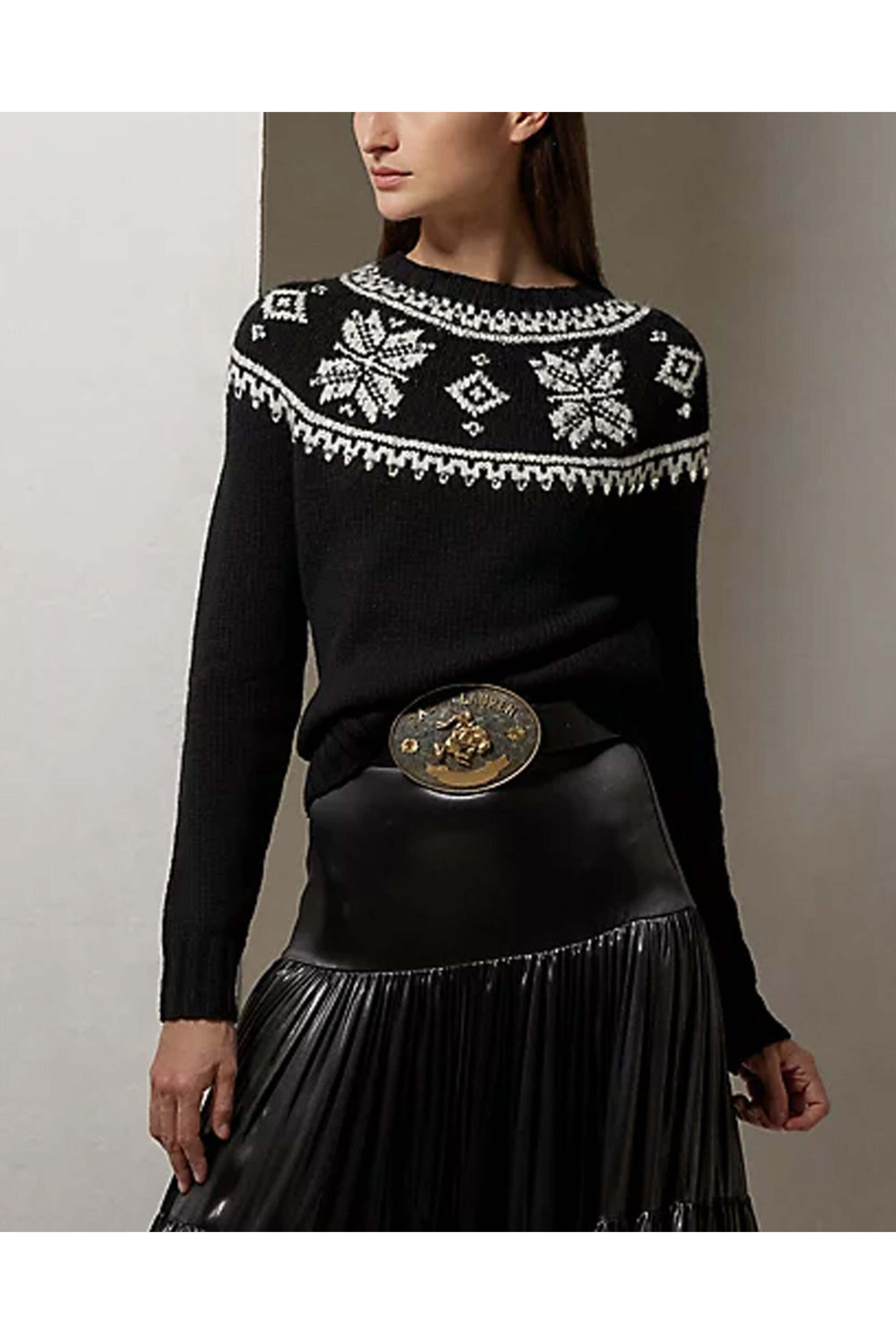 Ralph Lauren Black And Cream Embellished Crewneck Sweater. Round neck. Long sleeves. Relaxed fit. Fair Isle knit fabrication. Cashmere.
