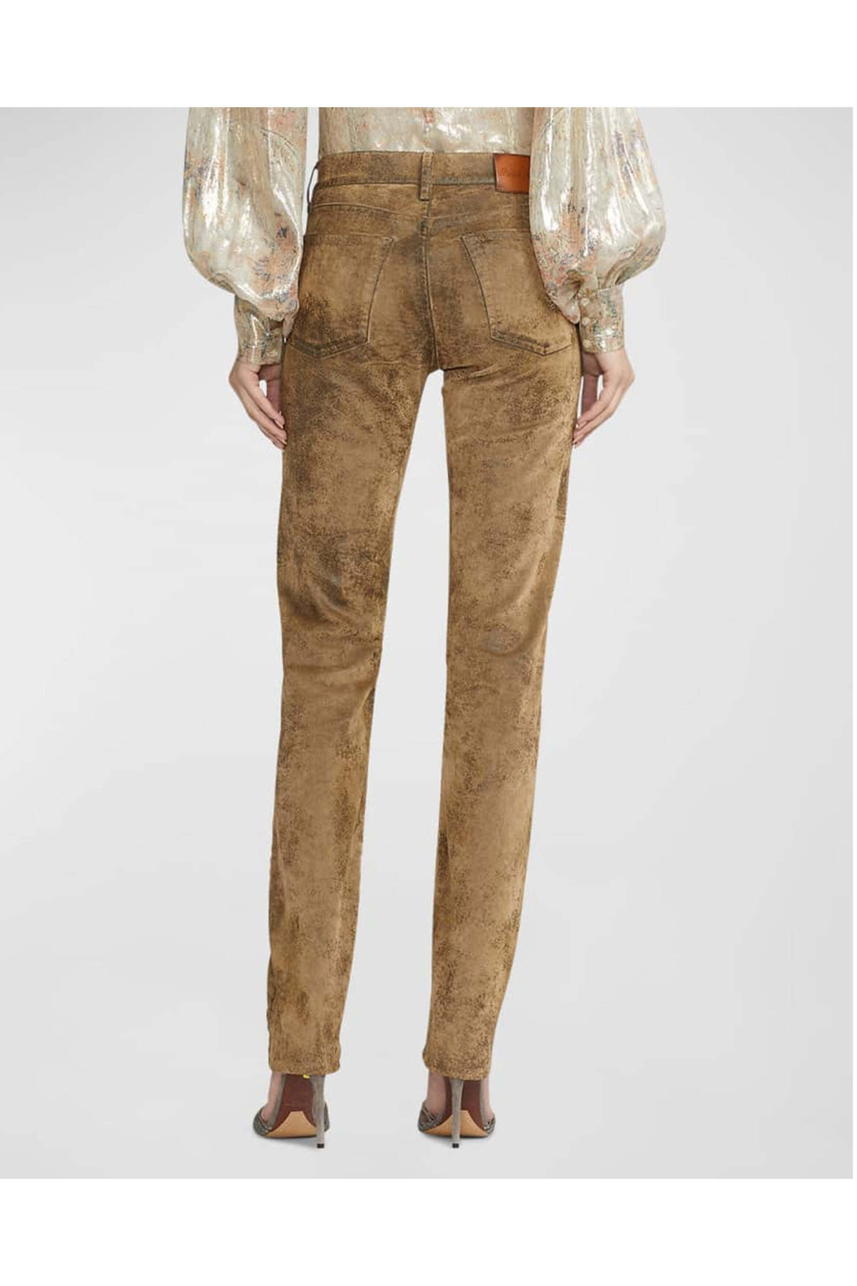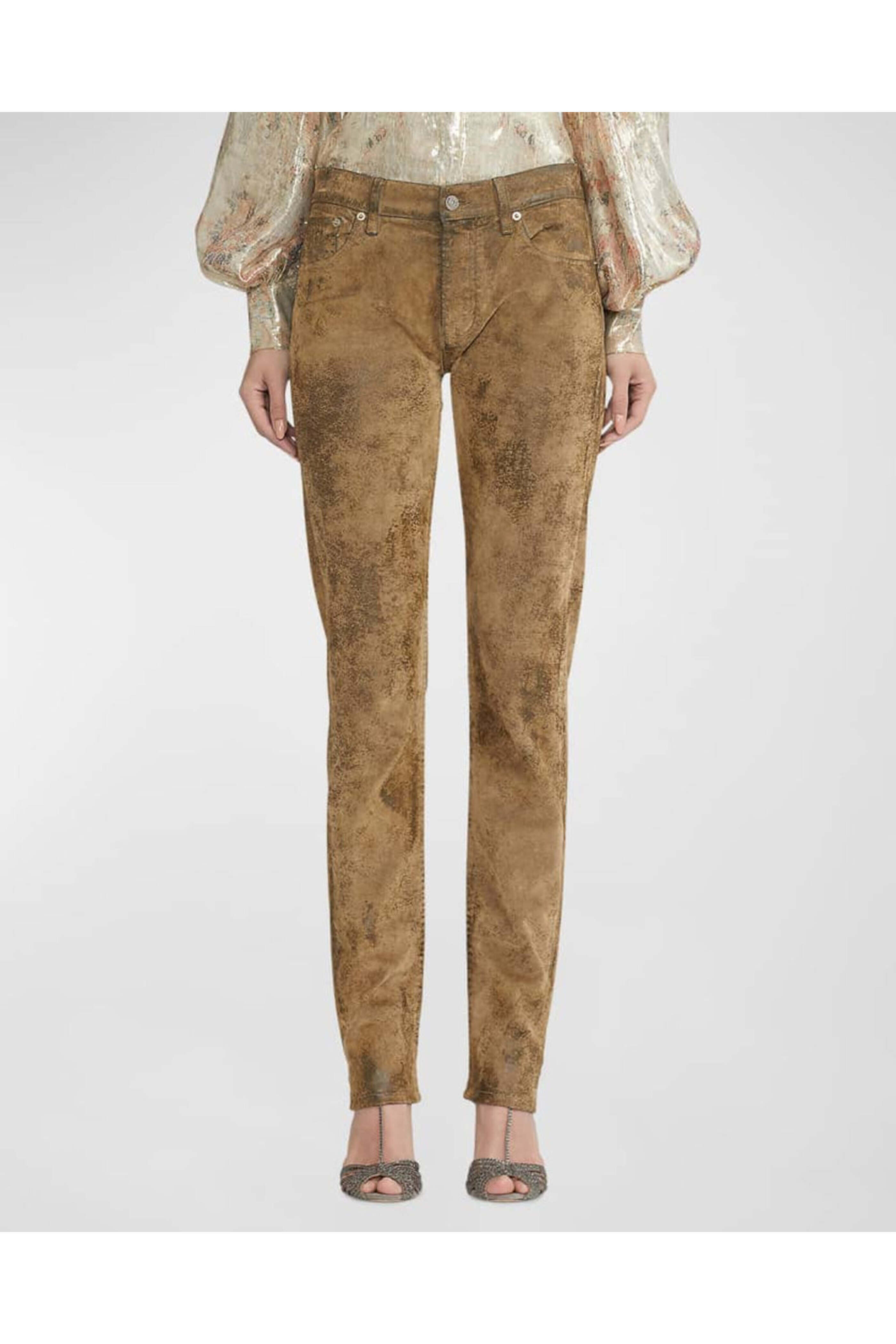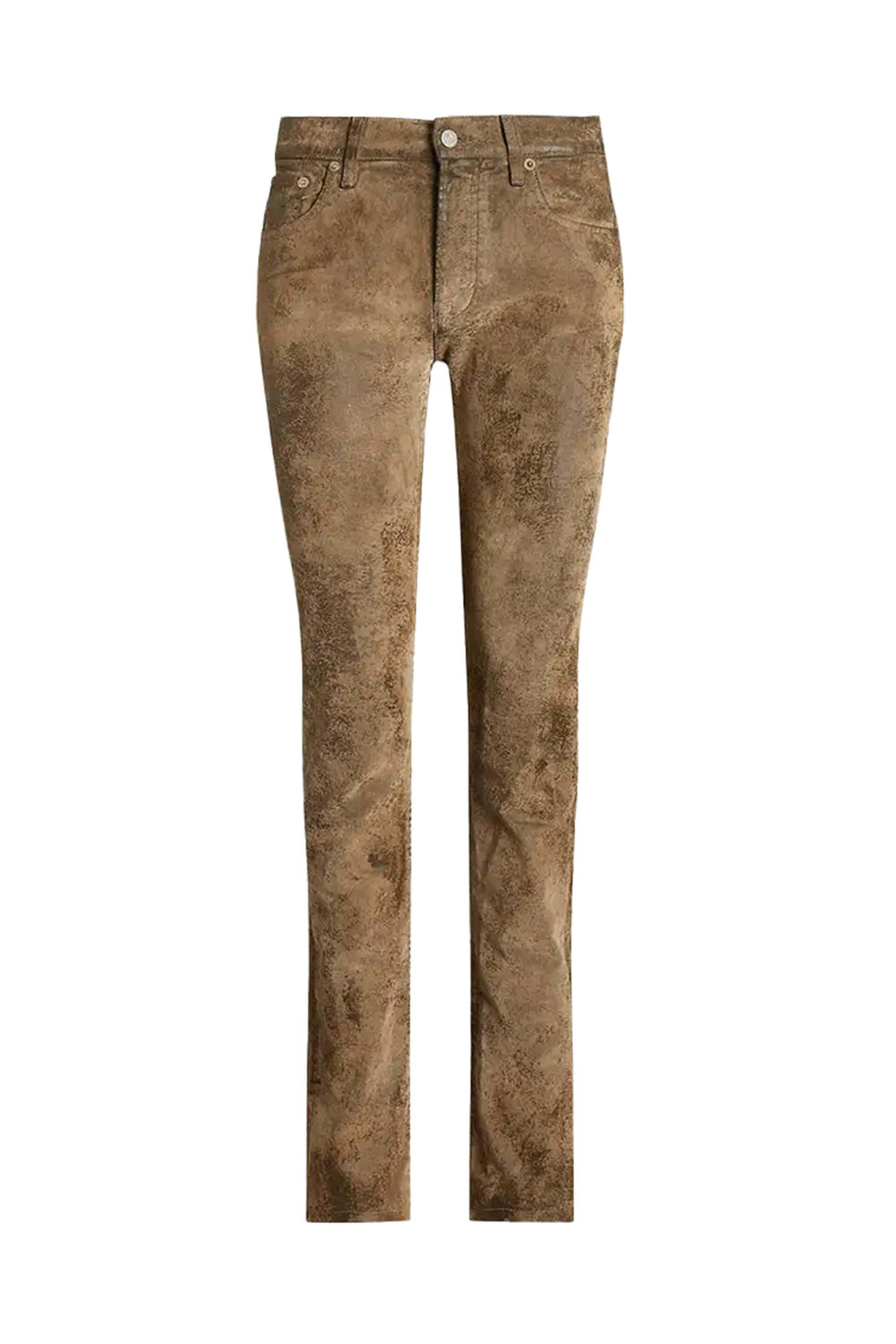 Ralph Lauren Tan Quartz Straight Ankle Jean. Mid rise. Button closure. Zip fly. Belt loops. Five pocket style. Straight through leg. Full length. Flocked matte coating throughout. Cotton, viscose, elastane.