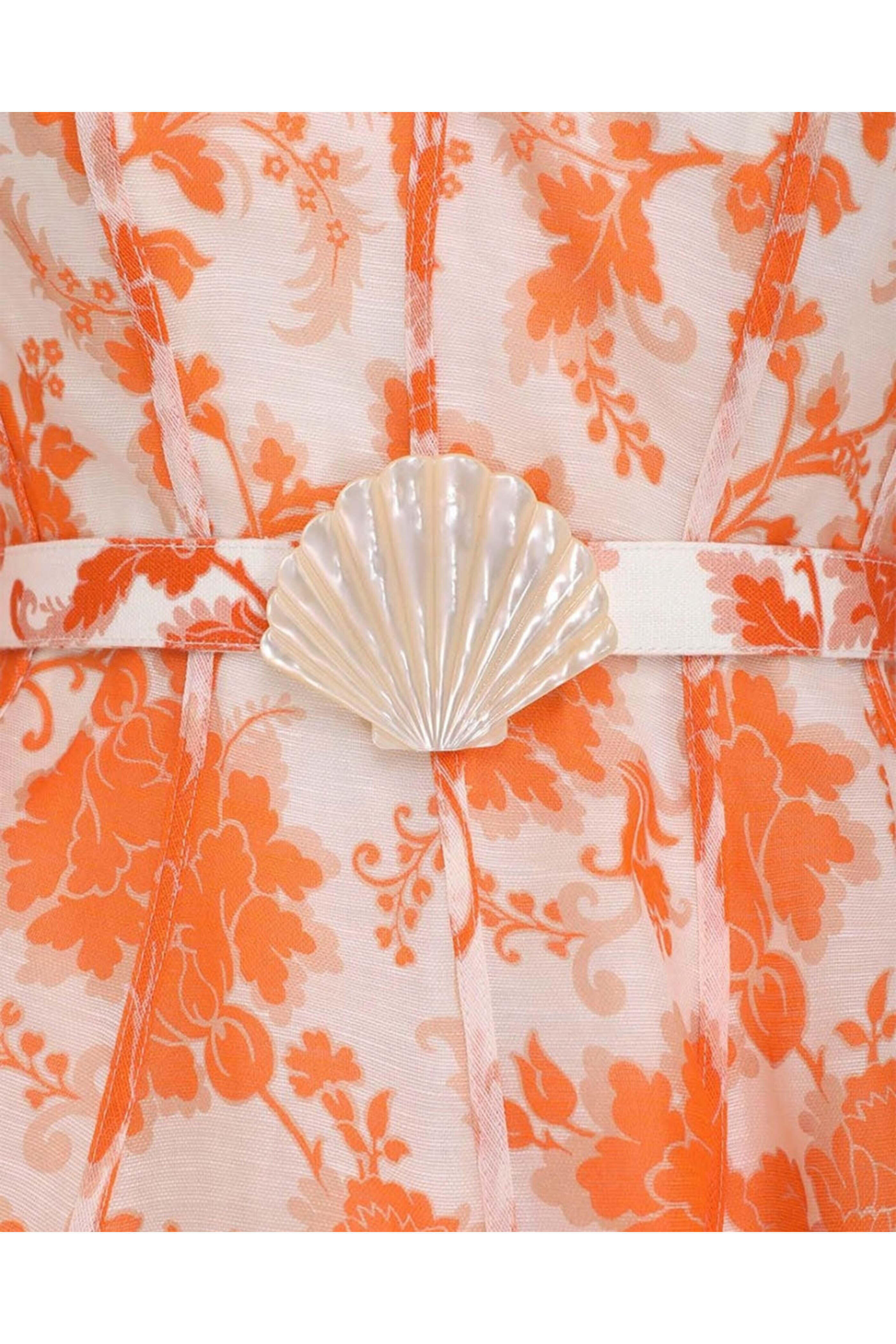 Zimmermann Orange Floral Puff Sleeve Mini Dress. V neck. Short puff sleeves; elastic cuffs. Concealed back zip closure. Removable belt at waist; shell detail and adjustable buckle. Fitted bodice; flared hem. Mini length. Silk linen organza fabrication. Lined. 51% linen, 49% silk outer, 100% silk lining 1, 100% cotton lining 2.