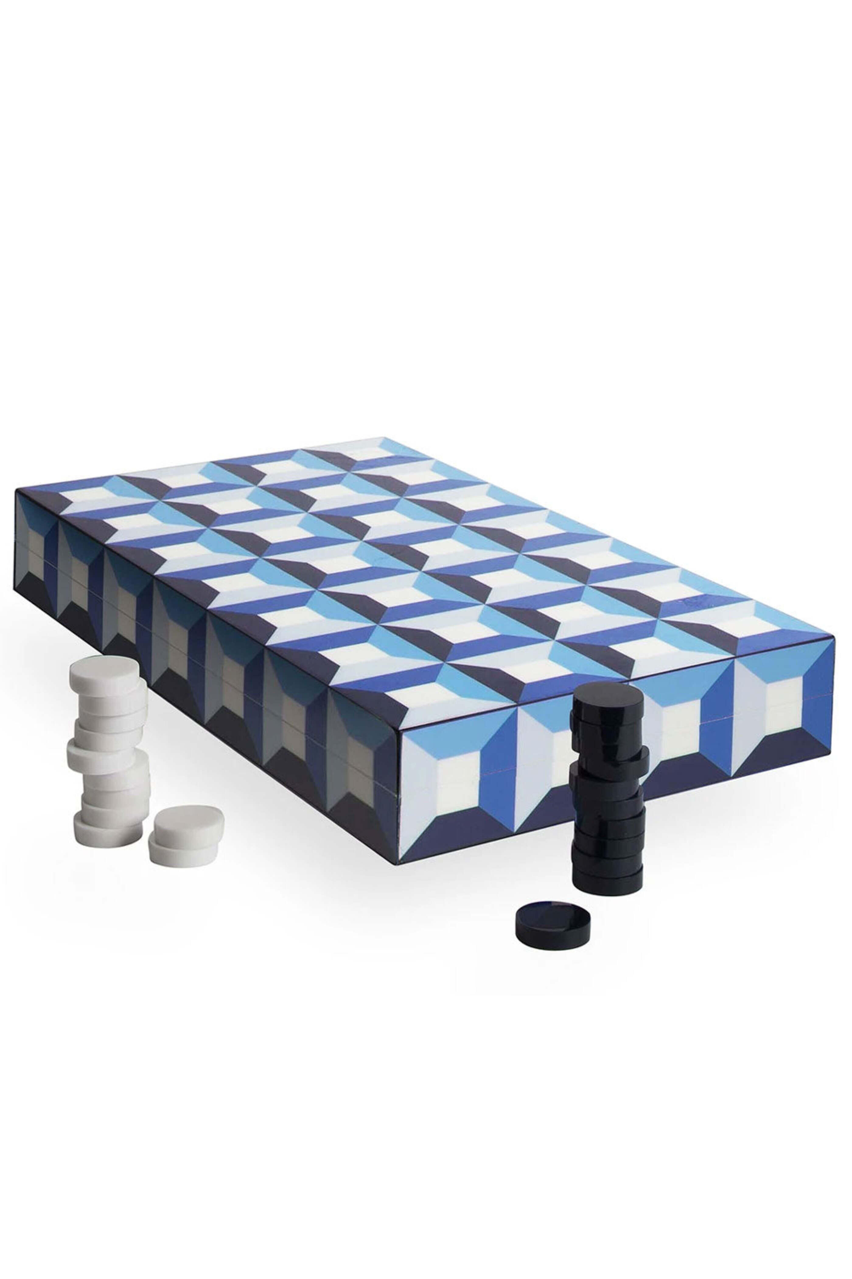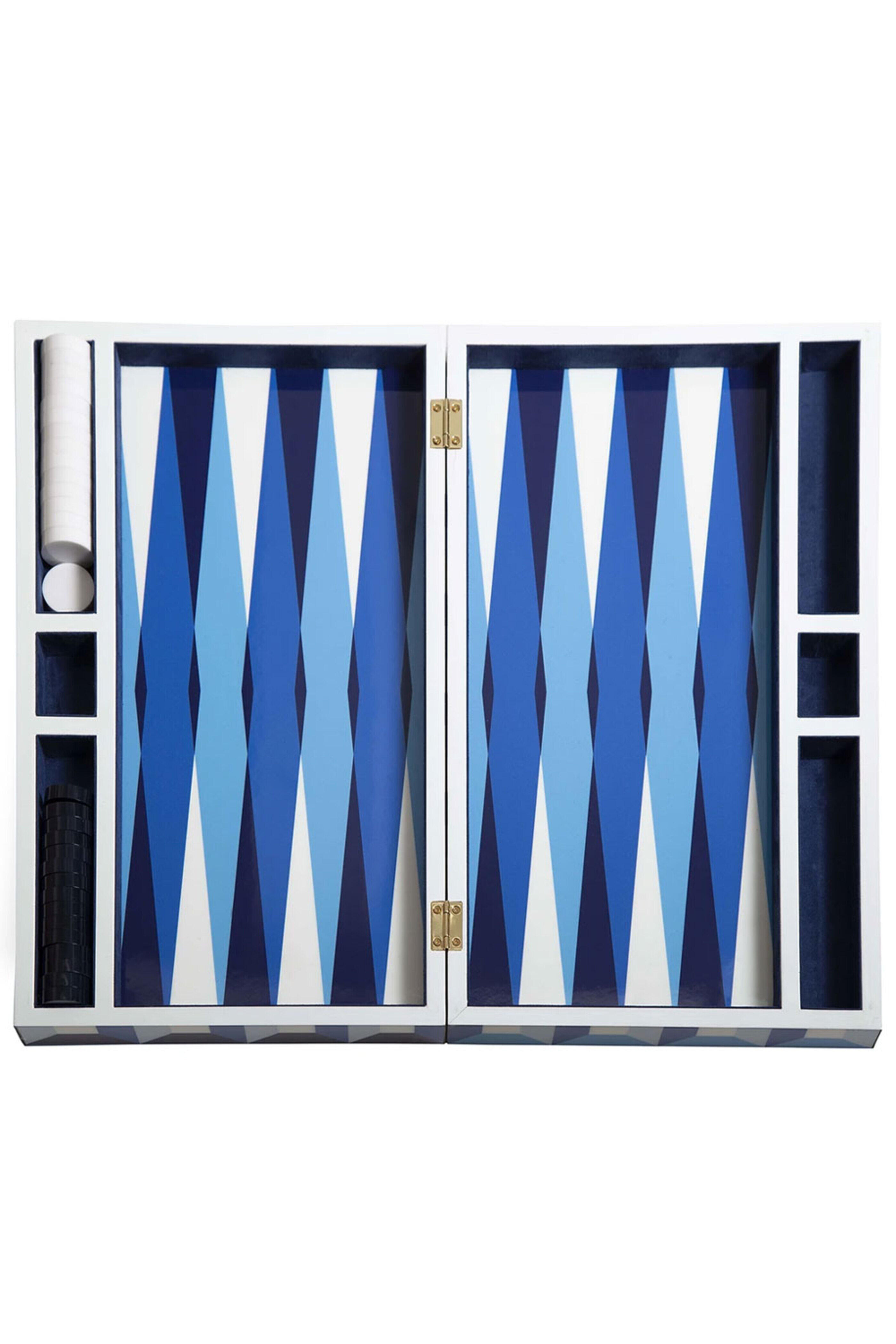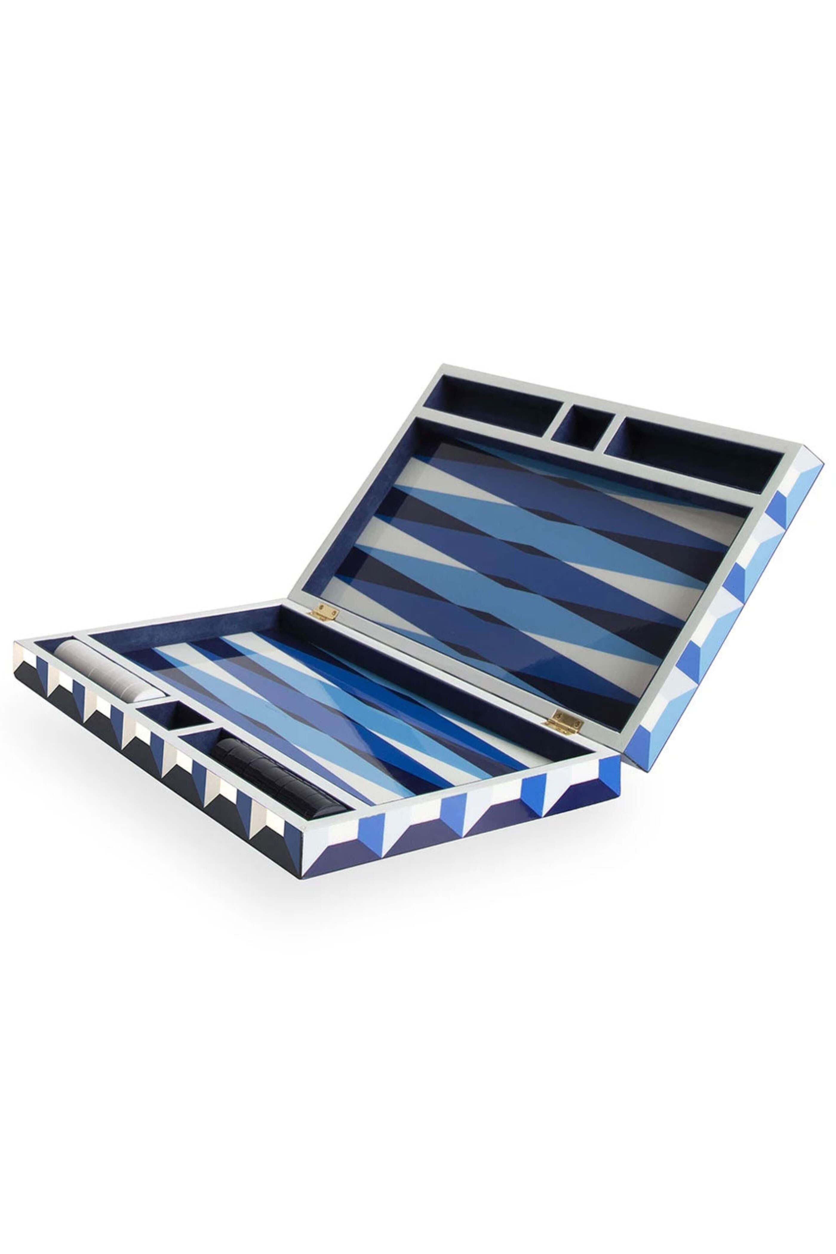 Jonathan Adler Sorrento Backgammon Set . Open: 18.5" W, 22.5" L, 2.25" H . Closed: 18.5" W, 11.25" L, 4.5" H . High-gloss lacquer box with velvet liner . Magnetic closure . Solid resin pieces . Imported . Dust with a soft, dry cloth.