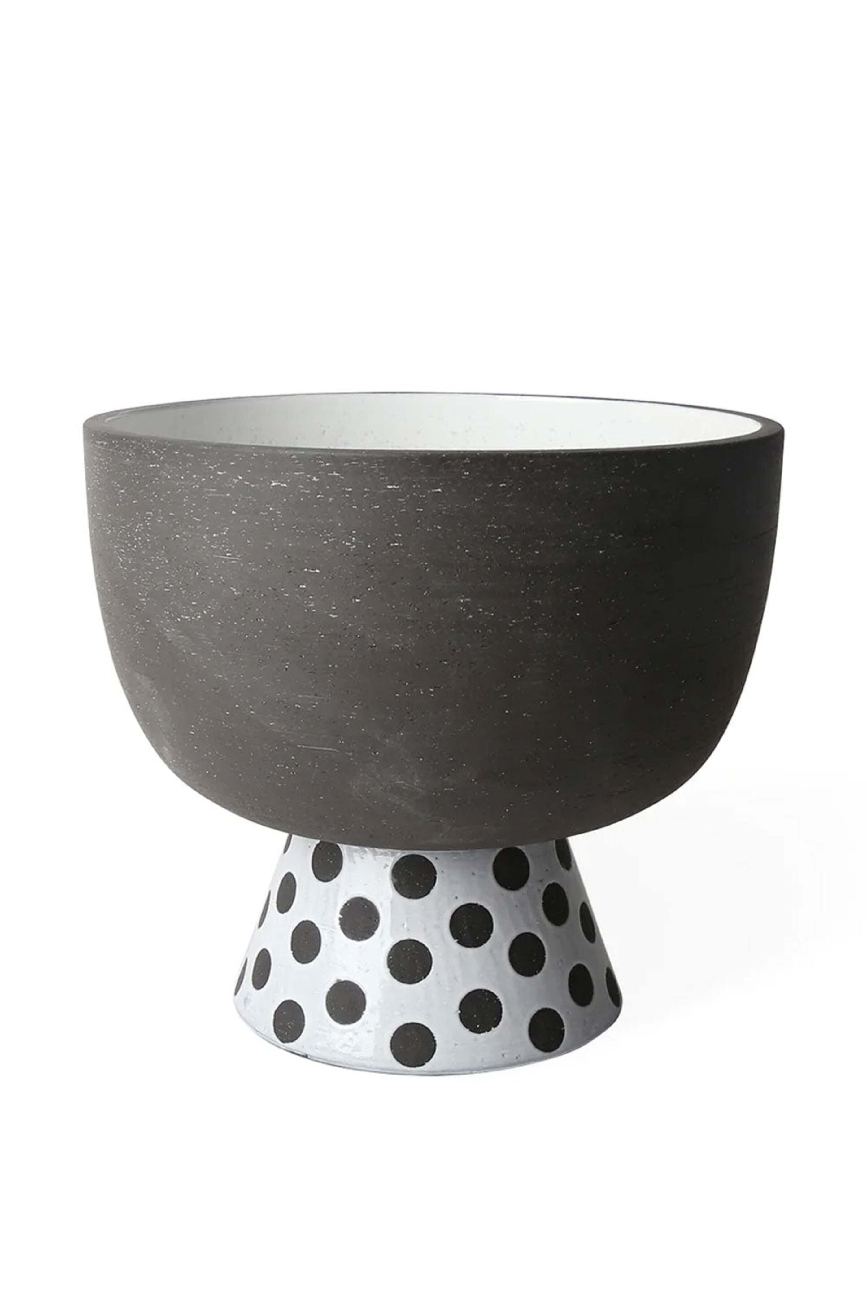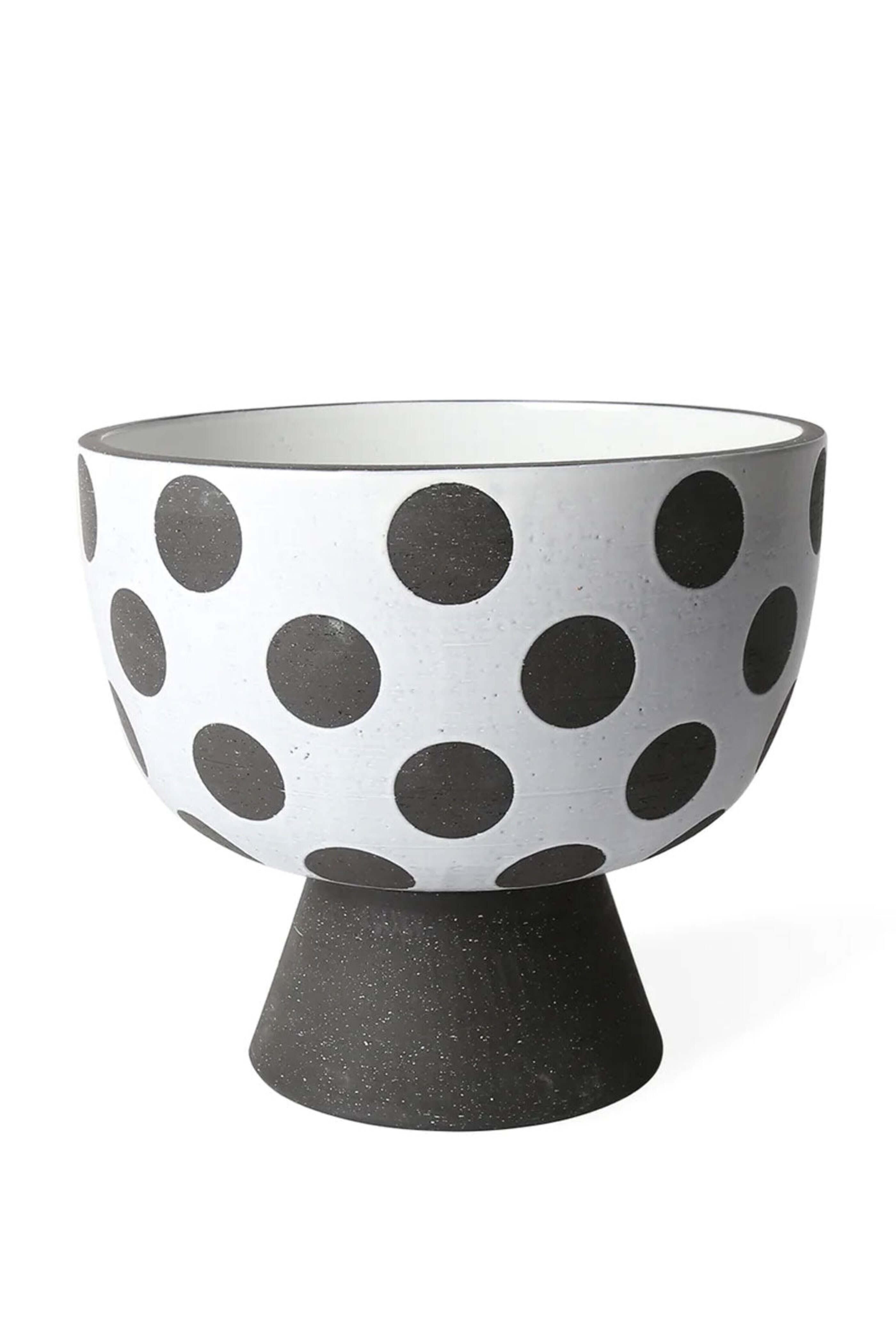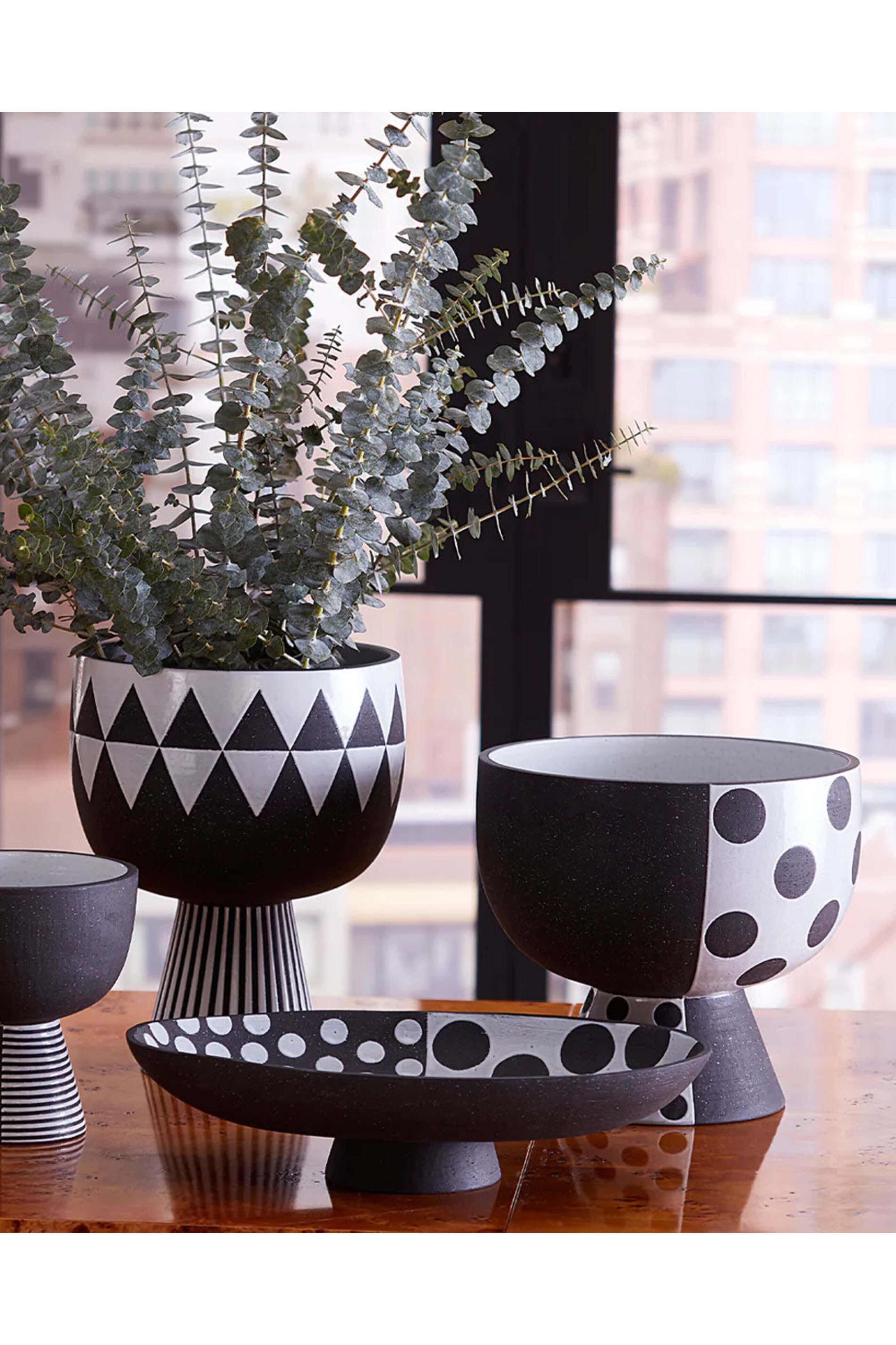 Jonathan Adler Palm Springs Dots Bowl. Black stoneware infused with chunky grog. Linear graphic patterns. 13" D, 11" H. Handmade in Peru.