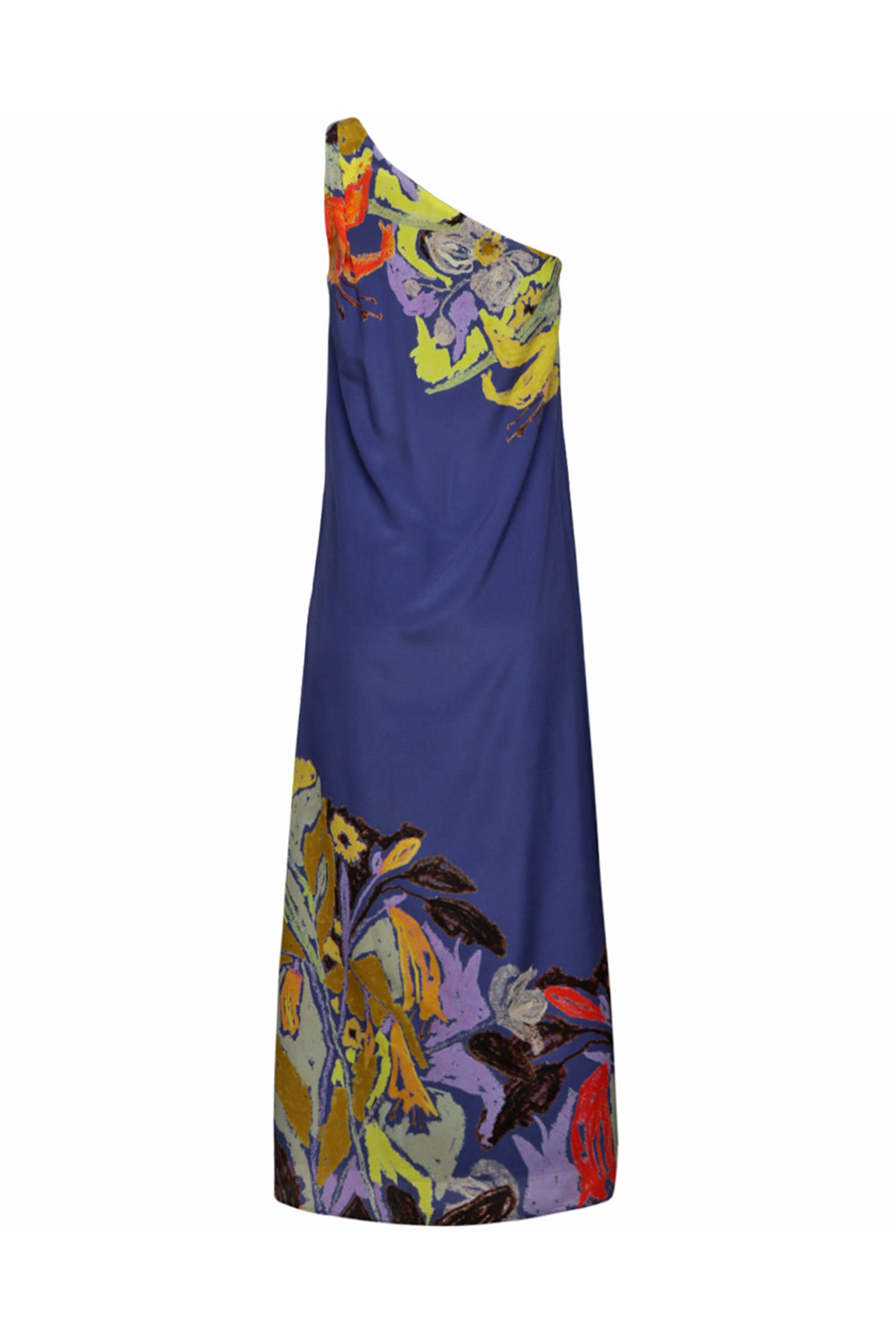 Marie Oliver Water Lily Jae Dress. Single shoulder neckline. Sleeveless. Concealed side zip closure. Side slip pockets. Shift silhouette. Midi to ankle length. Lined. 100% silk.
