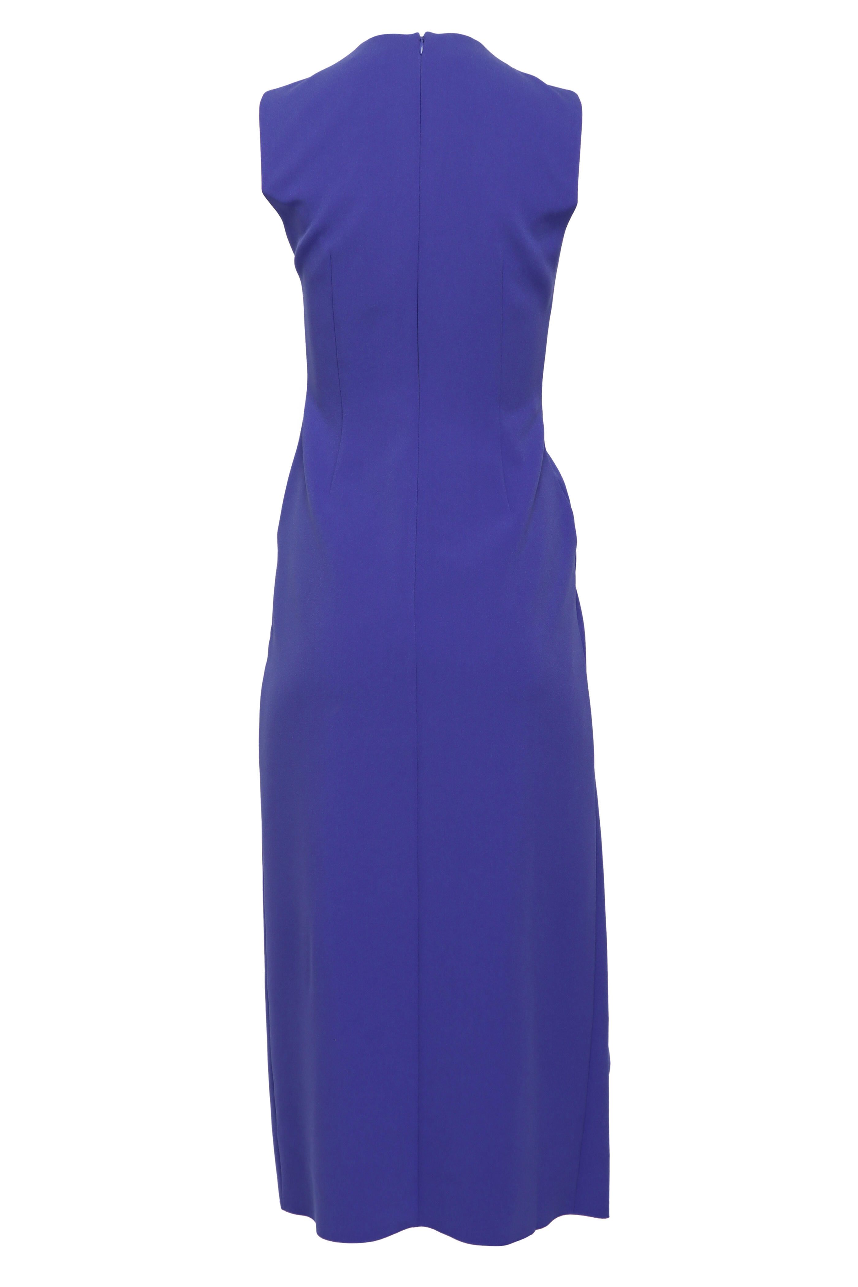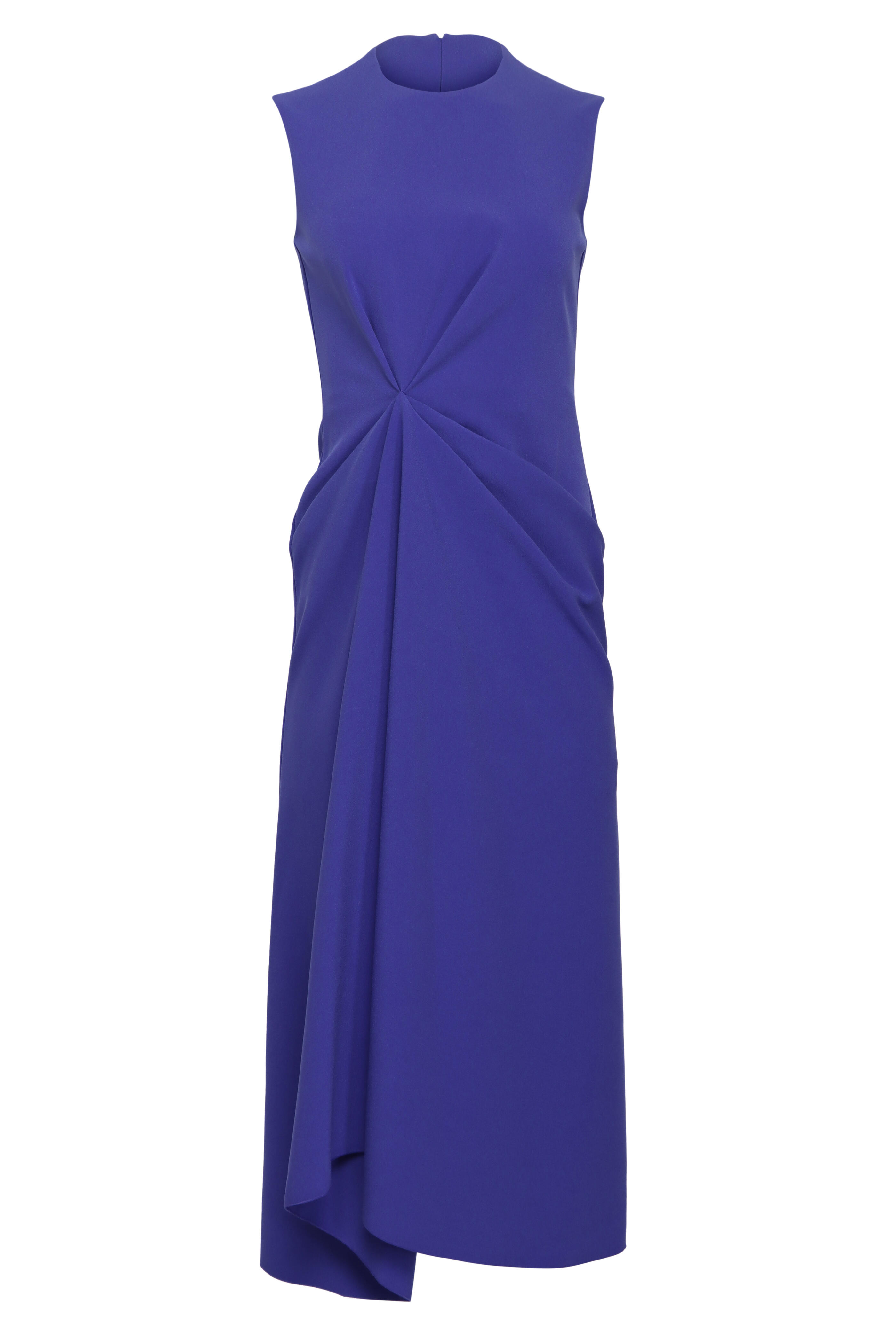 Round neck. Sleeveless. Concealed back zip clsoure. Twist detail at hip. Aline silhouette. Asymmetrical drape hem. Imported. Bust 86cm. Waist 66cm. Midi length. 60% acetate, 40% polyester outer, 73% acetate, 27% silk lining. Dry clean.