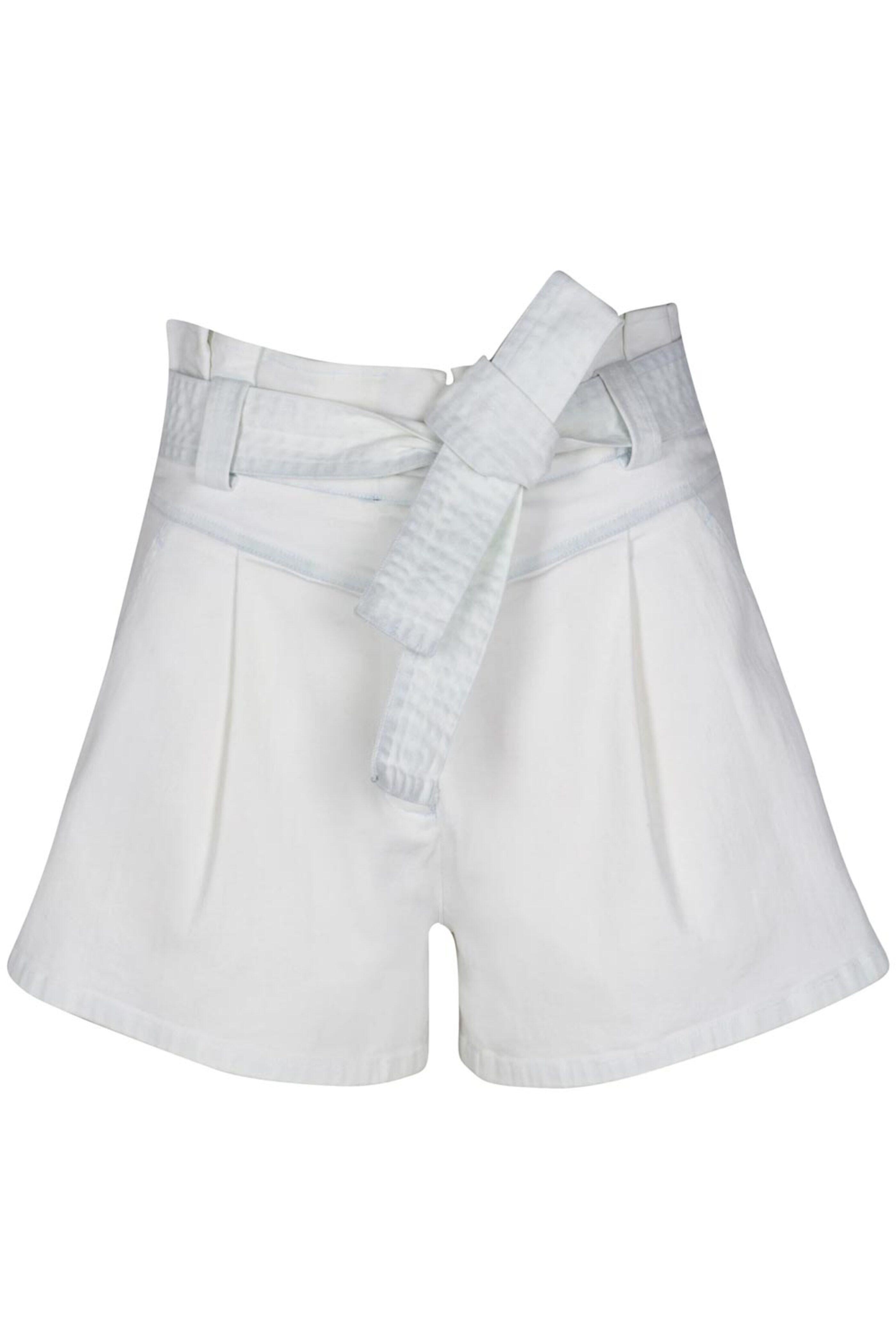 A.L.C. Light Chambray Paperbag Davis Short. Paperbag waist. Hook and eye closure. Zip fly. Removable self-tie belt. Belt loops. Side slip pockets. Back welt pockets. Relaxed fit. Denim fabrication. 91% cotton, 7% polyester, 2% elastane.