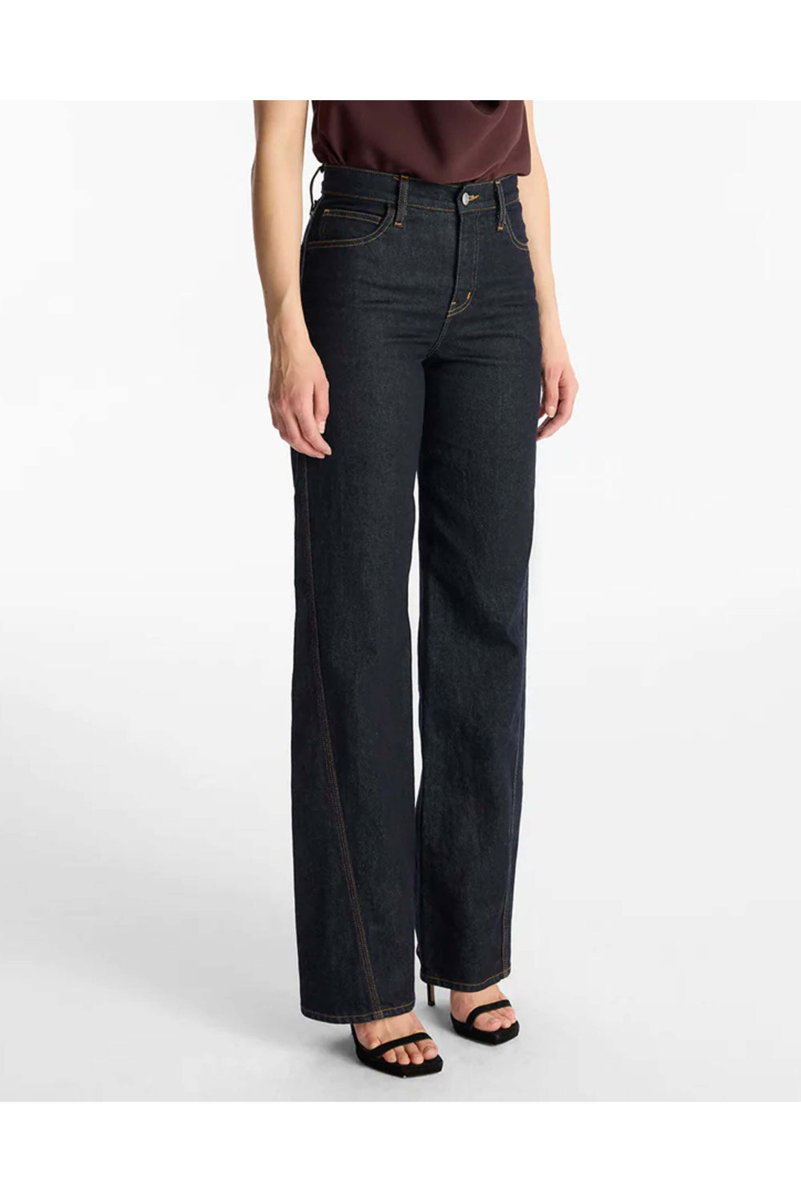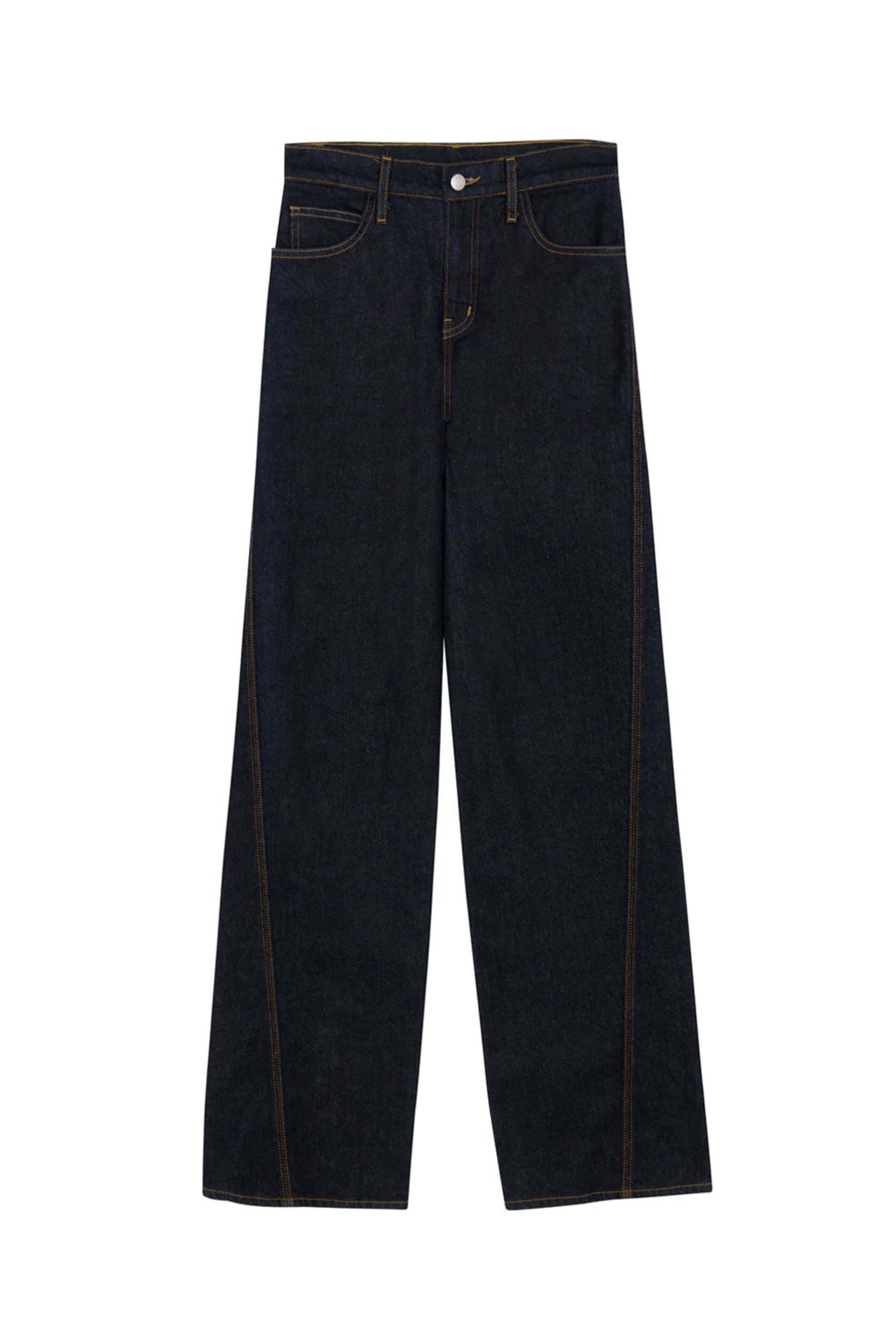 Mid rise. Belt loops. Button closure. Zipper fly. Five pocket style. Straight leg. Full length. Contrast stitching. A.L.C. Washed Indigo Abbott Jean. 98% cotton 2% elastane.