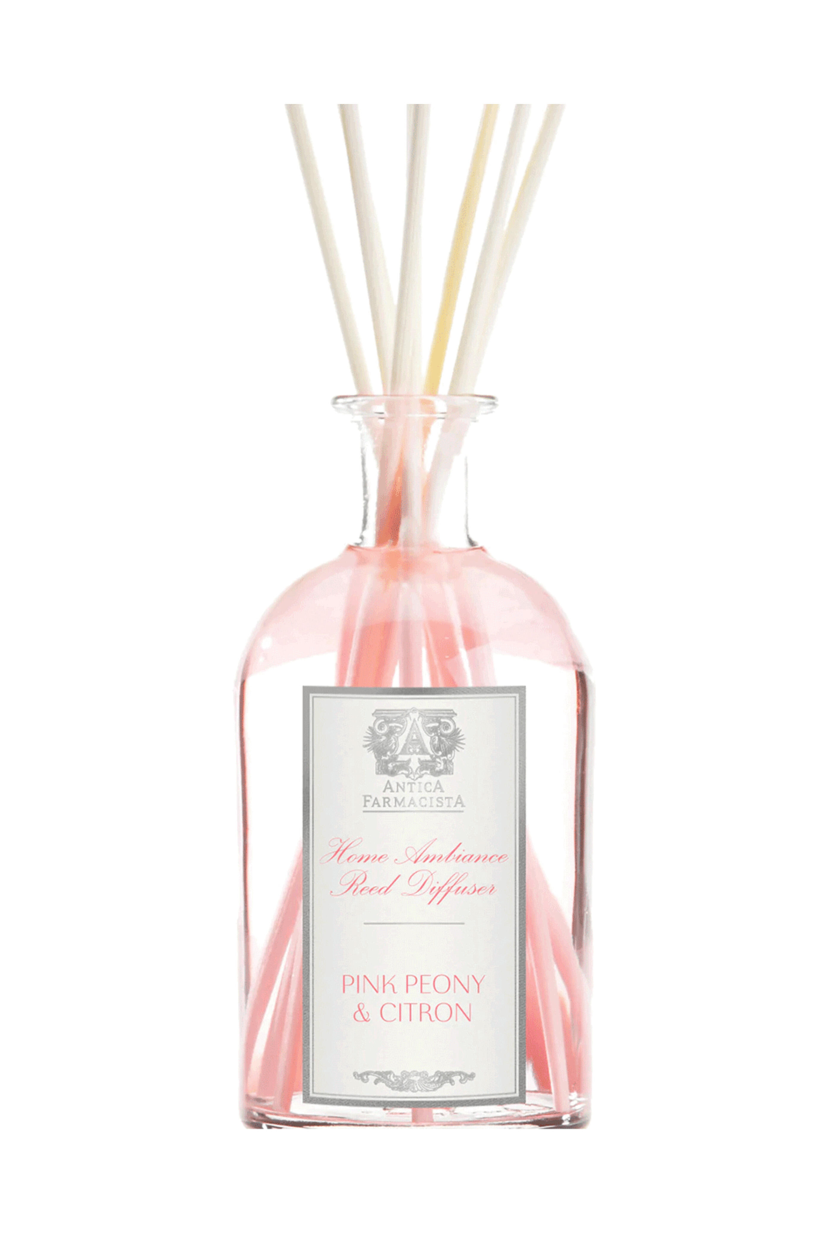 Pink peony and citron notes. White rattan reeds included. Made in USA. 250 ml.. 5.75 H X 2.25 W.
