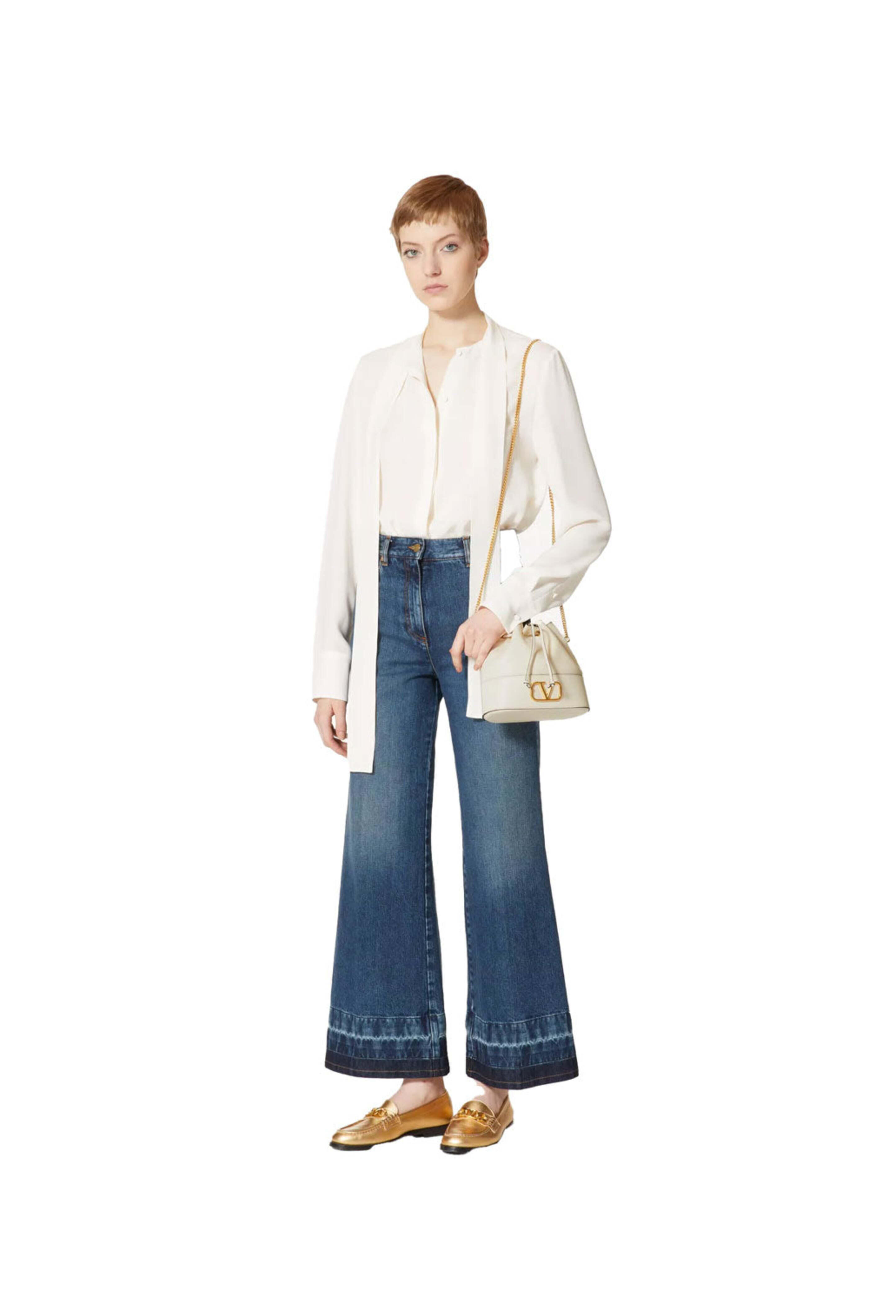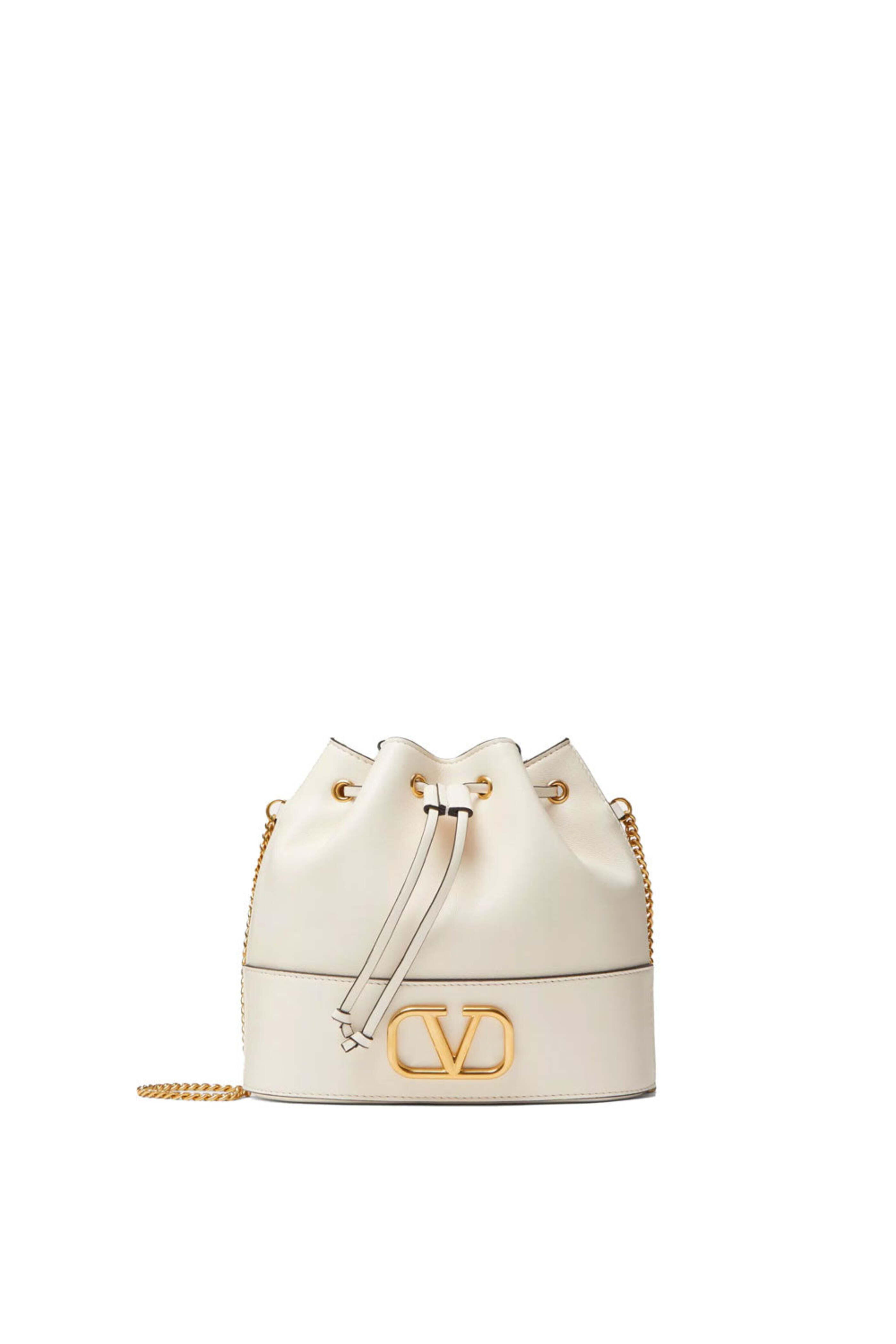 Valentino mini Bucket Bag with Vlogo Signature Chain in Light Ivory. Drawstring closure. Chain strap. Antique brass-finish logo and hardware. Nappa leather outer and lining. 8âW x 7âH x 3âD. 21â strap drop. Made in Italy.