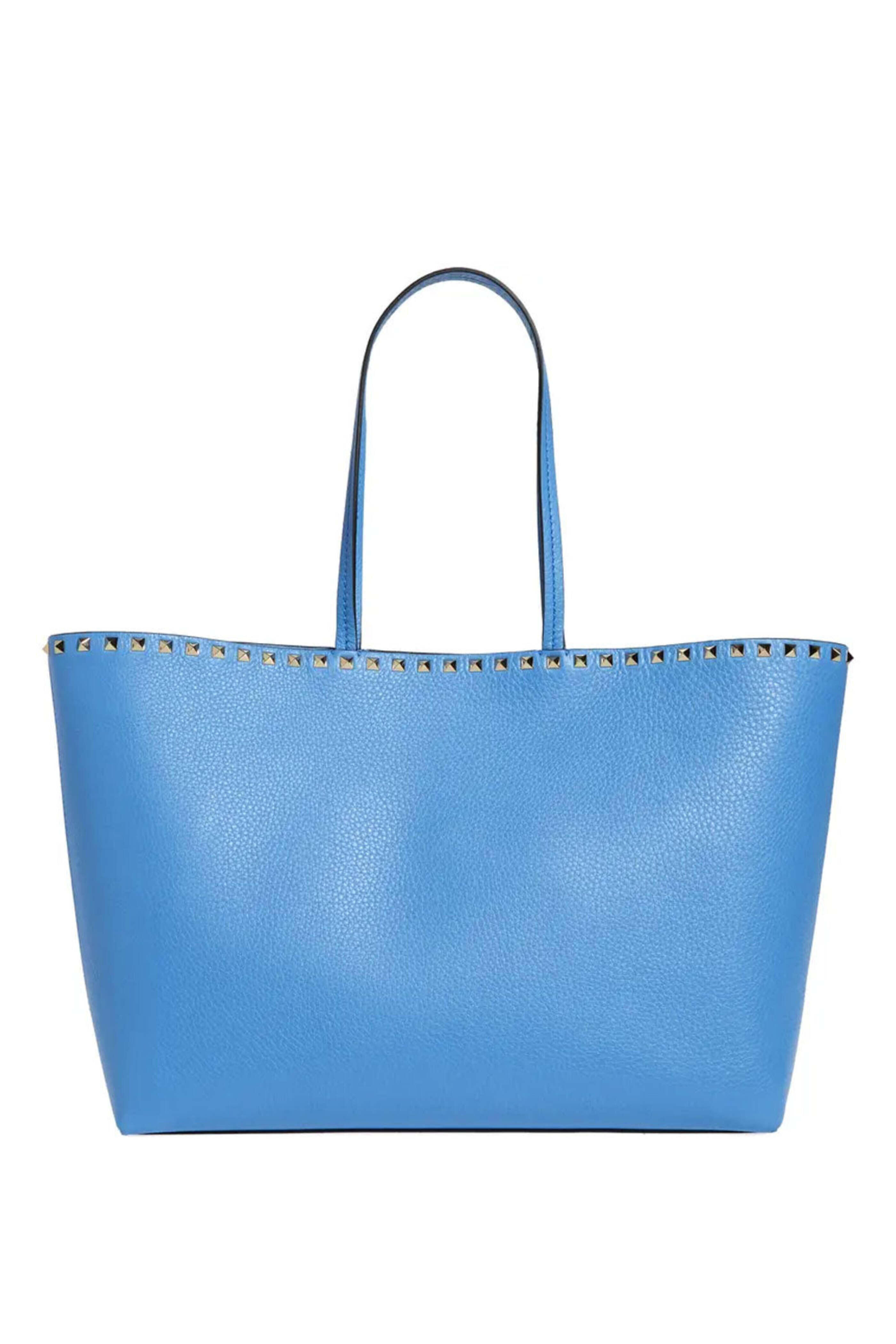 Valentino Garavani Rockstud Vitello Tote Bag in Denim. Two flat tote handles. Flat zipper pocket and double slip pocket.. Signature rockstud trim. Pebbled leather. Gold-tone hardware. Calf leather outer. 5.91" W x 10.6 H x 18.5" D. Made in Italy.