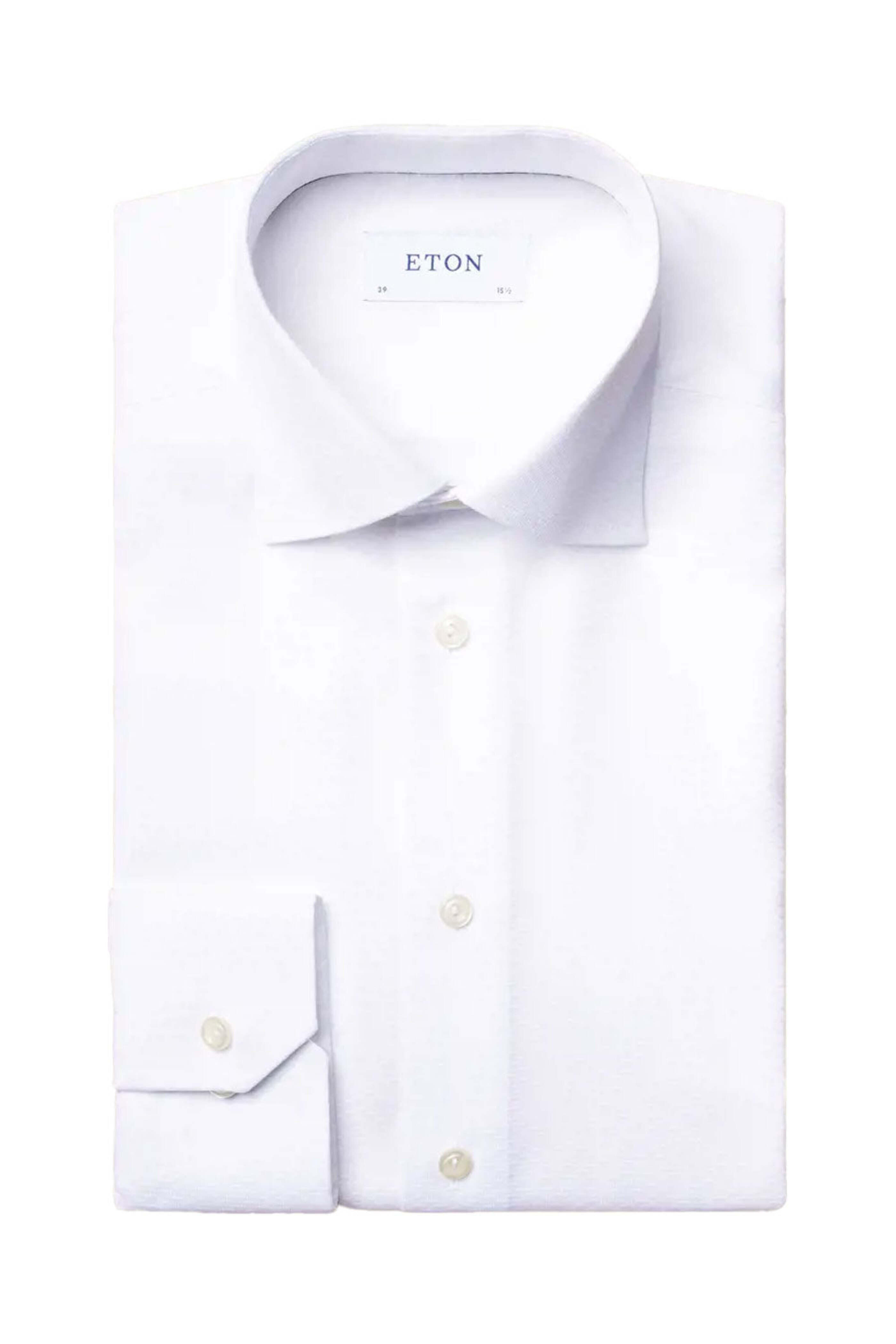 Eton White Twill Dress Shirt. Spread collar. Button down front. Long sleeves. Single button mitered cuffs. Contemporary fit. Fine twill fabric. 100% cotton.