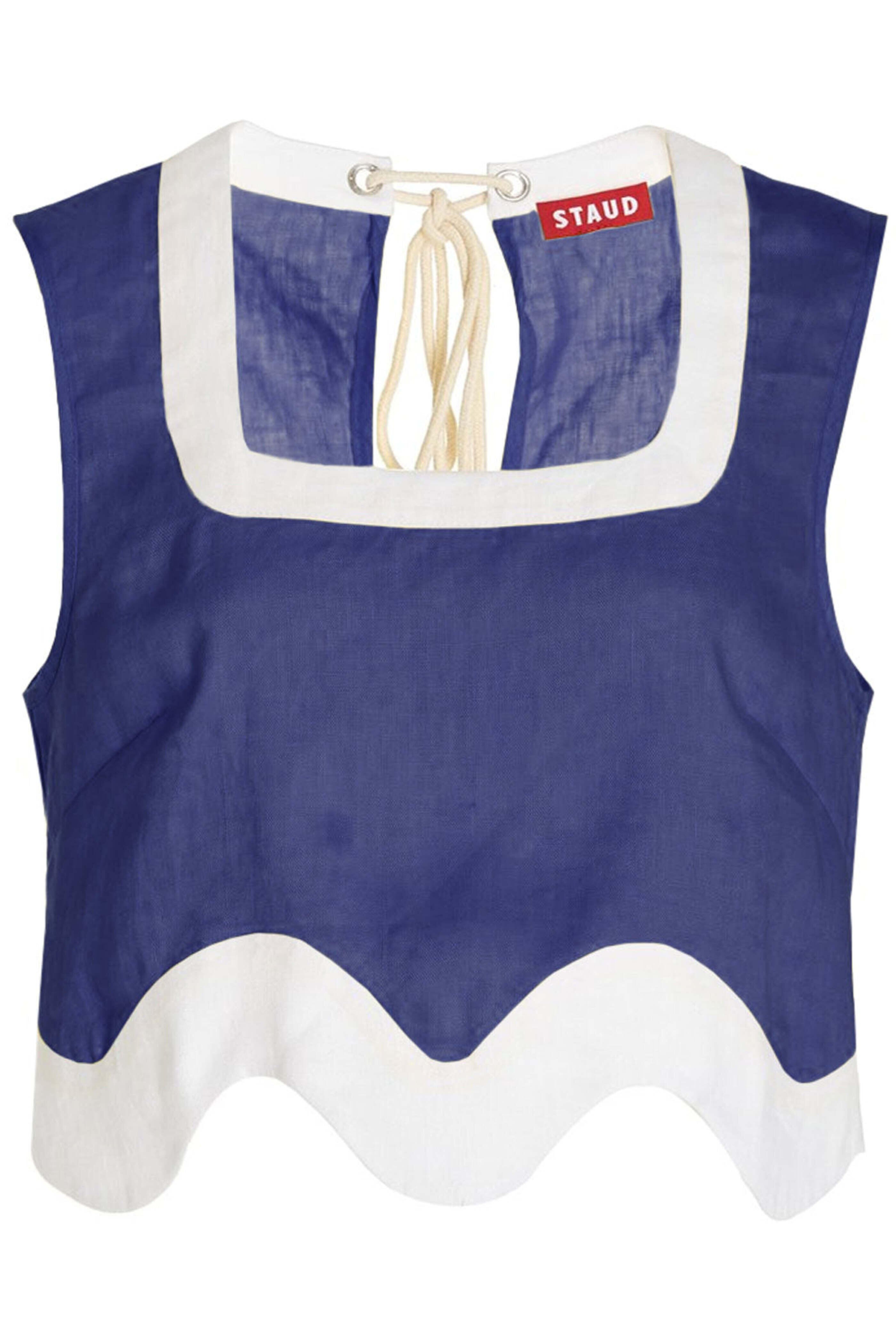 STAUD Navy and White Livia Top. Square neck. Self-tie closure at back; keyhole details. Sleeveless. Relaxed fit. Cropped length. Linen fabrication. Scalloped hem.