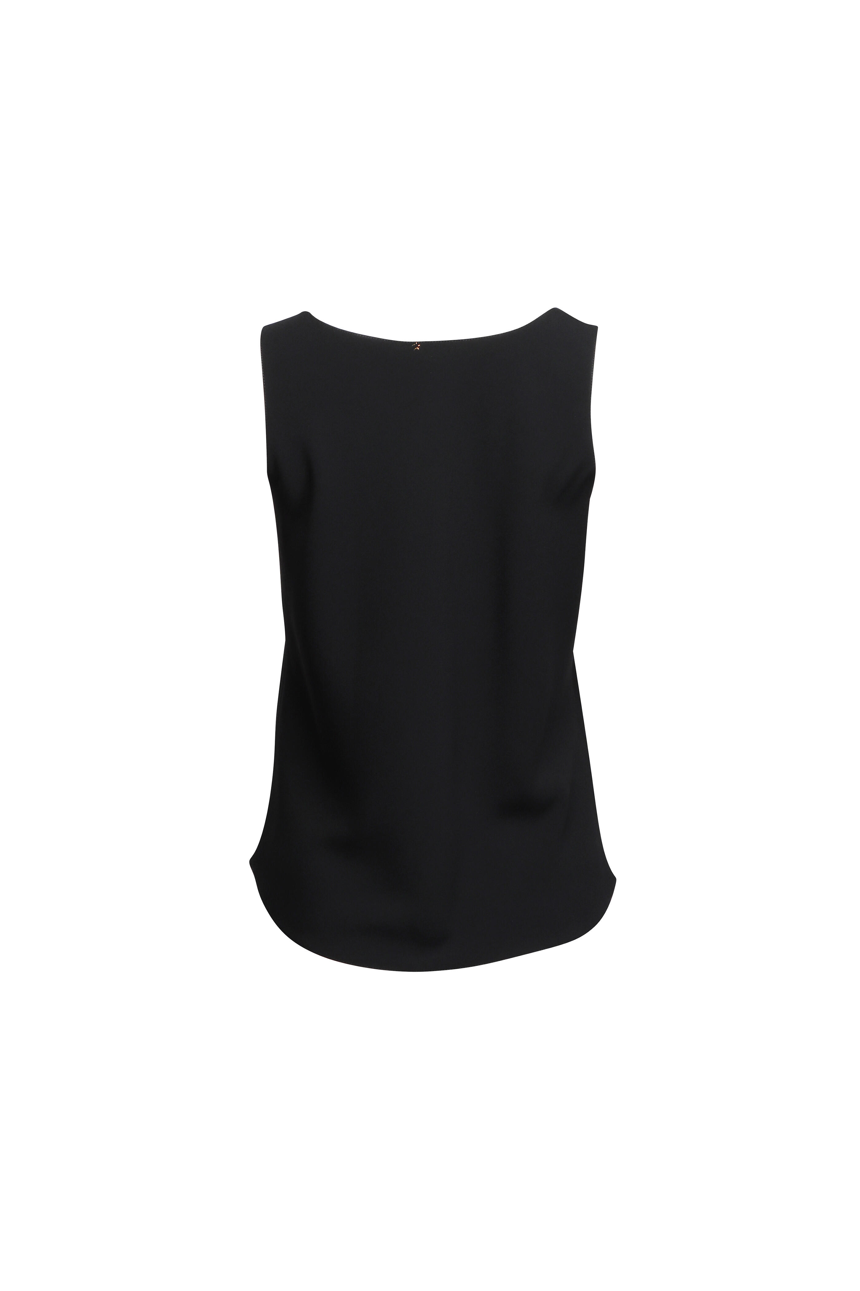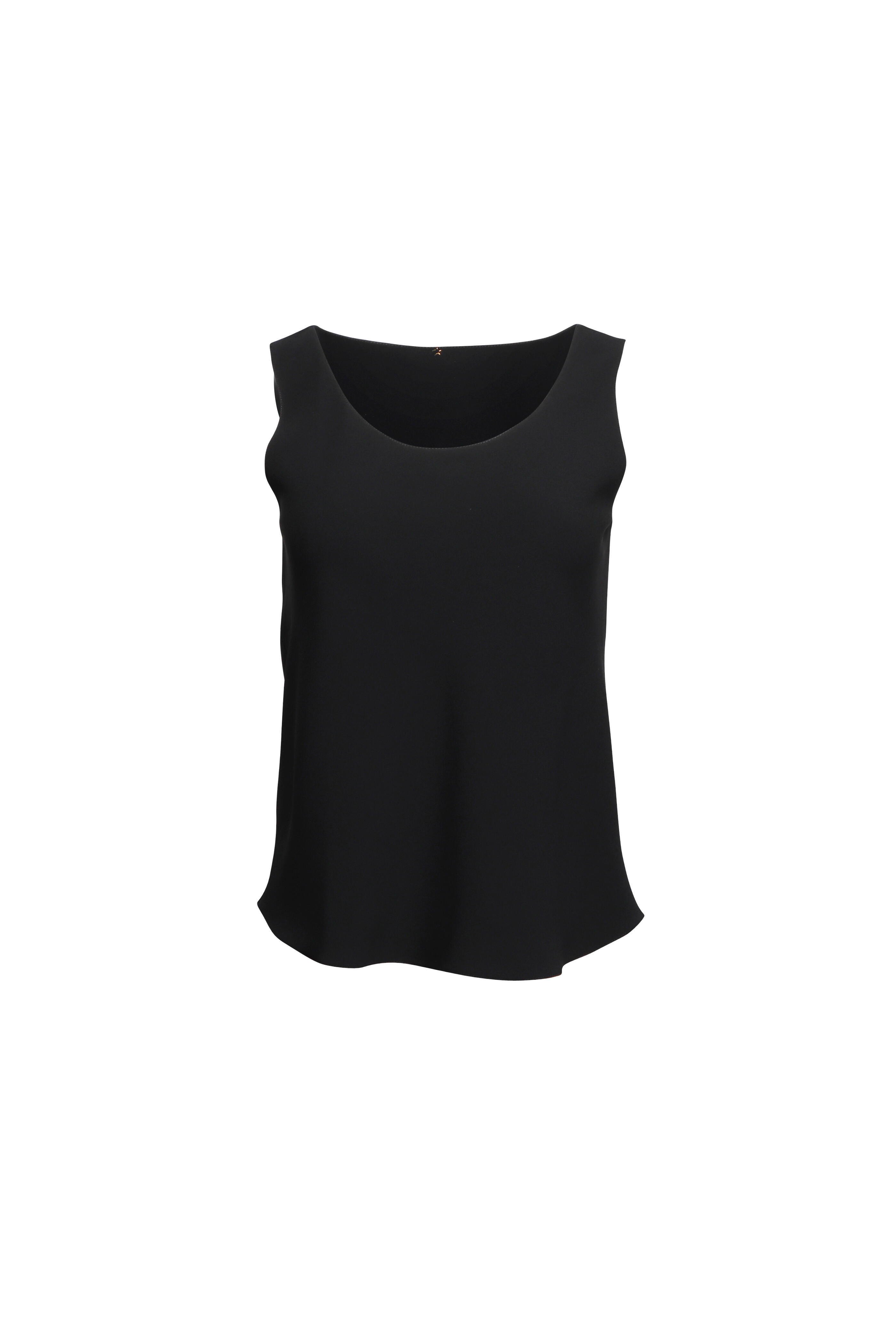 Scoop neck. Sleeveless. Relaxed fit. Rounded hem. Made in USA. 100% silk. Dry clean.