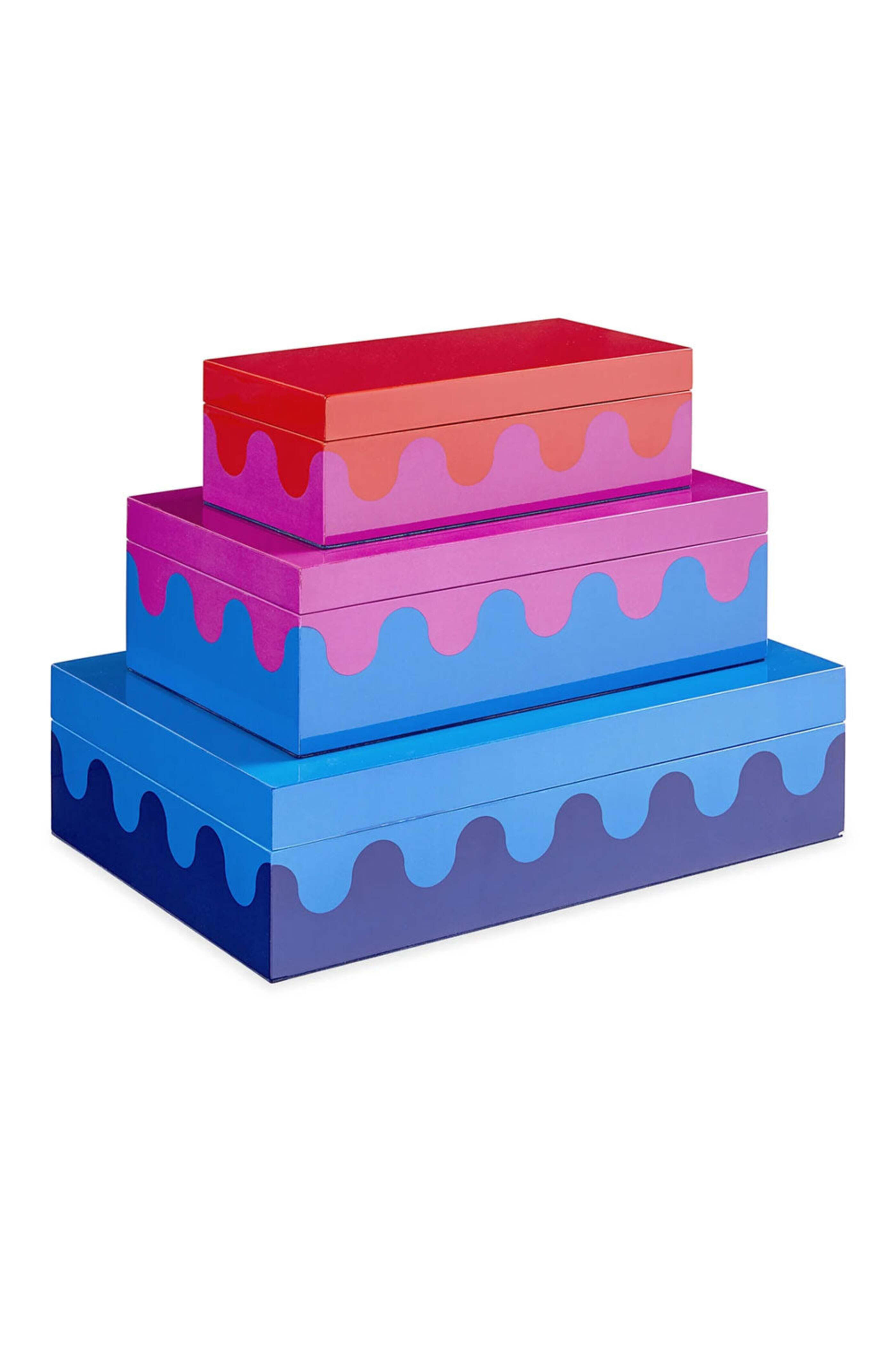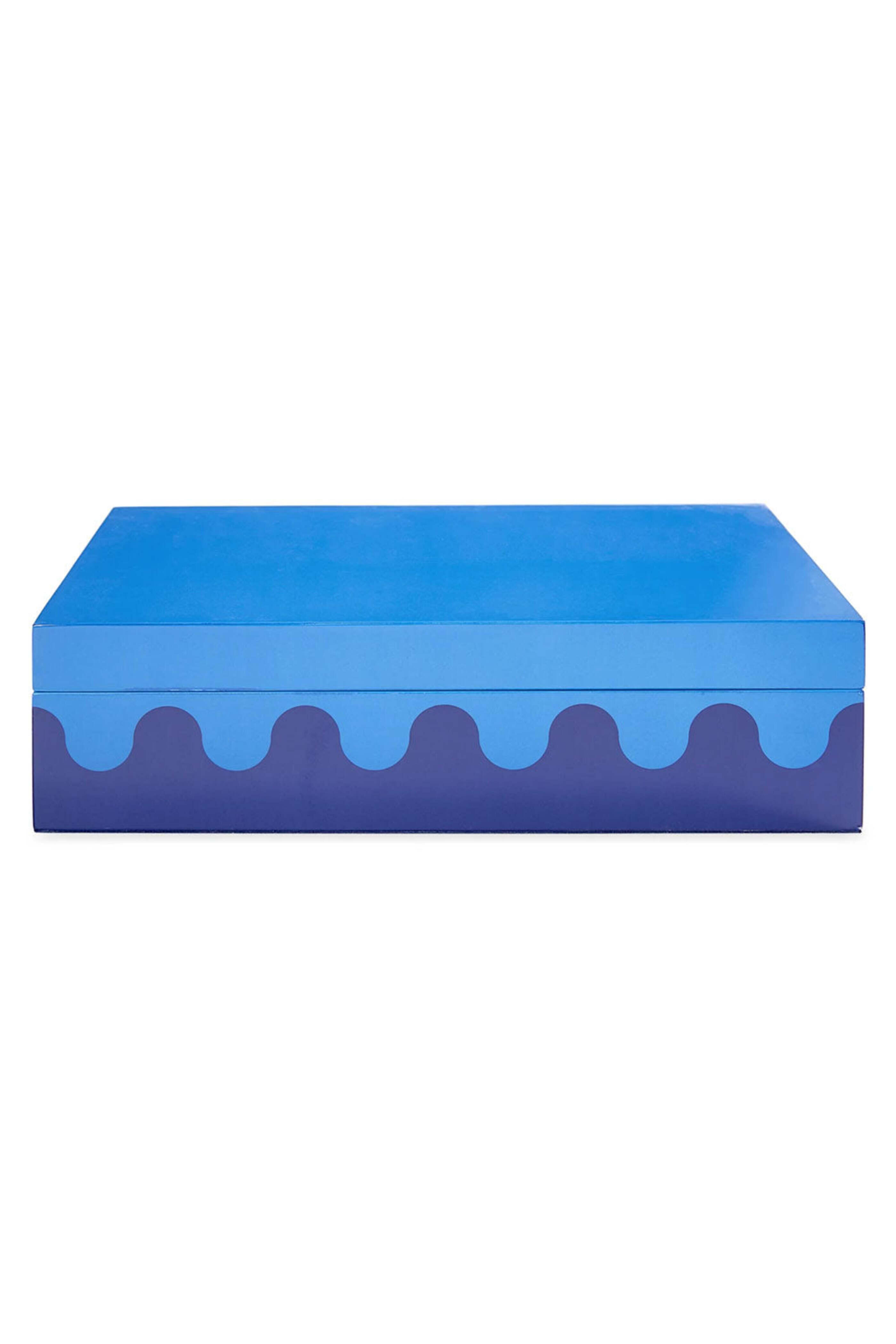 Jonathan Adler Large Blue Ripple Box. 12" W, 8" D, 3" H. Interior dimensions: 11.125" W, 7.125" D, 2.375" H. Lacquered box. Velvet liner. Imported. Dust with a soft, dry cloth.