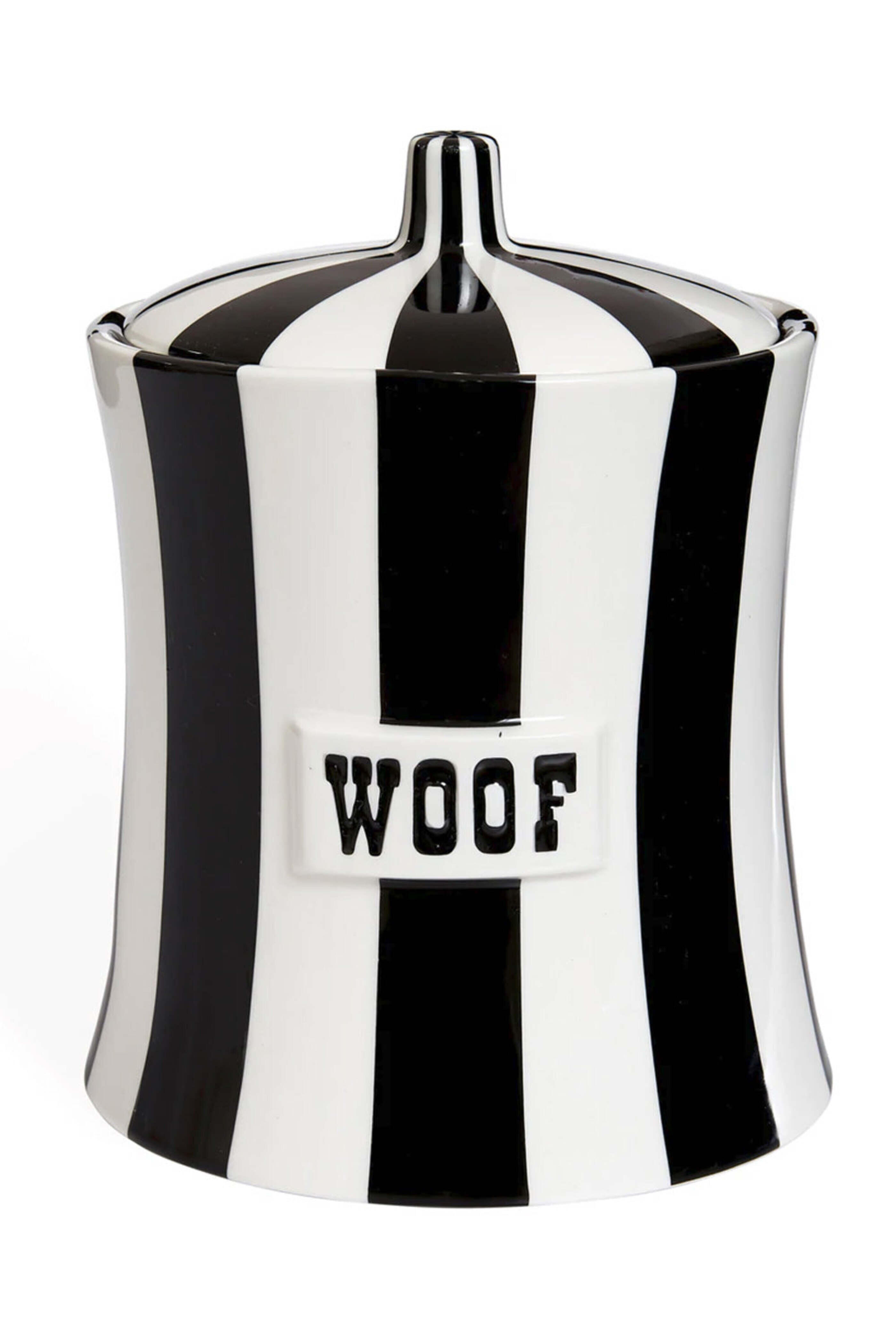 Jonathan Adler Woof Vice Canister. 62oz capacity. High-fired porcelain with a gloss glaze. Gasket seal. 6.25" Dia, 7.75" H. 62oz capacity.
