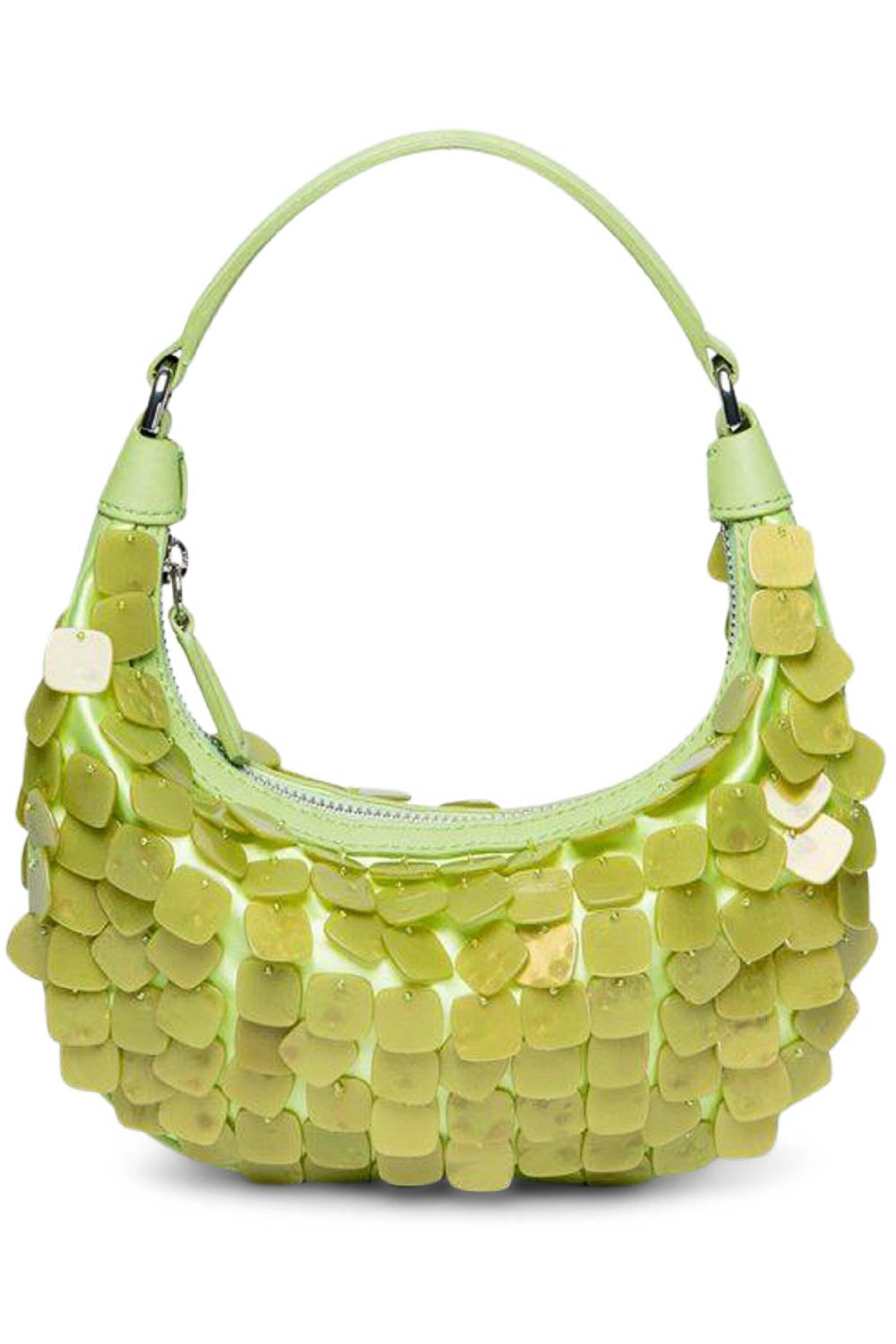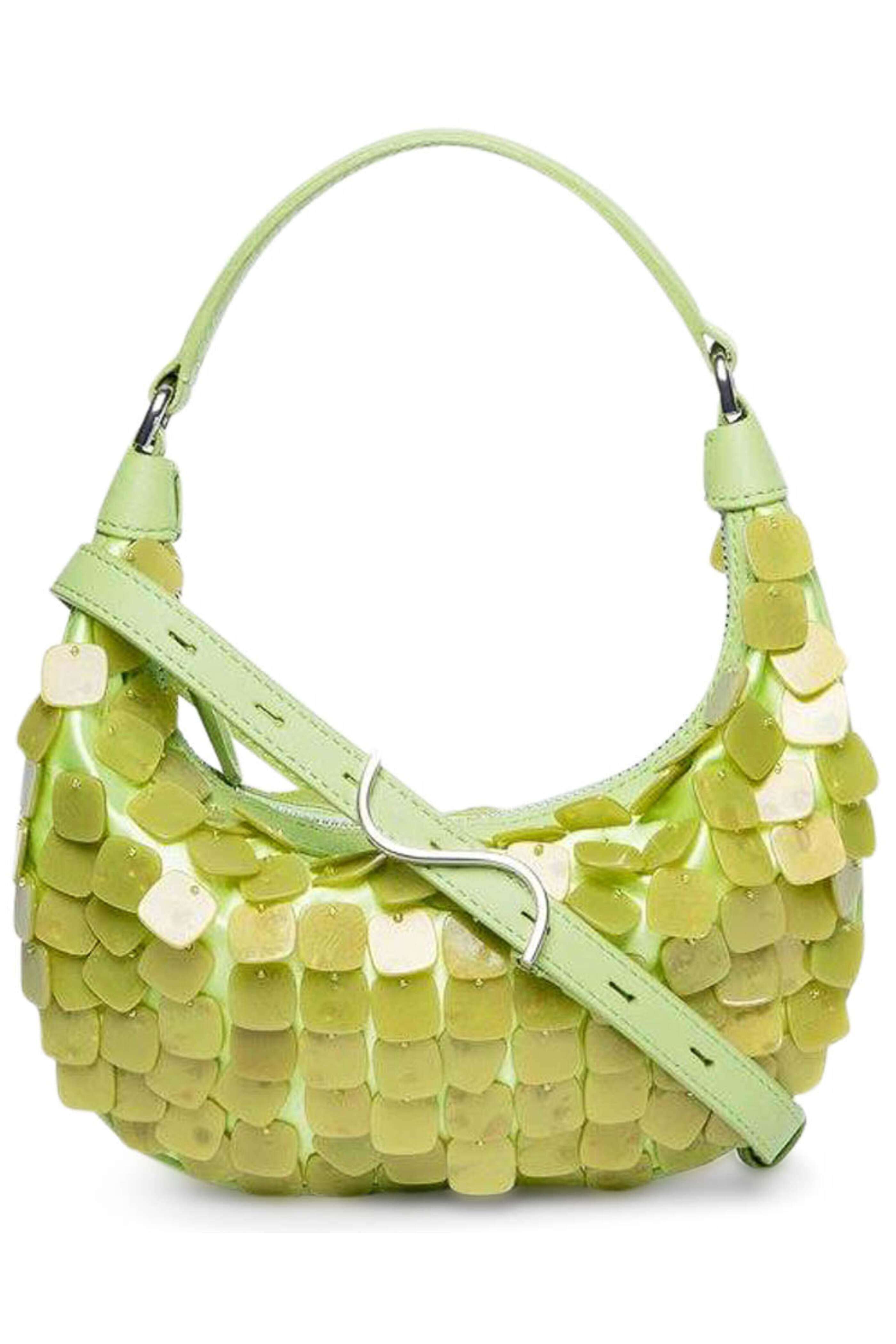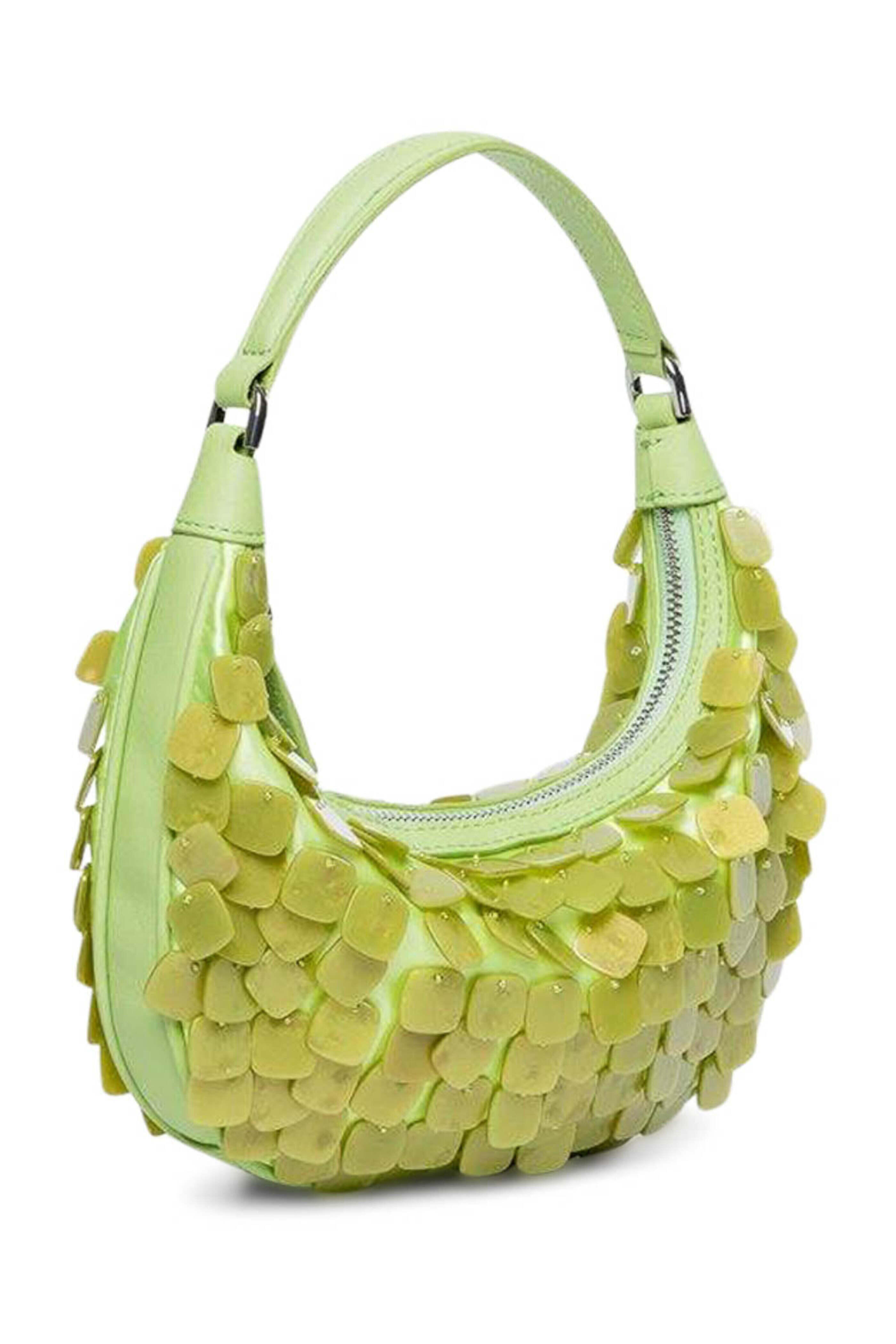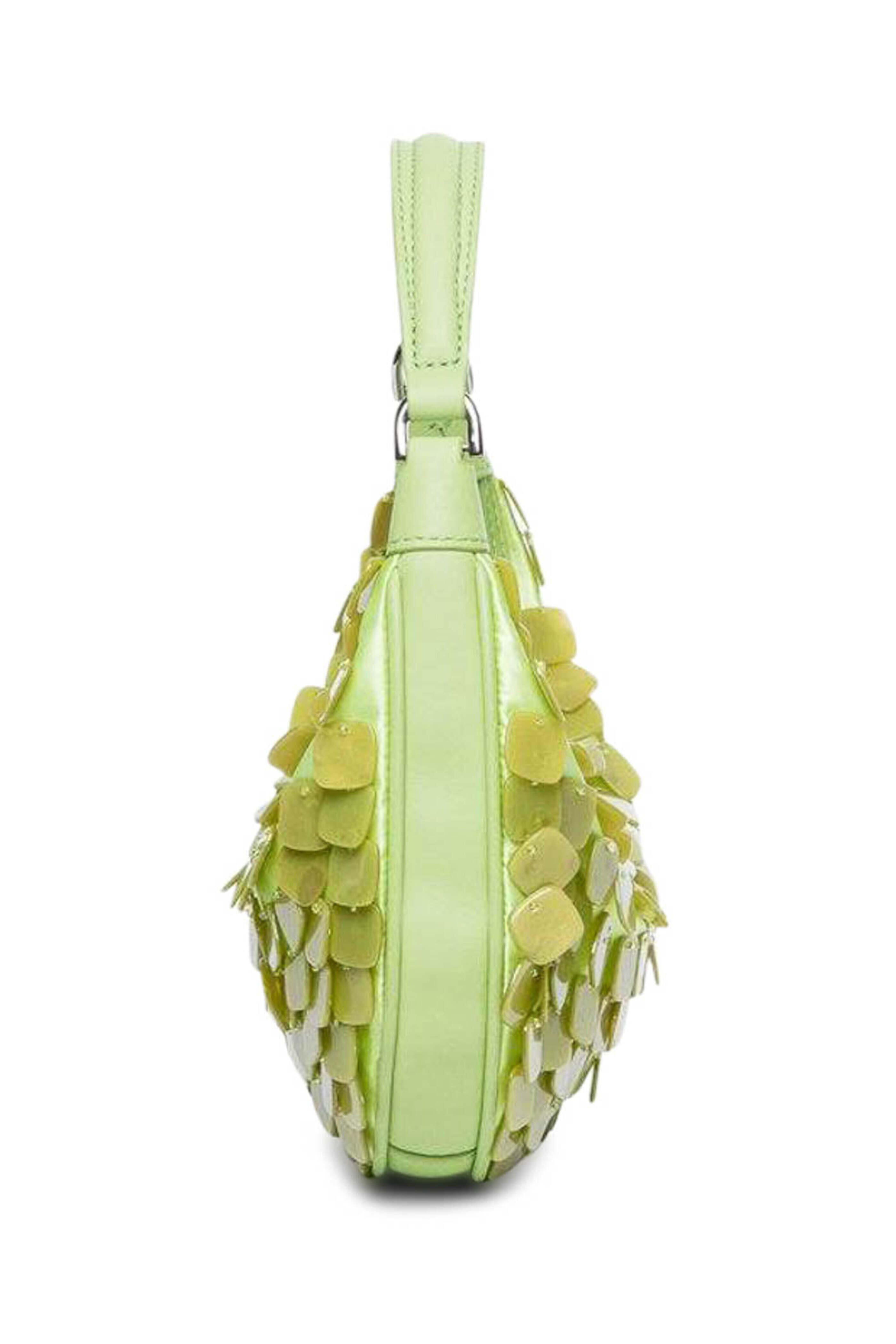 Staud Mini Sasha Bag in Pistachio Payette Payette pattern body Top zip closure Detachable nappa strap One zip pocket Fabric lined interior 8 handle drop Leather zipper pulls 8.5 W X 11 H X 9.8 D.
