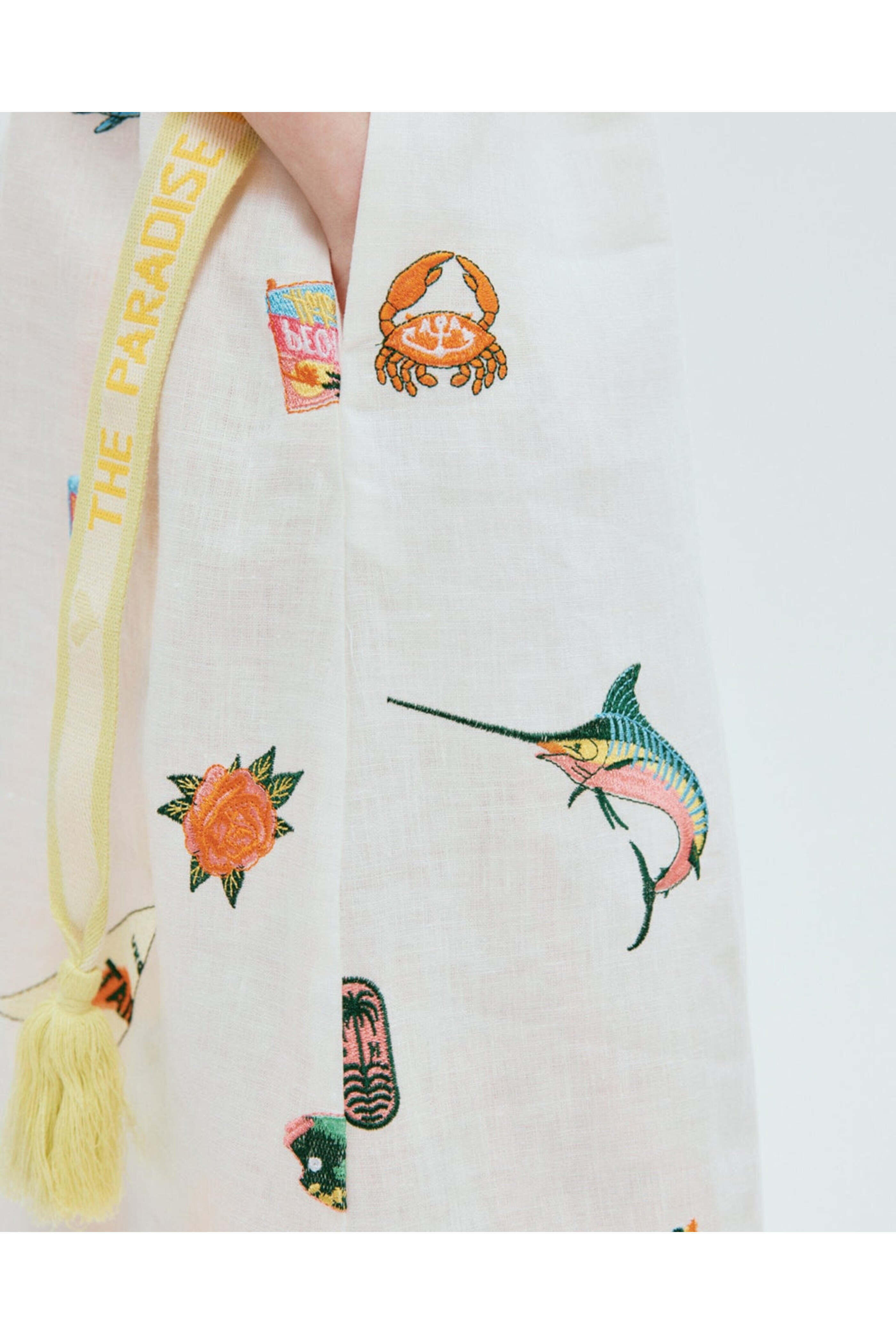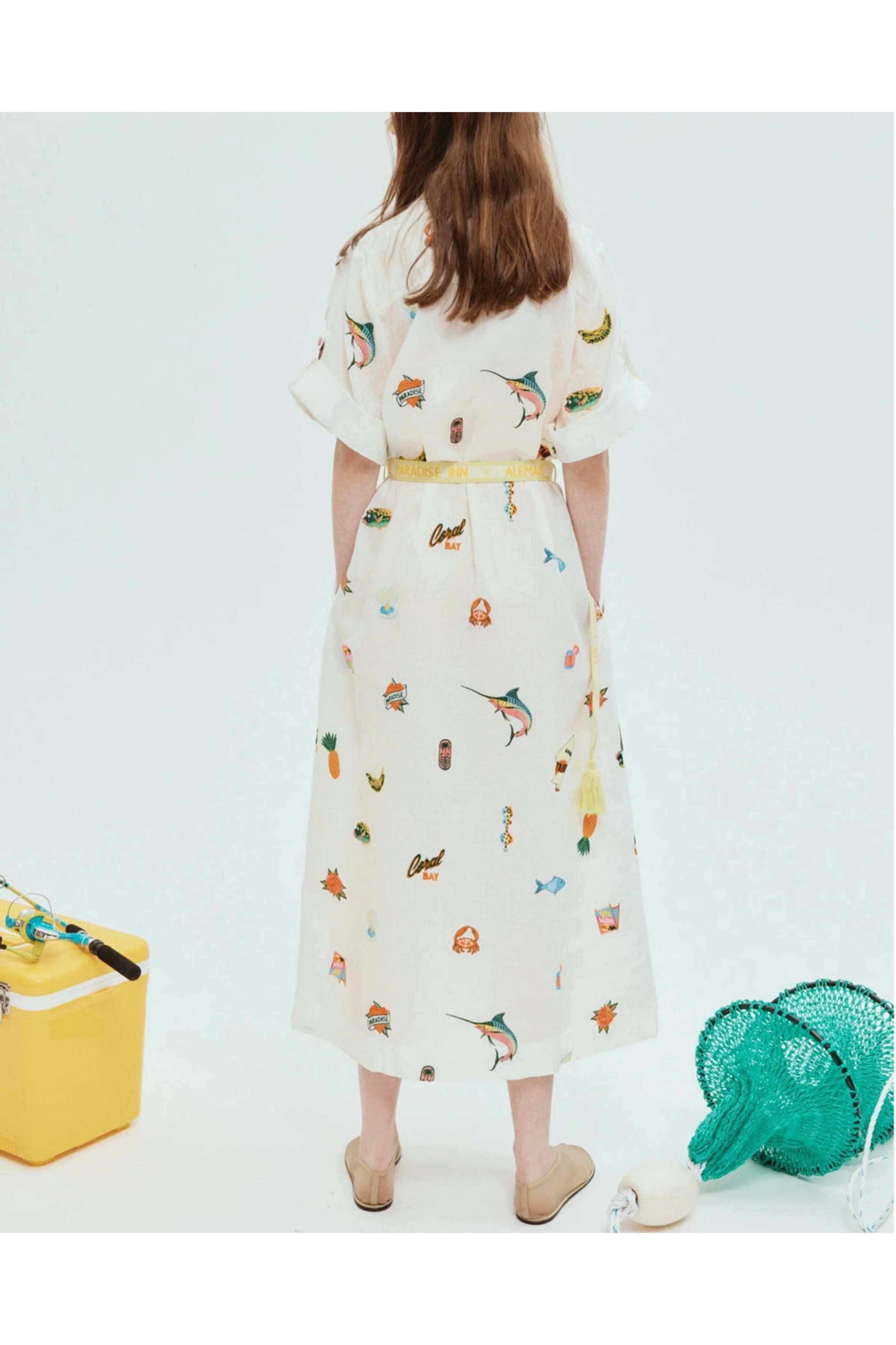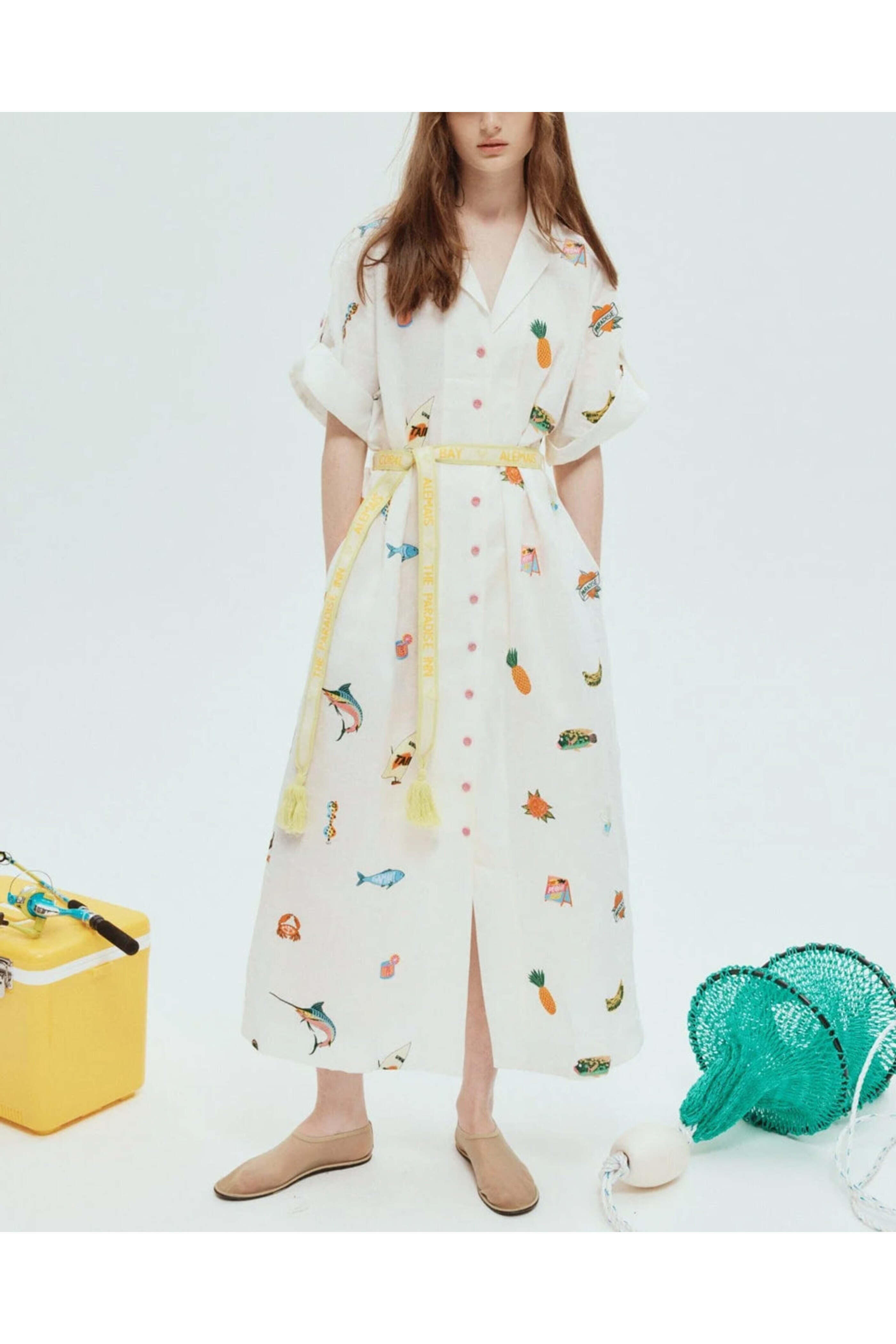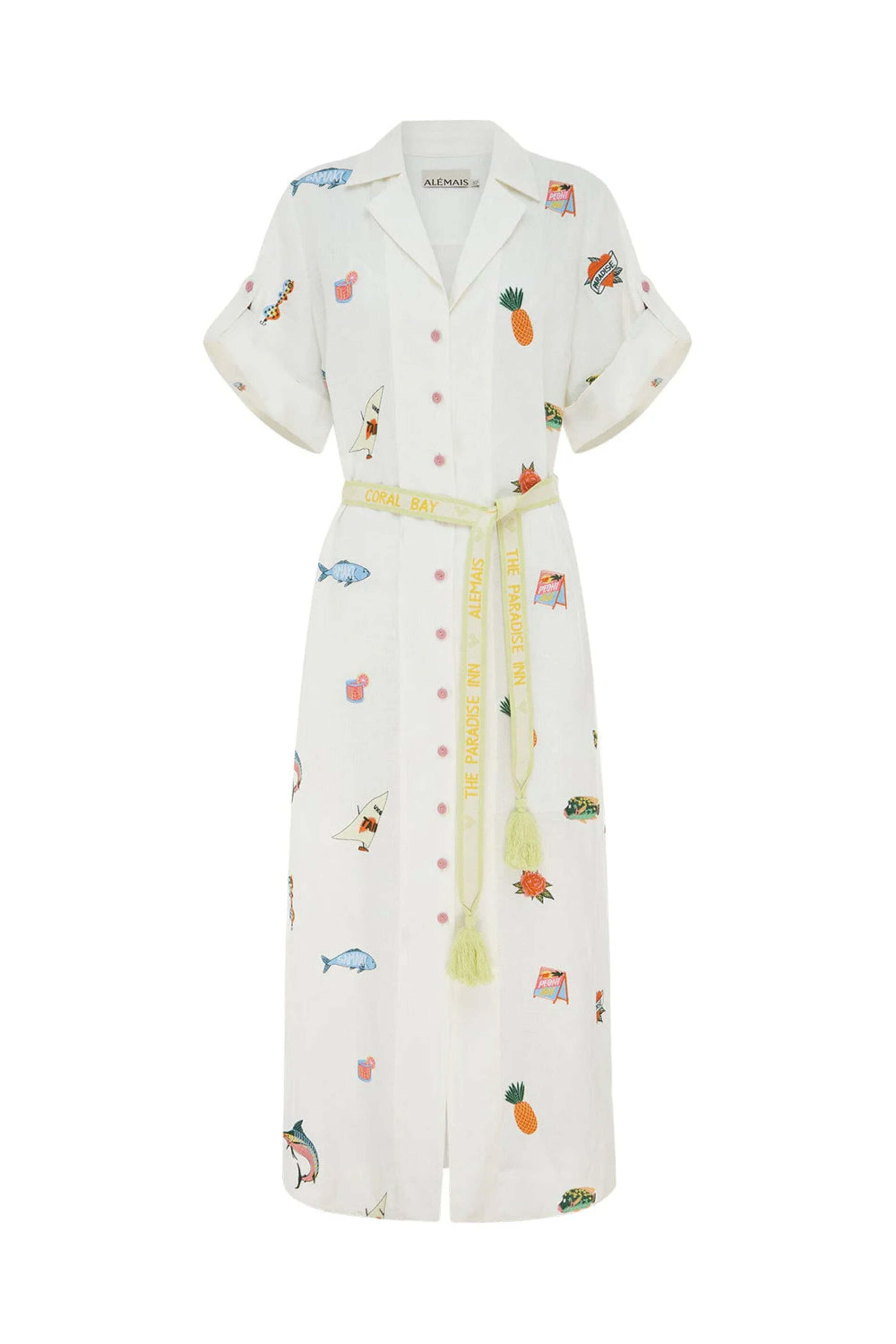 Alémais Cream Embroidered Blue Marlin Dress. Notch lapel. V neck. Short sleeves; folded cuffs with button tab. Button down front closure. Removable self-tie belt; logo detail. Midi length. Embroidered detail throughout. 100% linen.