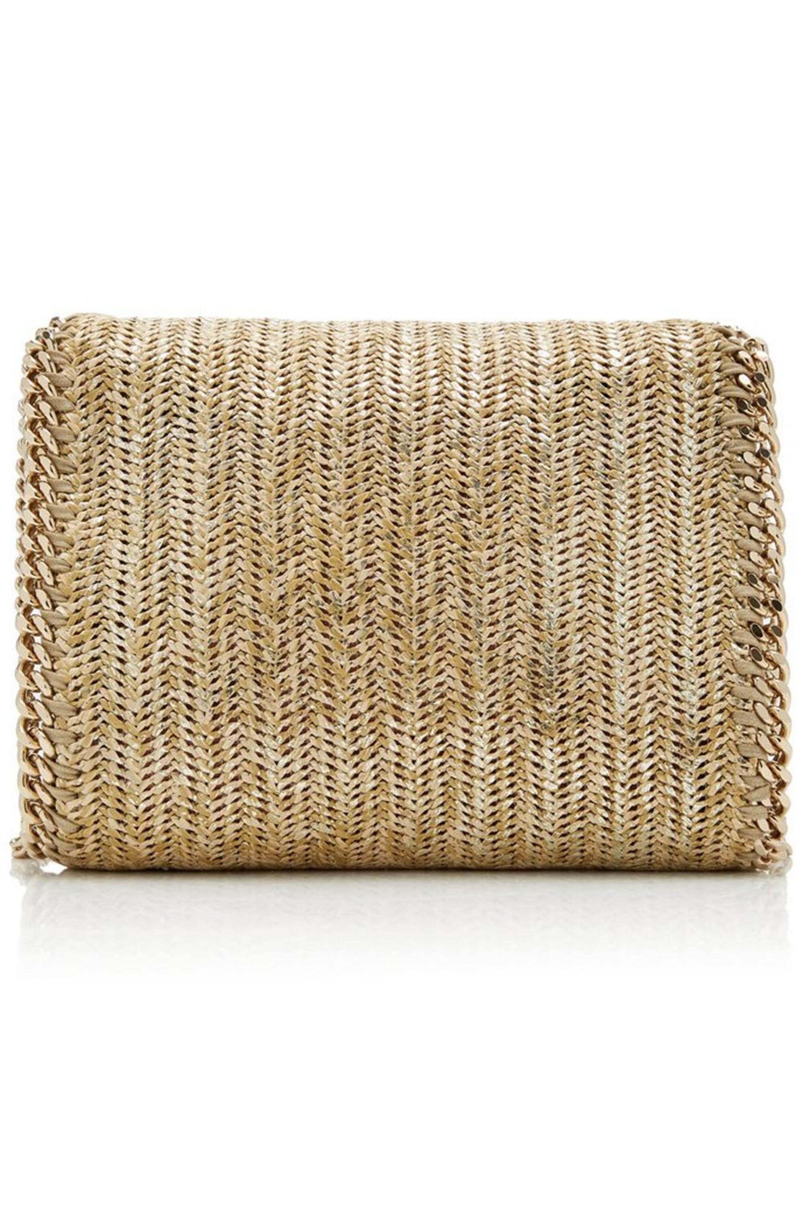 - Stella McCartney Gold Raffia Mini Falabella Tote Double chain top handles; longer shoulder chain 3.9 top handle drop; 18.5 shoulder strap drop Gold tone hardware Magnetic closure at top Single interior slip pocket 10.2 H x 9.8 L x 2 D Metallic sheen throughout Lined Raffia and vegan leather fabrication Made in Italy