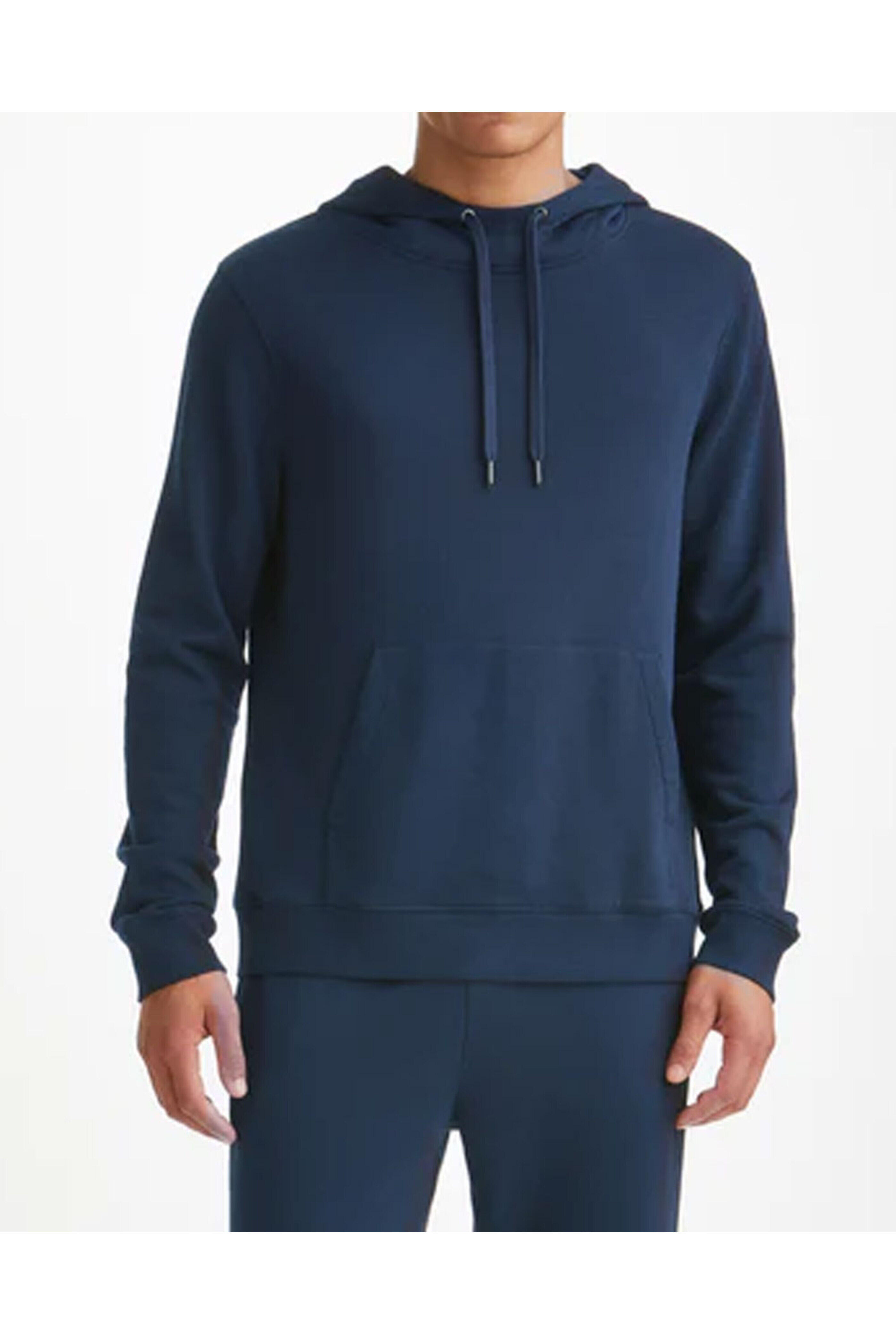 Derek Rose Navy Quinn Hooded Sweatshirt. Drawstring, hooded neckline. Kangaroo pockets. Straight hem. Long sleeves. Pullover style. Regular fit. 68% Cotton, 32% modal.