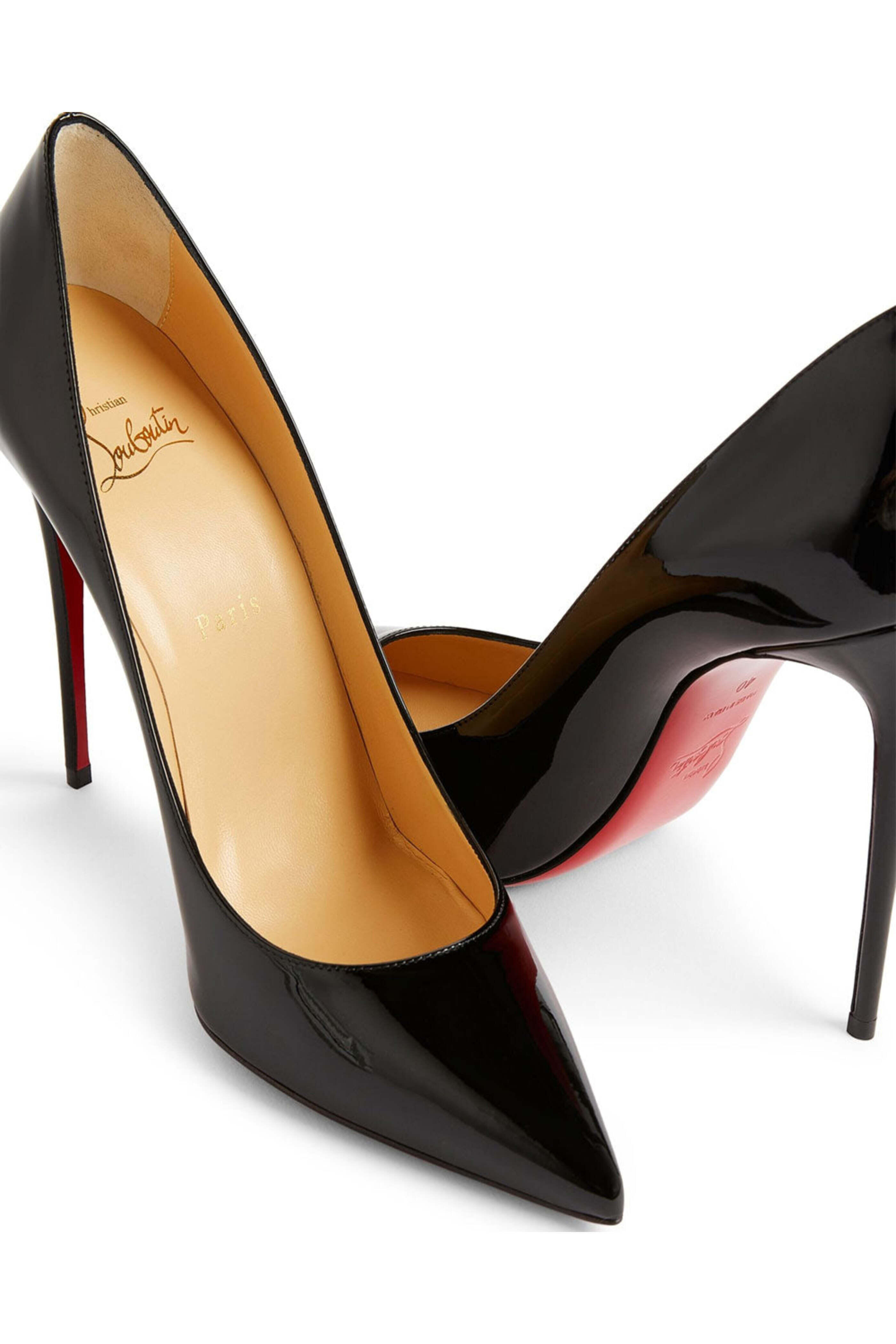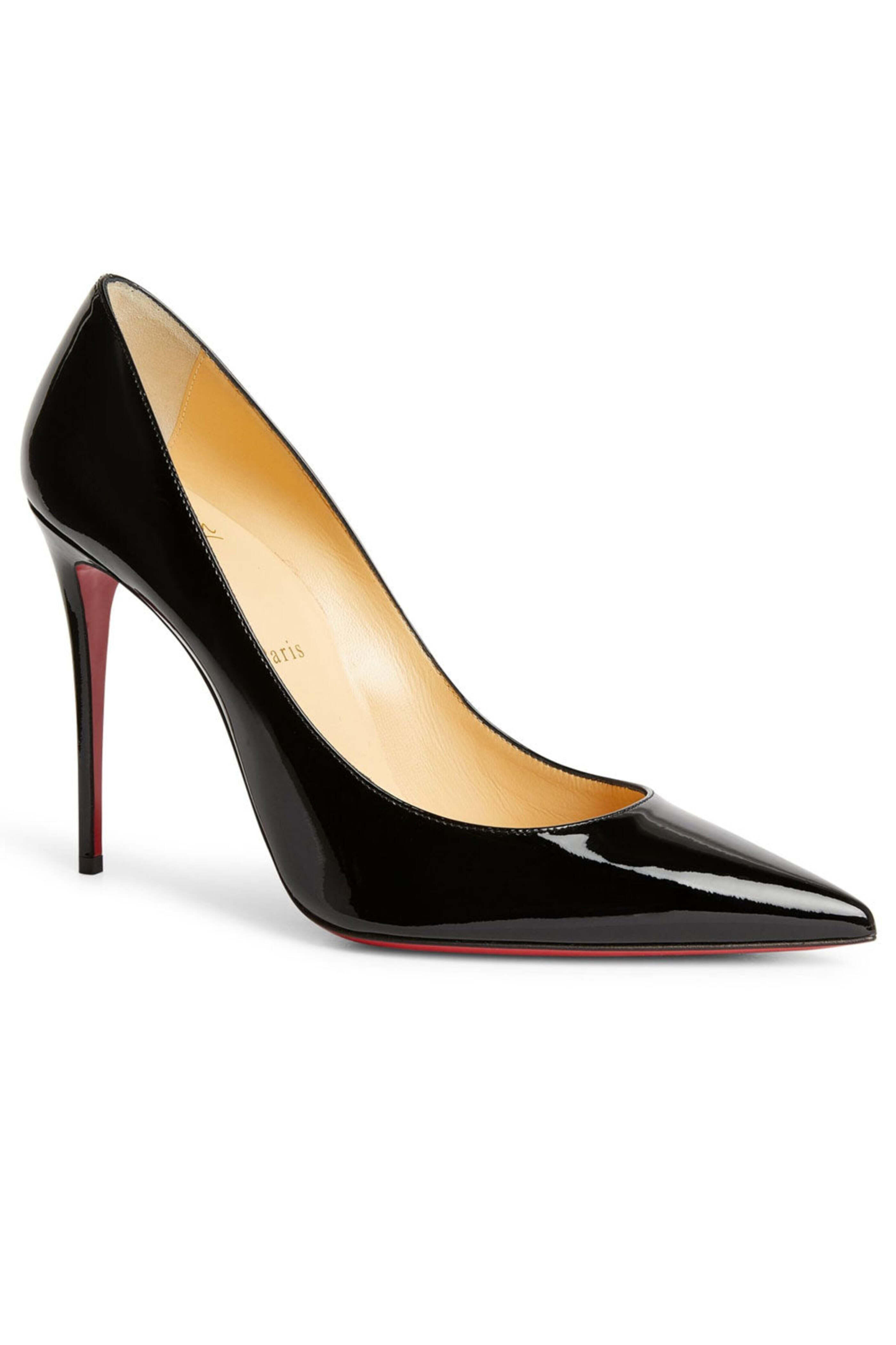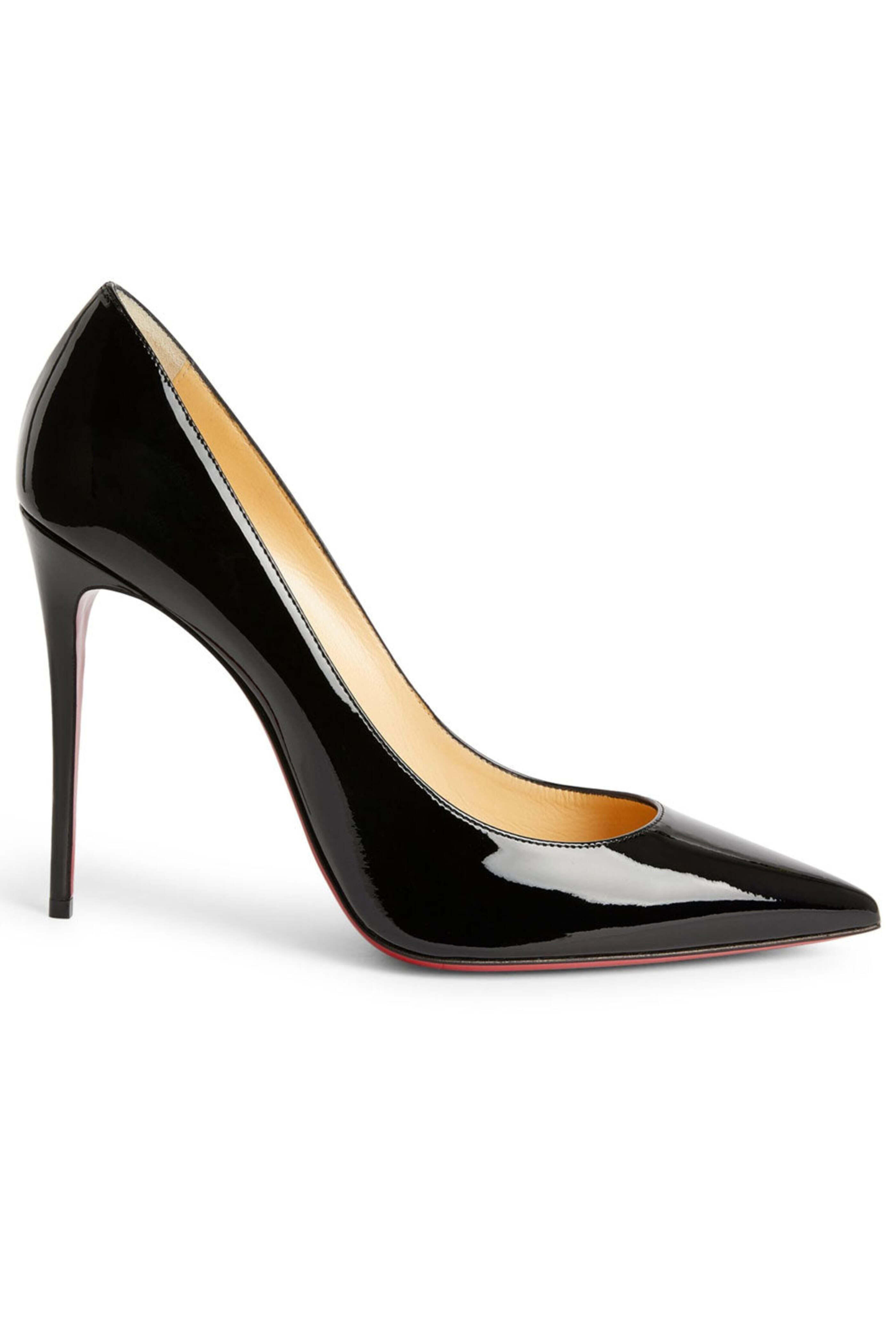 Christian Louboutin Kate 100 in Black. Pointed toe. Slip-on style. 4 (100 mm) stiletto heel. Patent leather upper. Leather lining. Signature red leather sole. Made in Italy.