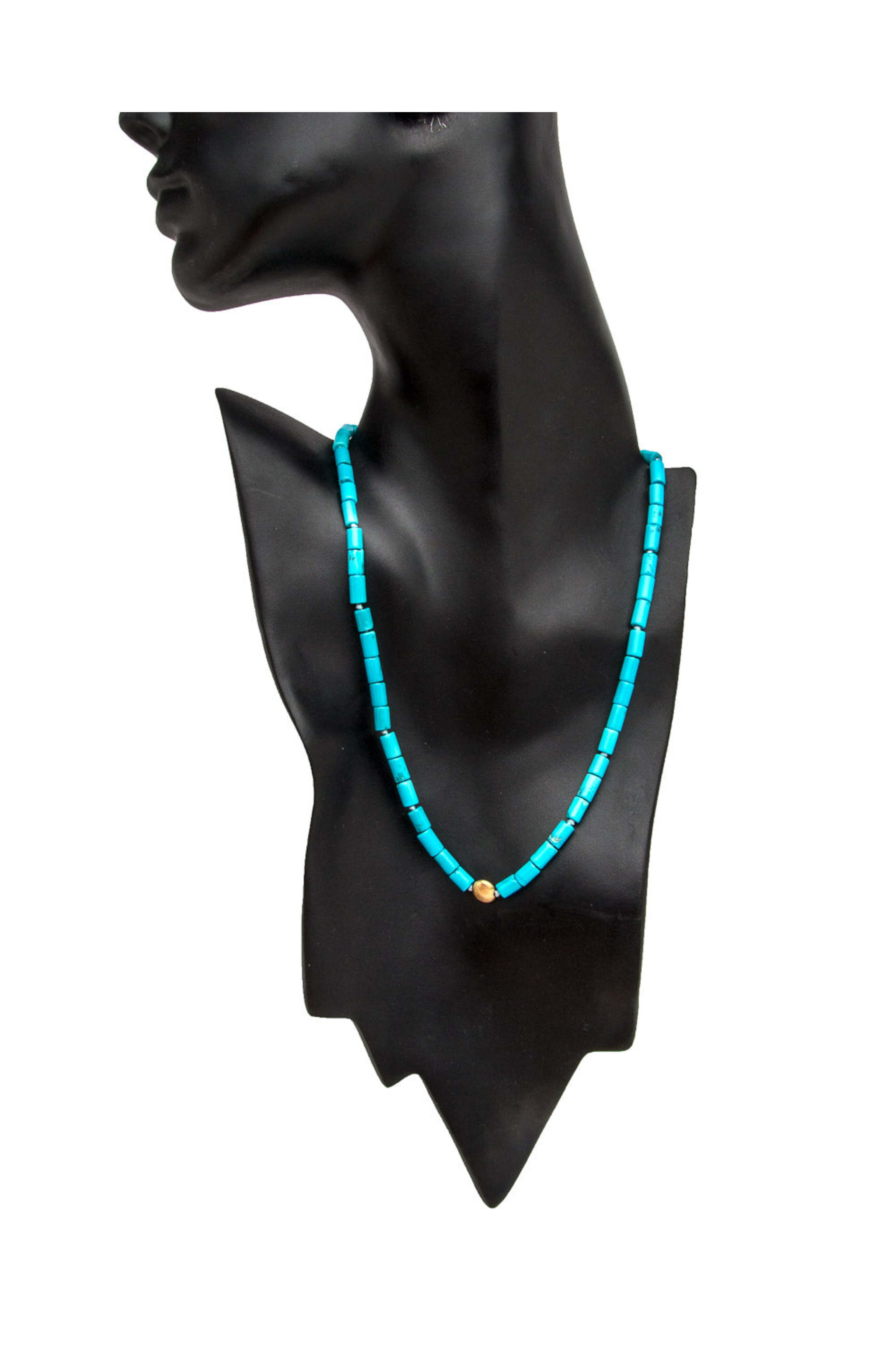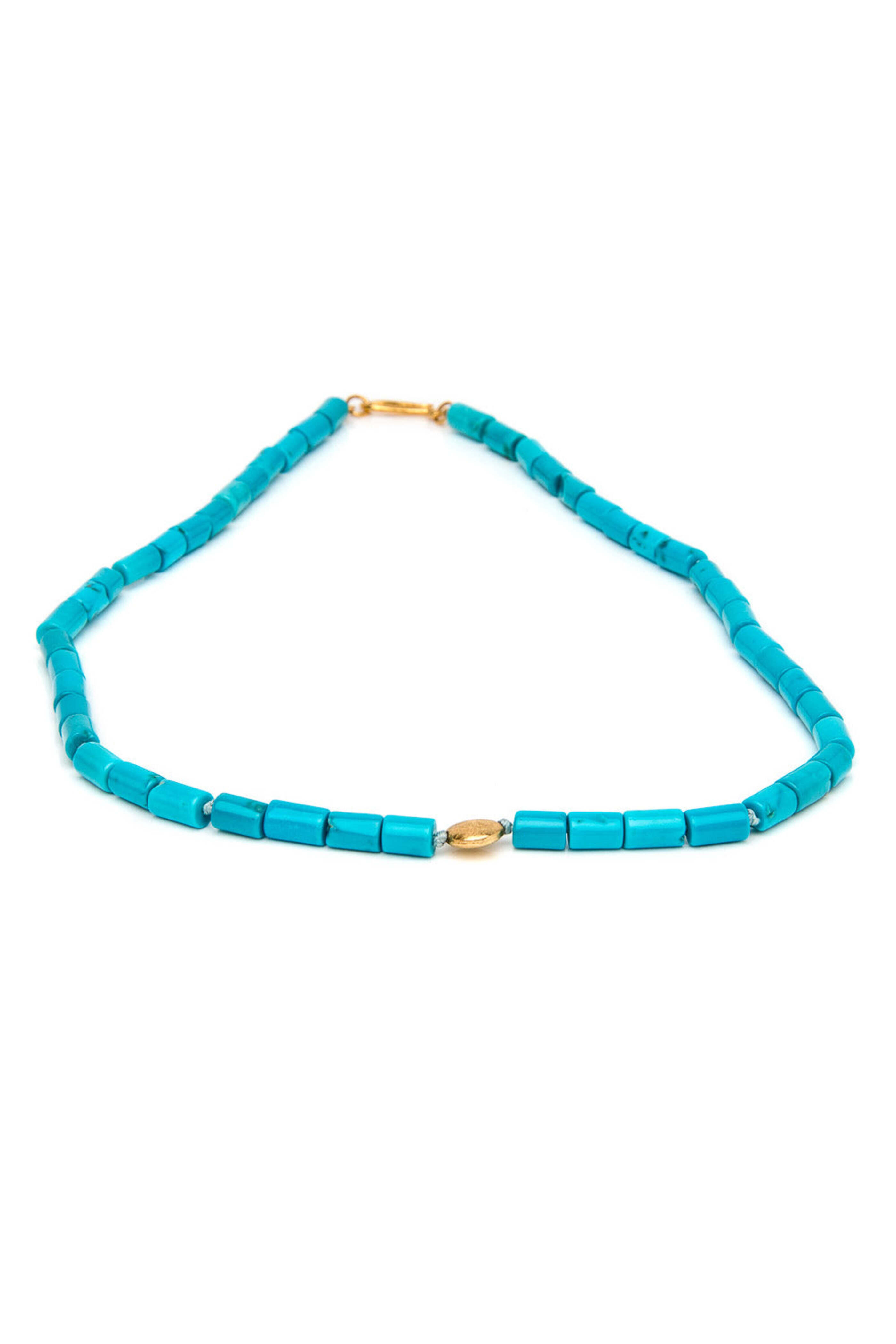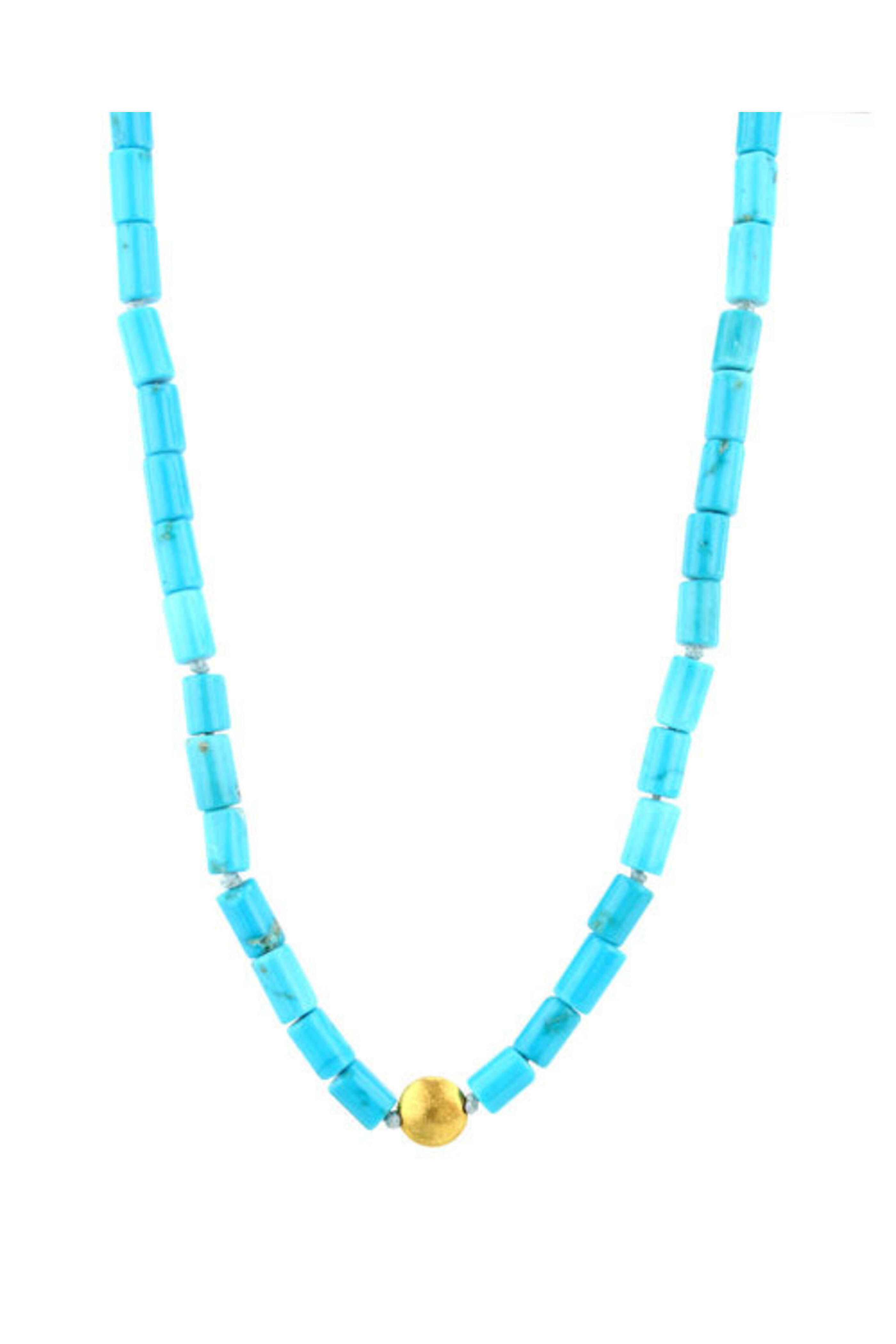 - Darlene de Sedle Fine Turquoise Heishi with Gold Disc Necklace 22k gold Gold disc 0.25" pendant 18.5" long Hook clasp closure
