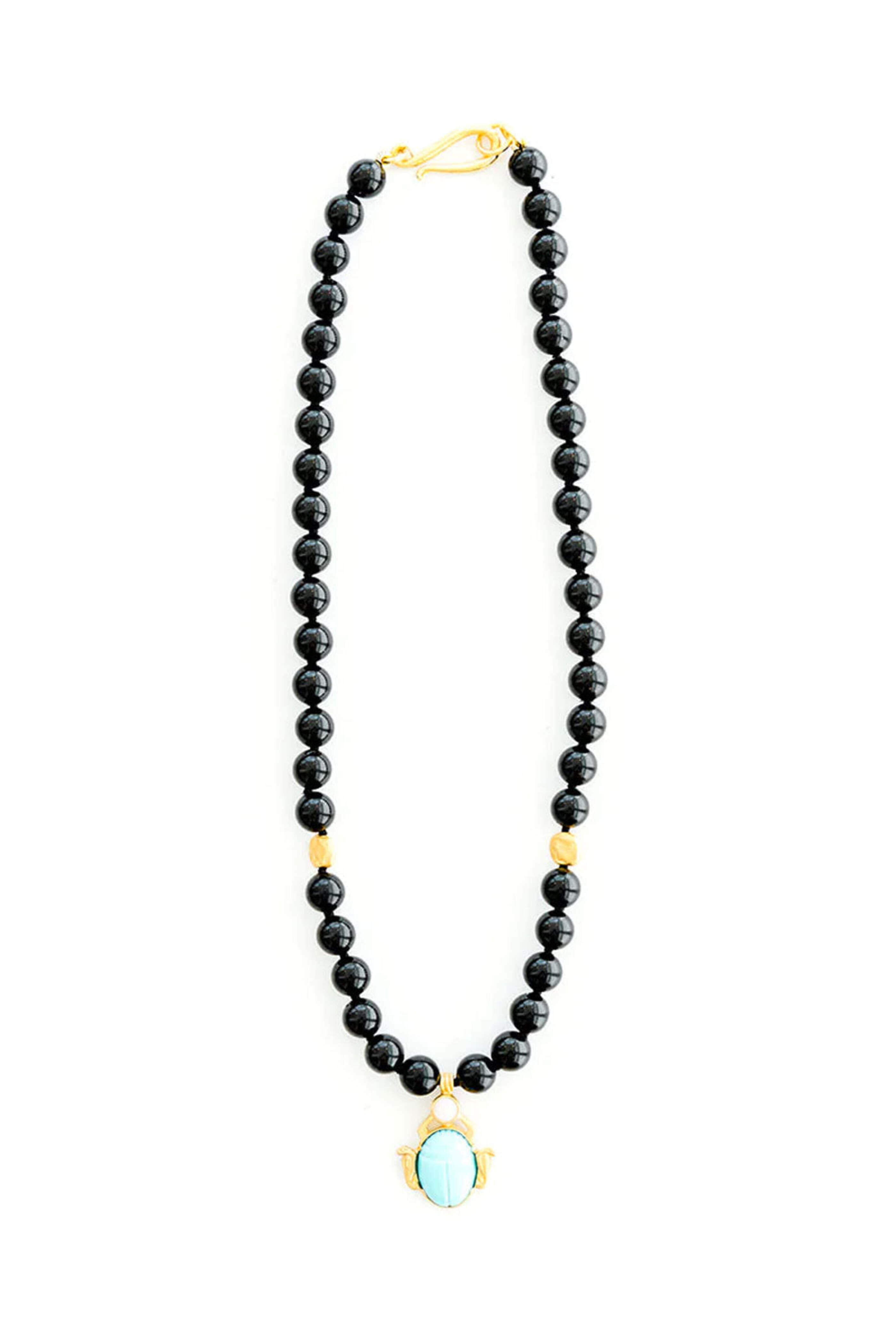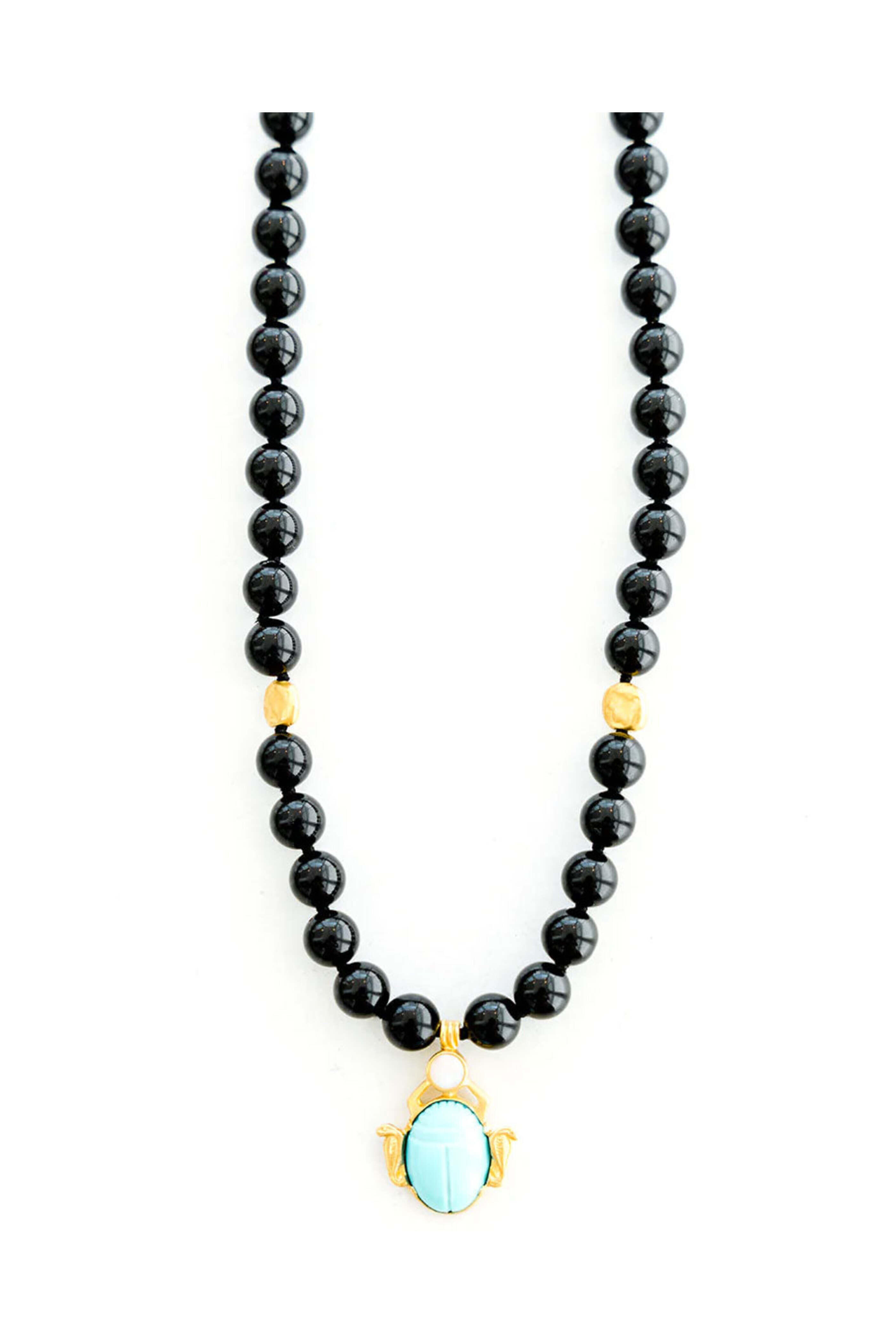 Darlene de Sedle Black Onyx Turquoise Crystal Necklace. 22k yellow gold. Black onyx. Gold coin nuggets. Turquoise Scarab. Crystal Opal. Hook-and-eye clasps. Pendant: 0.31 . Length: 17 .