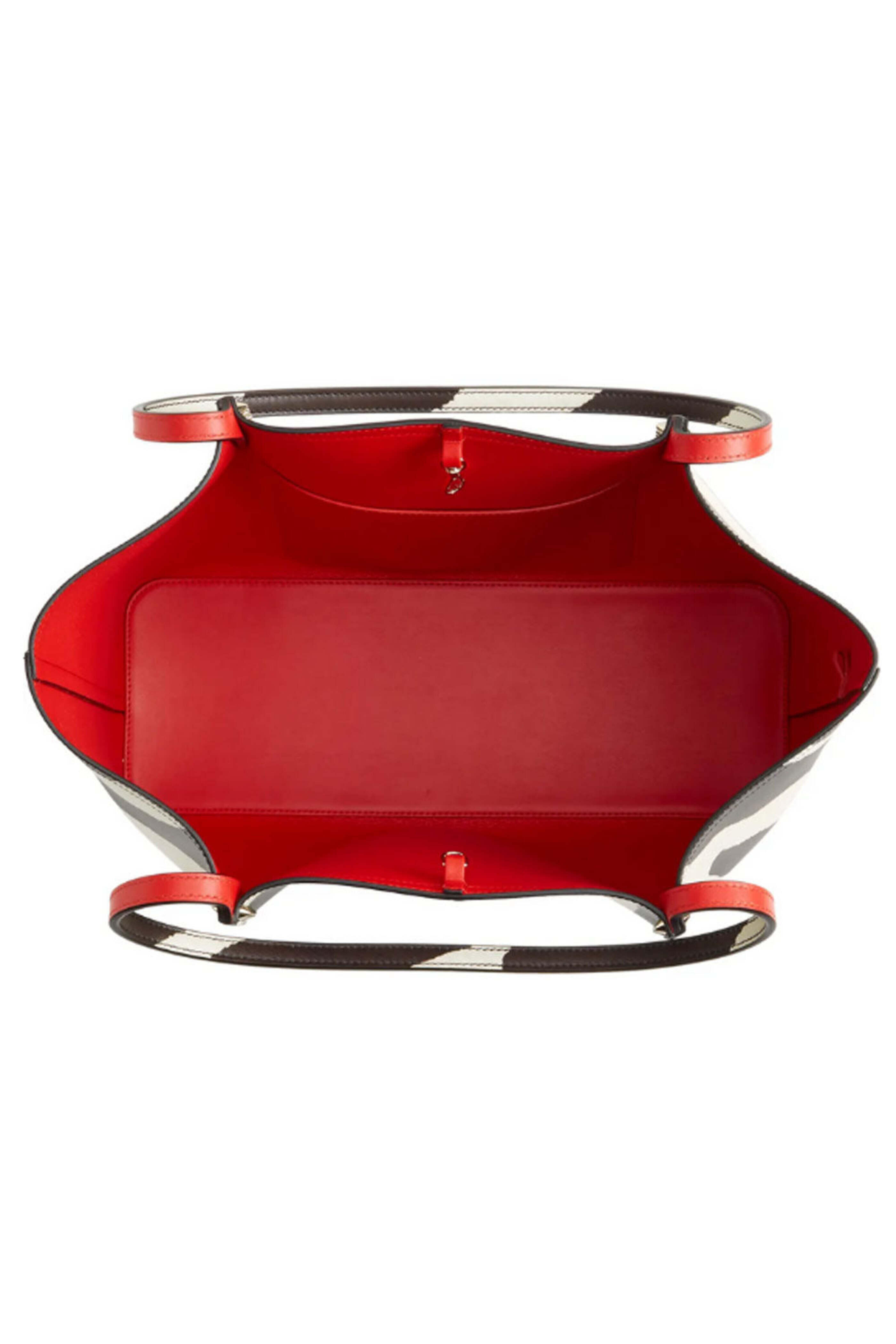 Christian Louboutin Large Cabarock Zebra Stripe Tote in Dark Brown. Open top with bridge clip closure. Two top handles. Interior wall pocket. Structured silhouette with flat base. Spike detail. Calfskin outer. Signature red lining and bottom. 15 W X 11.25 H X 5.25 D. 9.5 strap drop. Made in Italy.