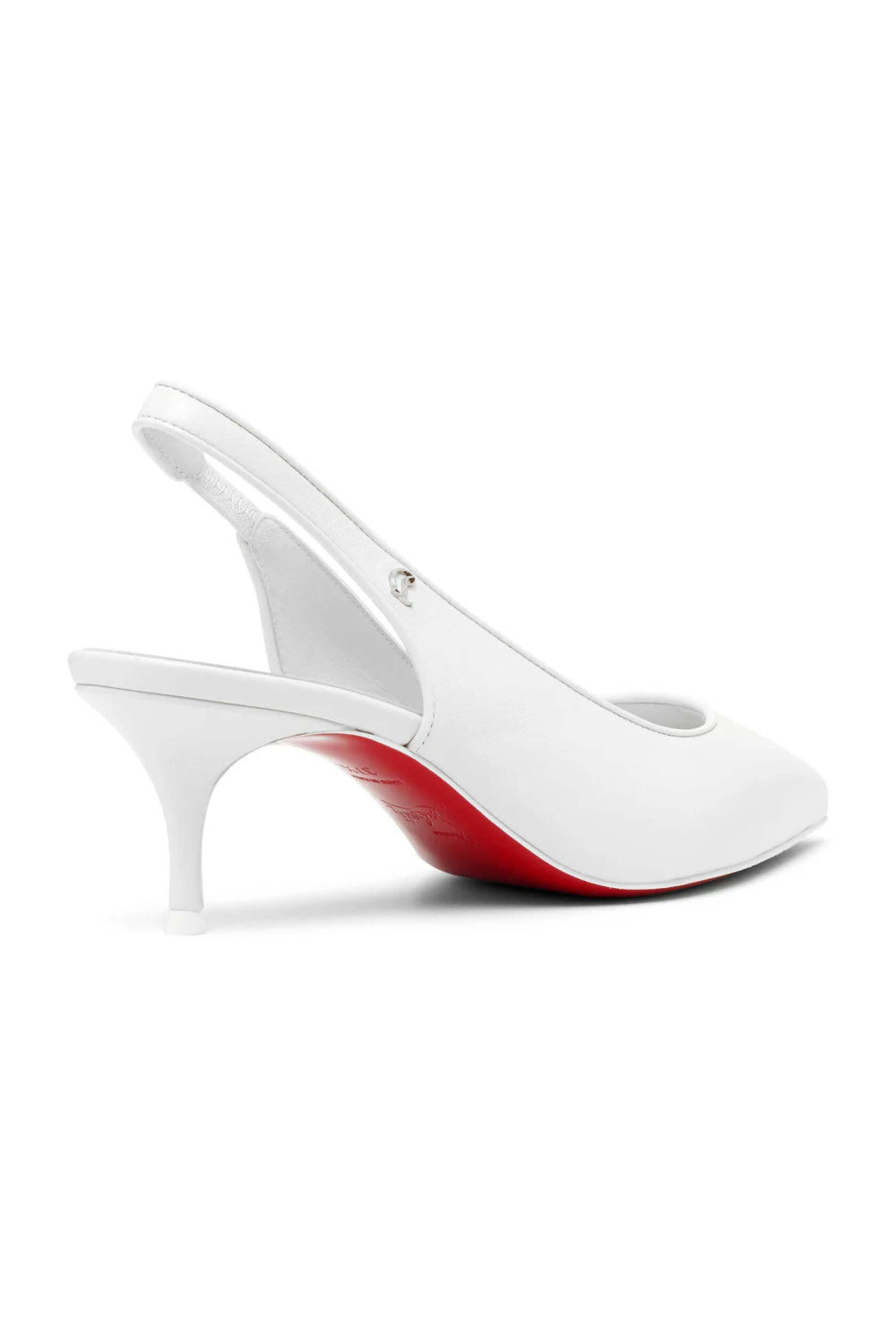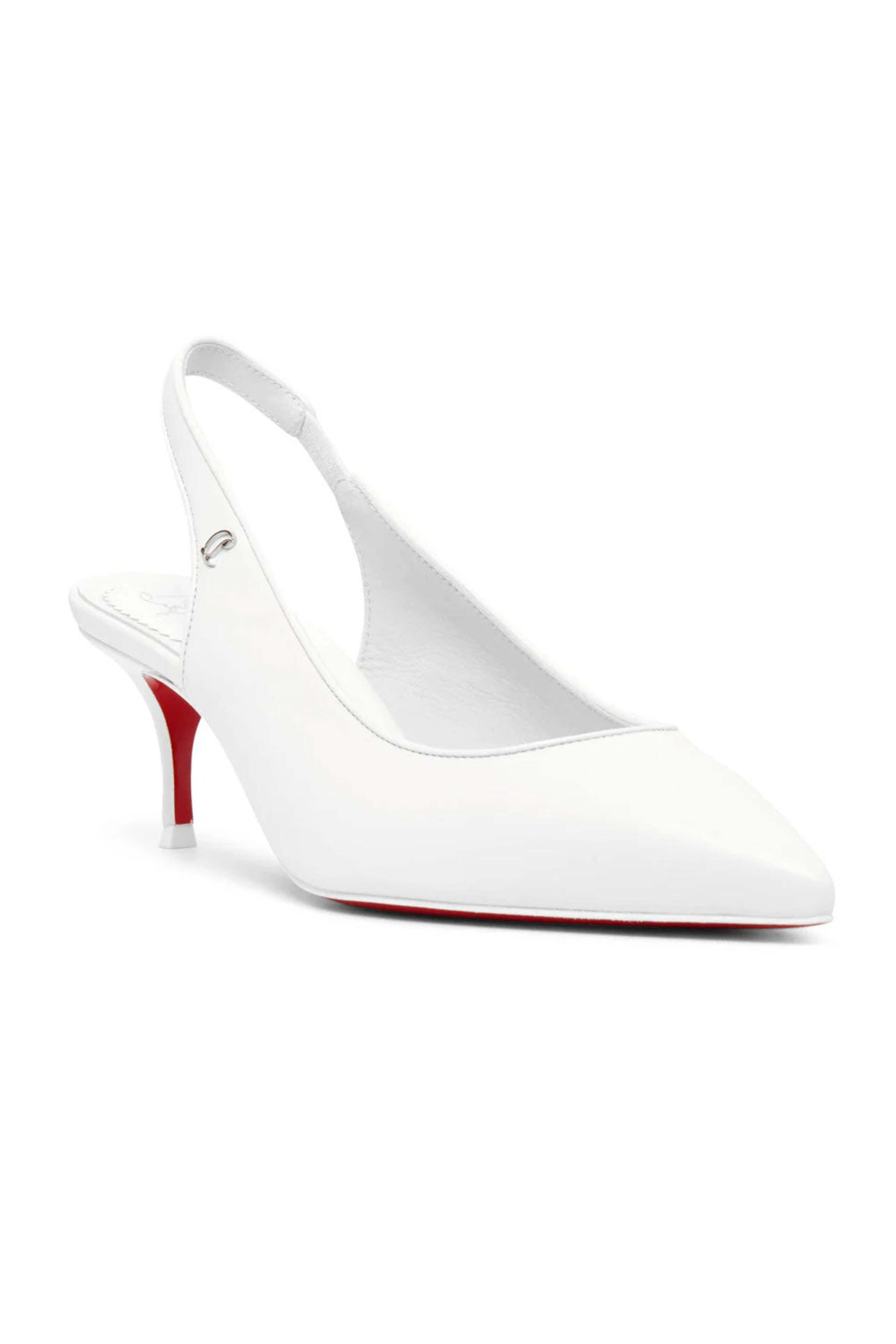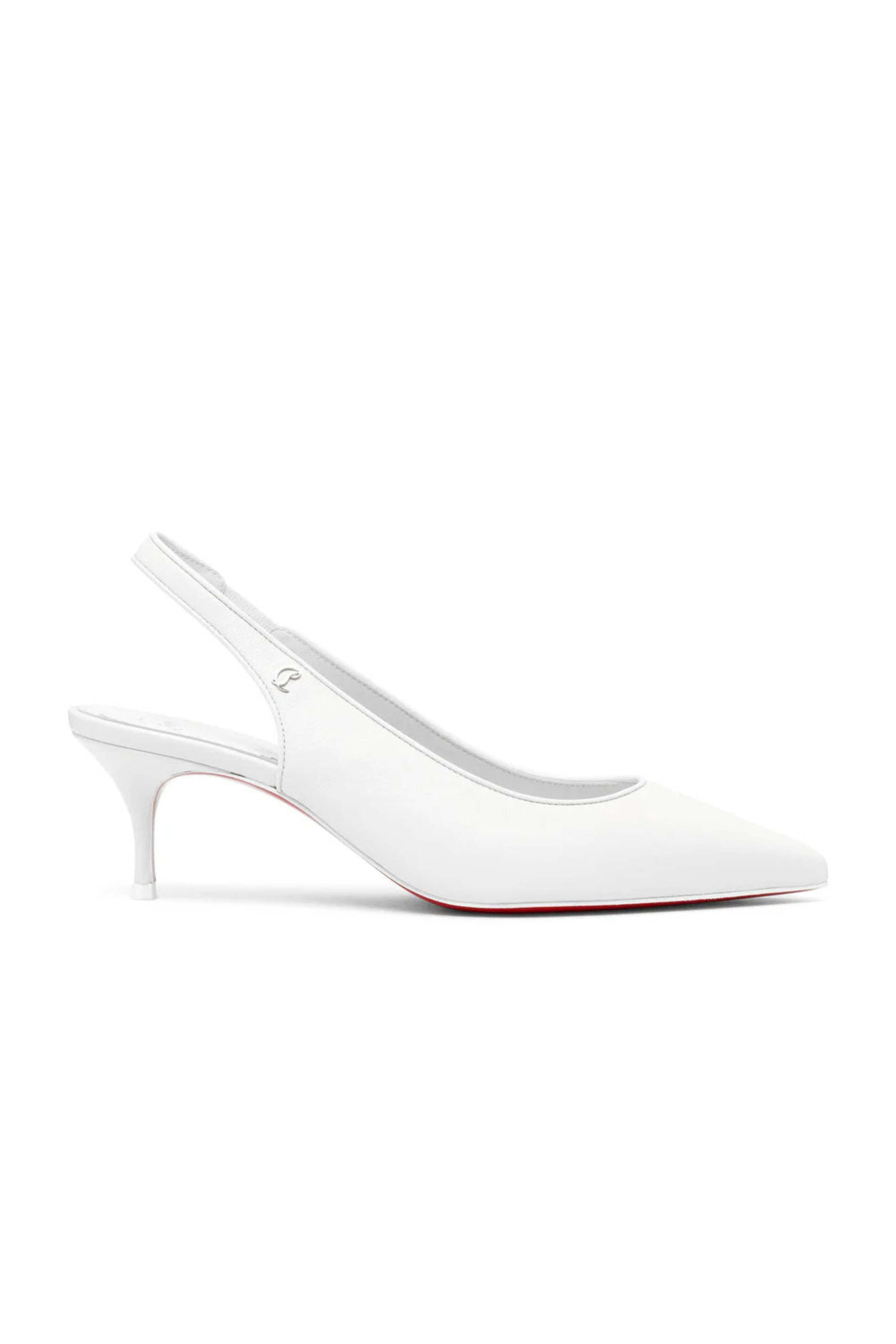 Christian Louboutin Sporty Kate Slingback in White. Pointed closed toe. Slingback strap. CL logo. Leather upper and lining. Signature red leather sole. 2.3 (55 mm) stiletto heel. Made in Italy.