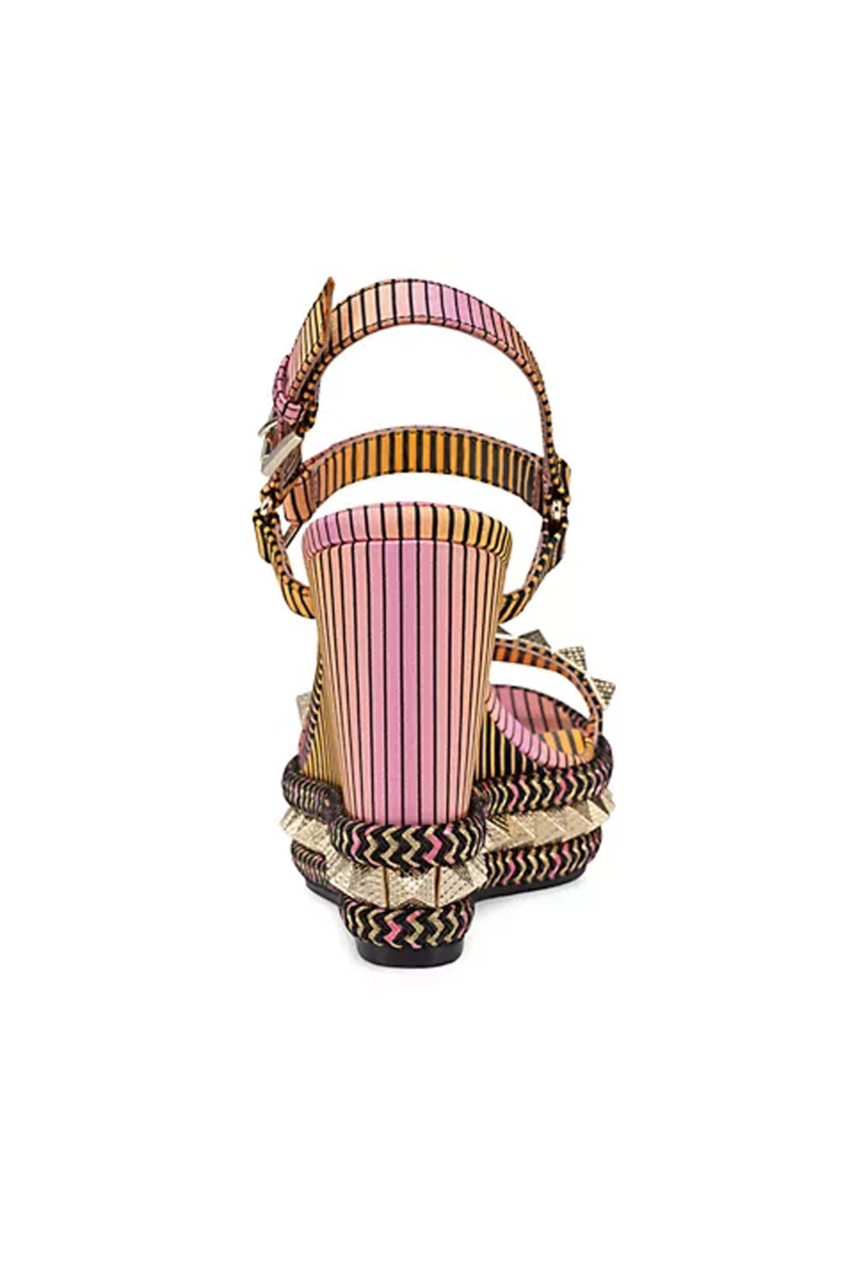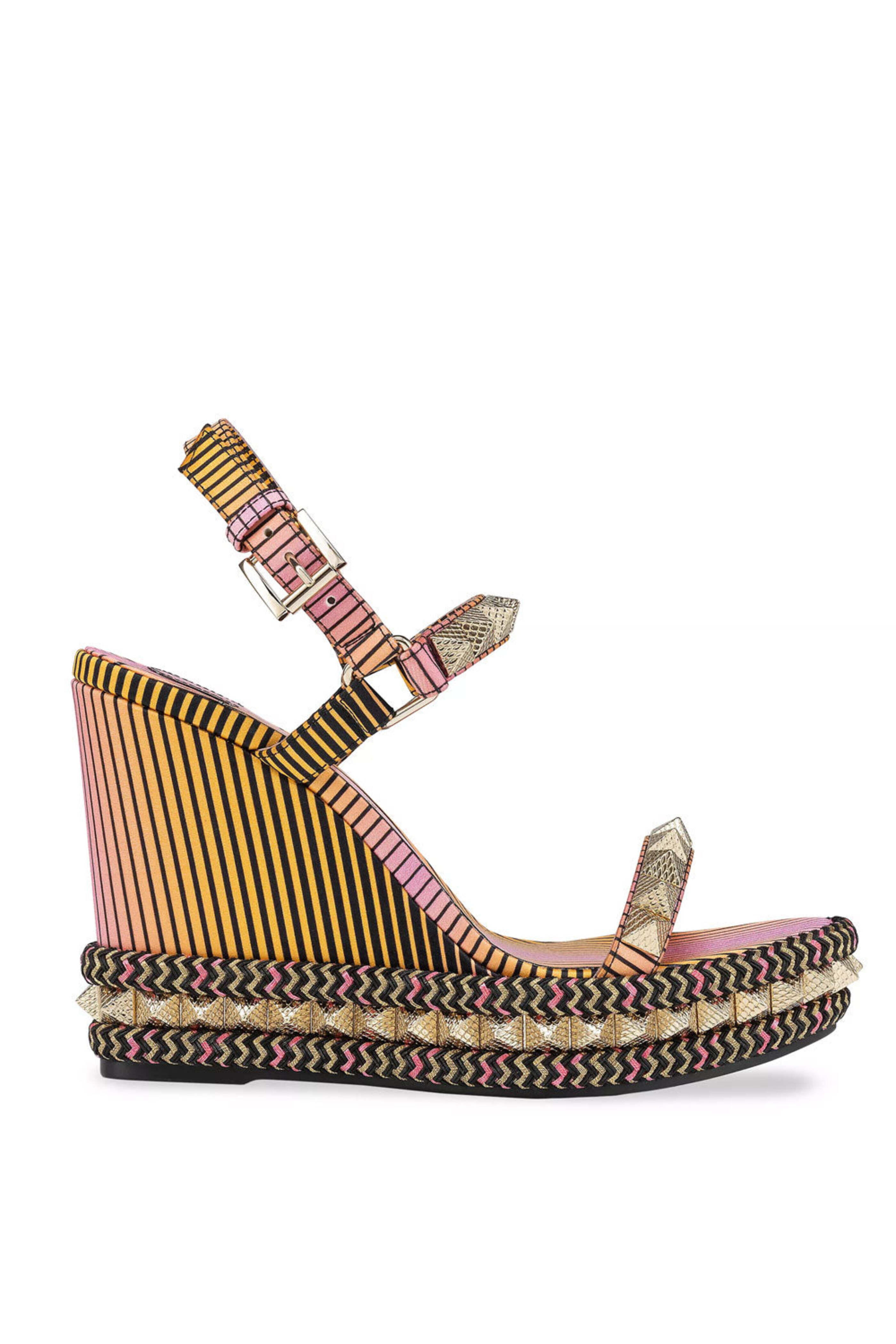Christian Louboutin Pyraclou 110mm Satin Wedge in Muti. Open toe. Round open toe. Slingback buckle strap. Styled with spiked studs and woven panels. Patent leather upper. Leather lining. Rubber sole. 4.3 (110mm) heel height. Signature red leather sole. Made in Italy.
