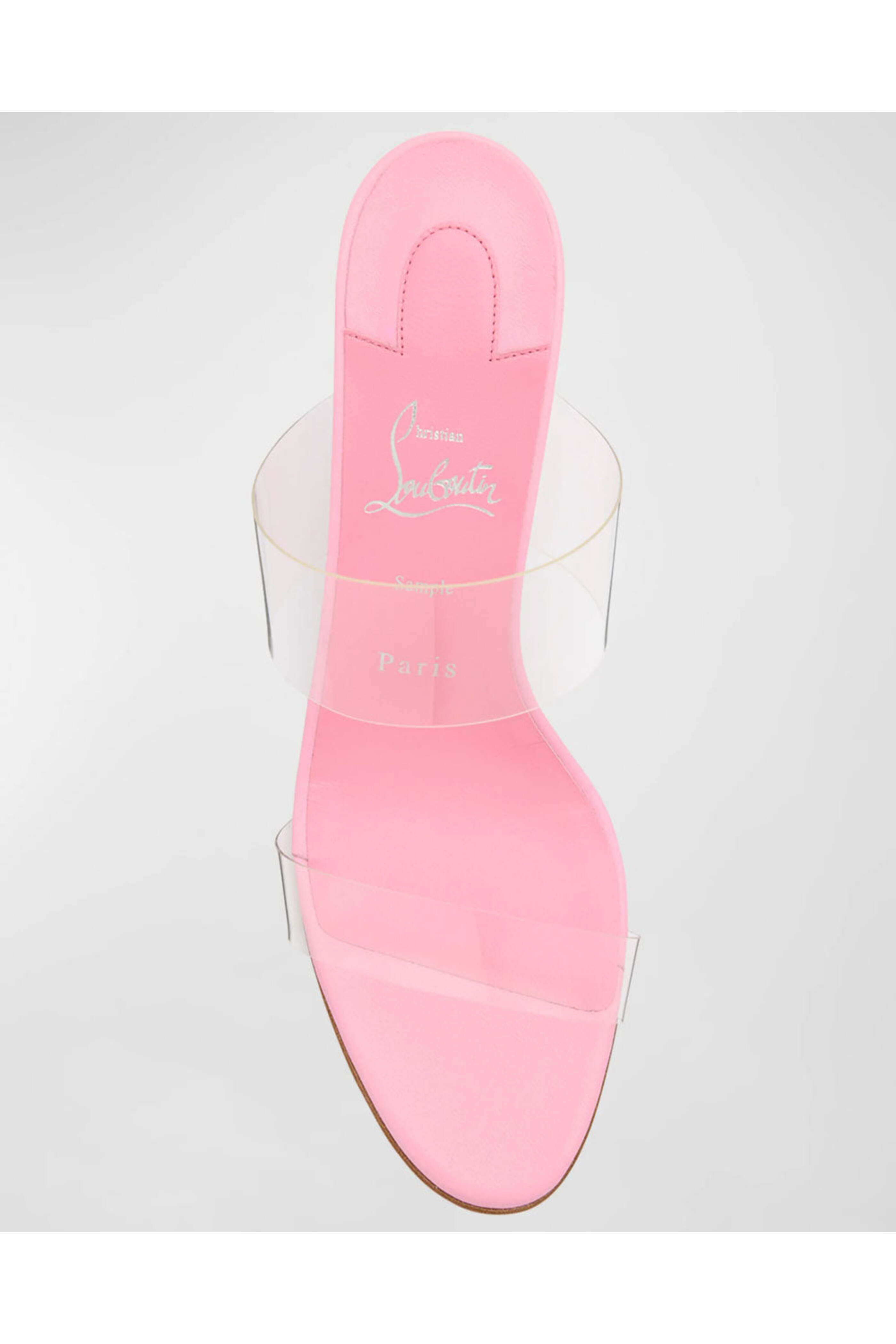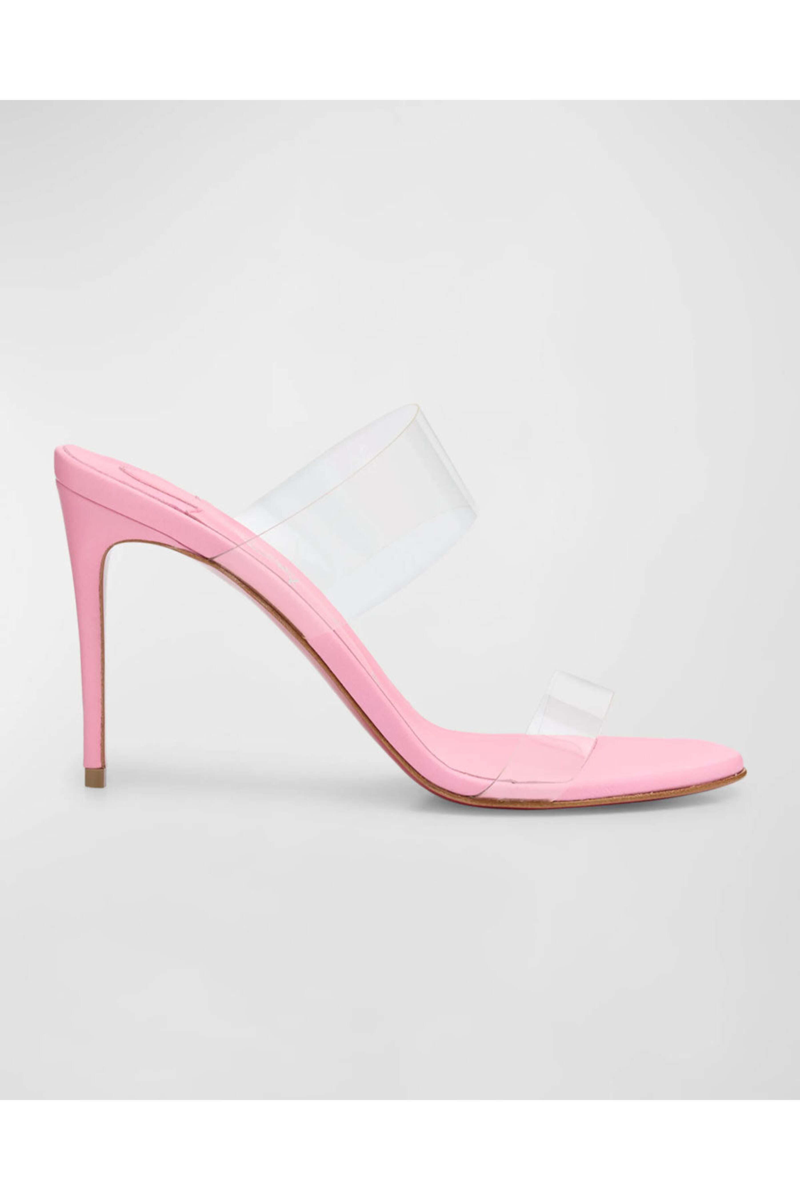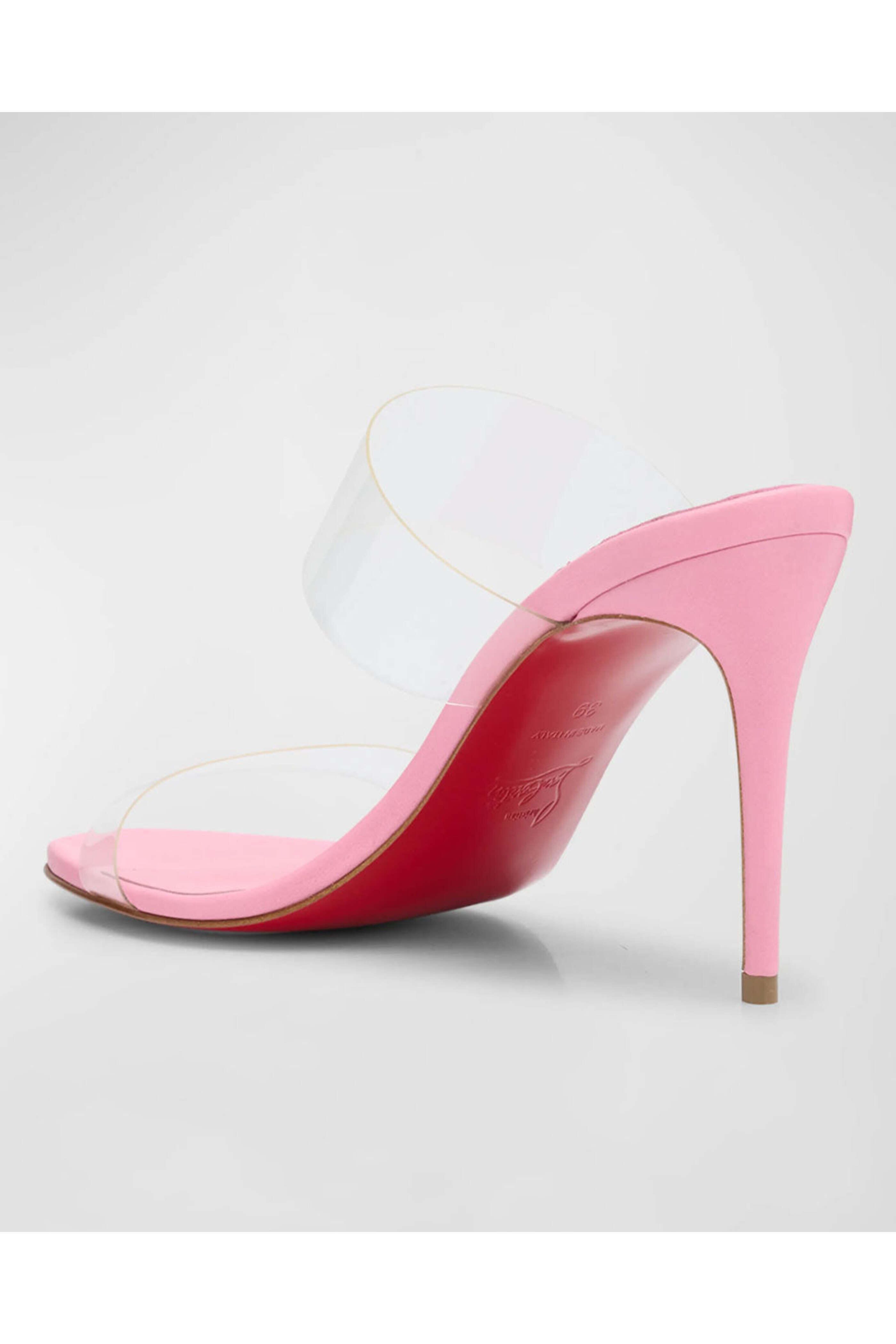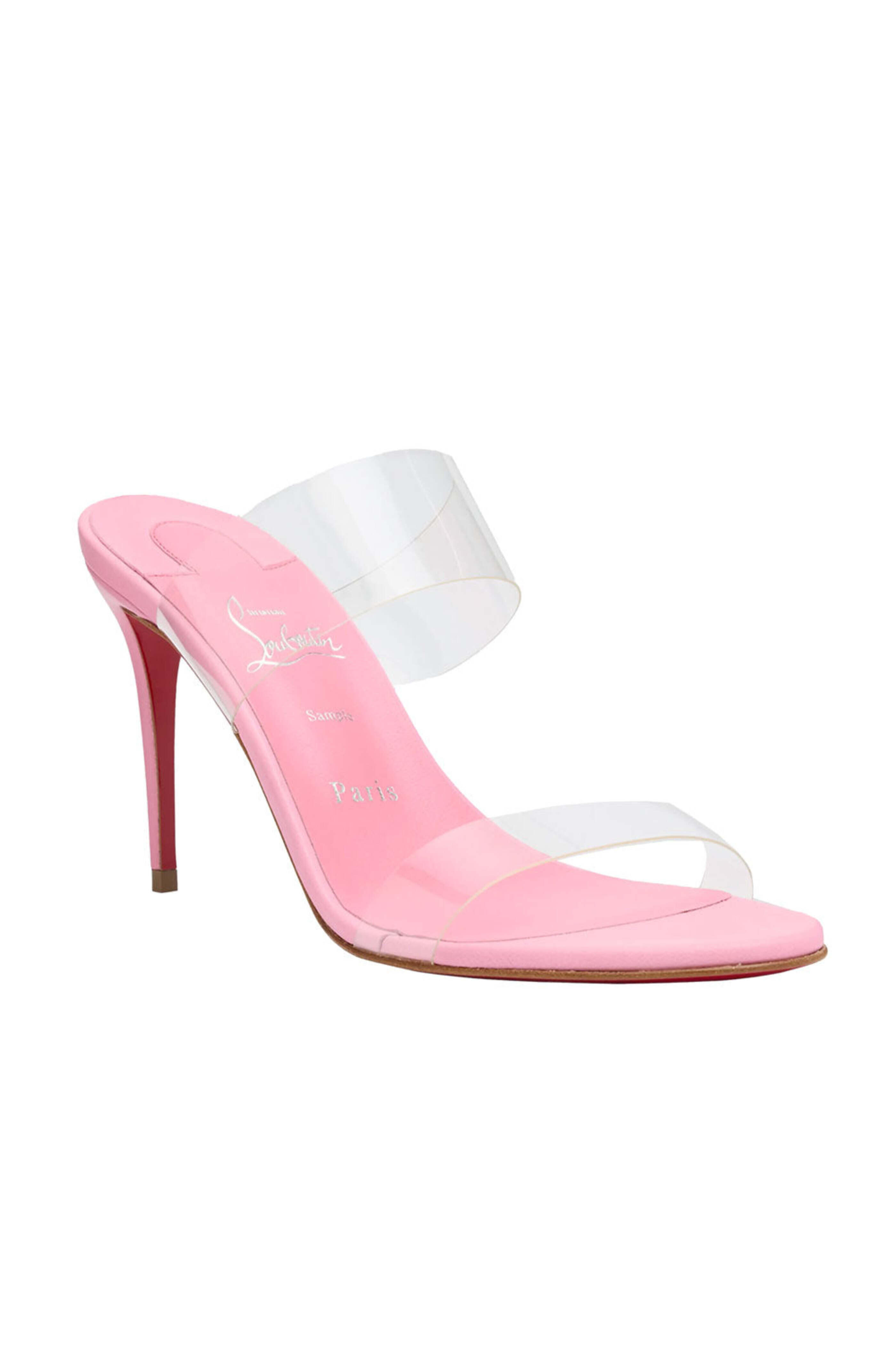 Christian Louboutin Just Nothing Sandal Pink. Round open toe. Slip-on style. PVC straps across vamp. Leather lining and sole. Signature red leather lining. 3.3 (85 mm) stiletto heel. Made in Italy.