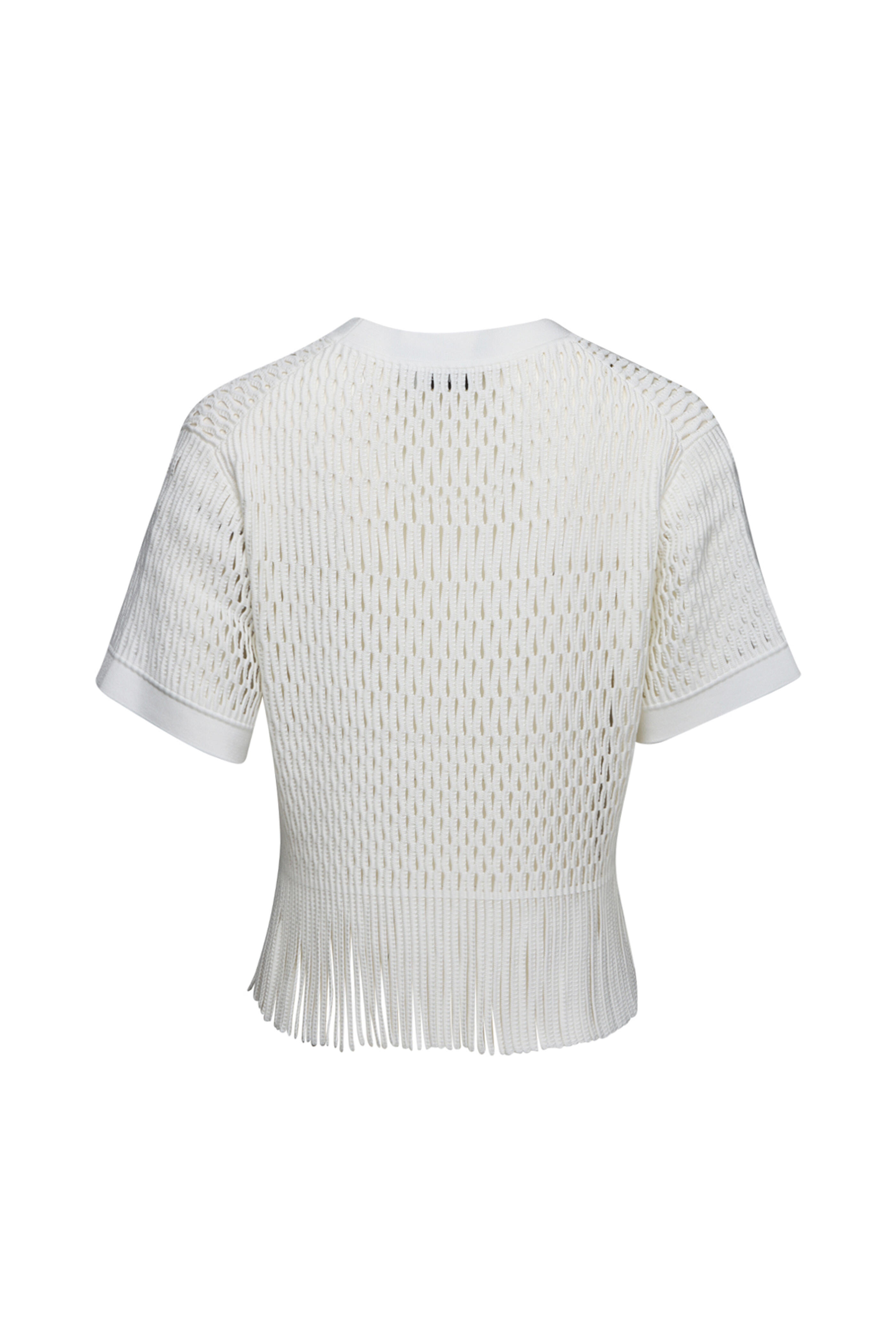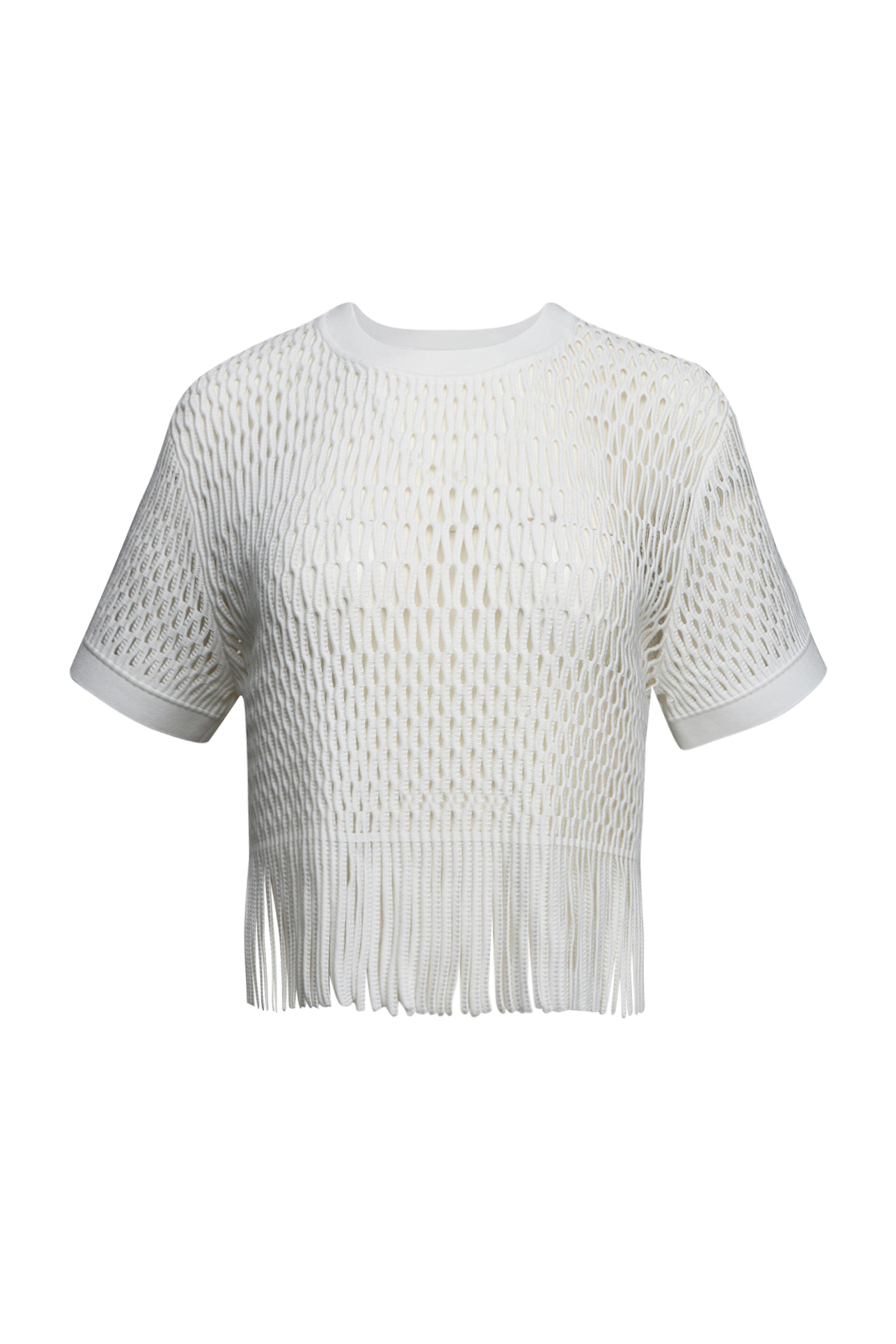 Crewneck. Short sleeves. Cropped length. Fringe hem. Knit fabrication. 80% rayon, 20% nylon.