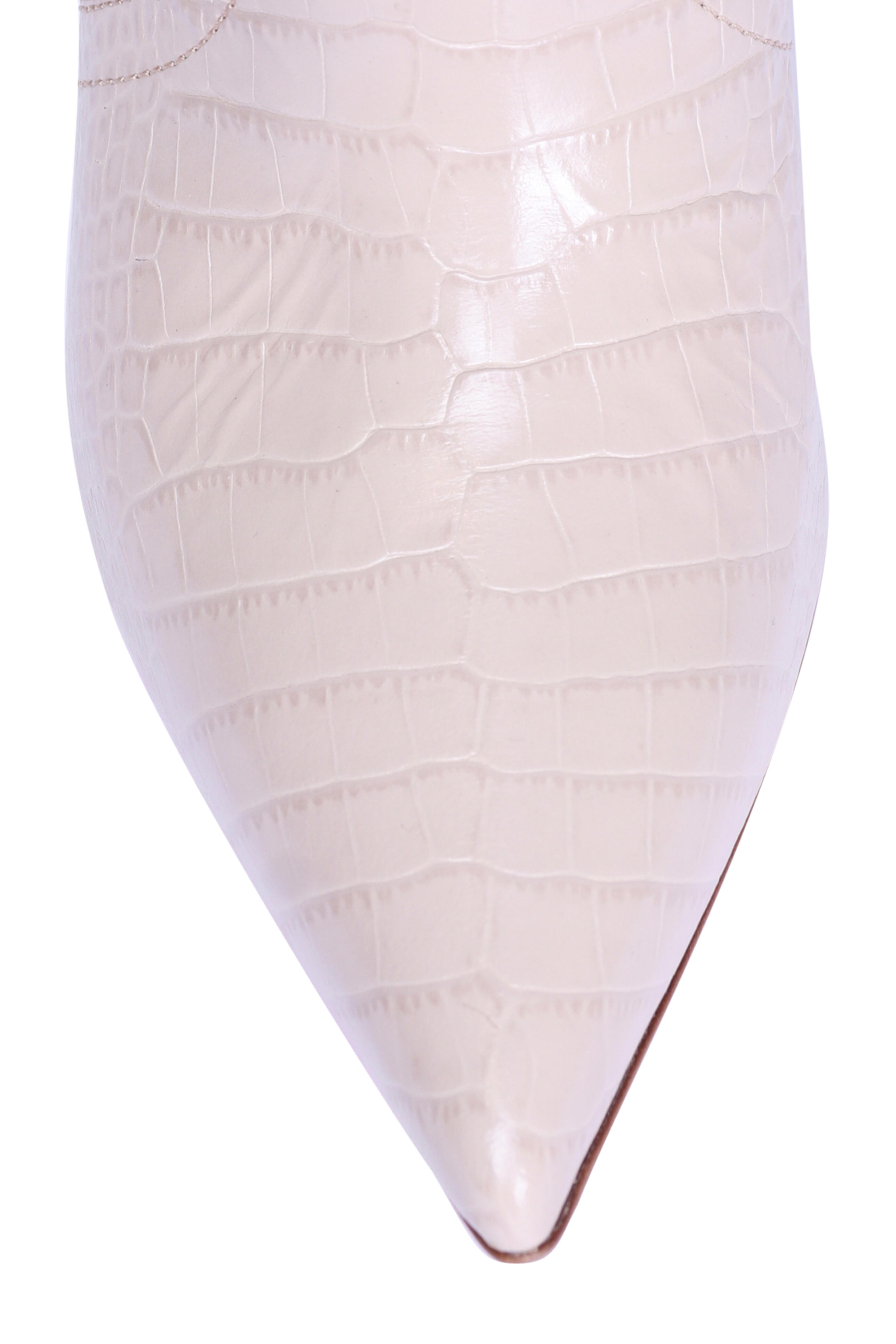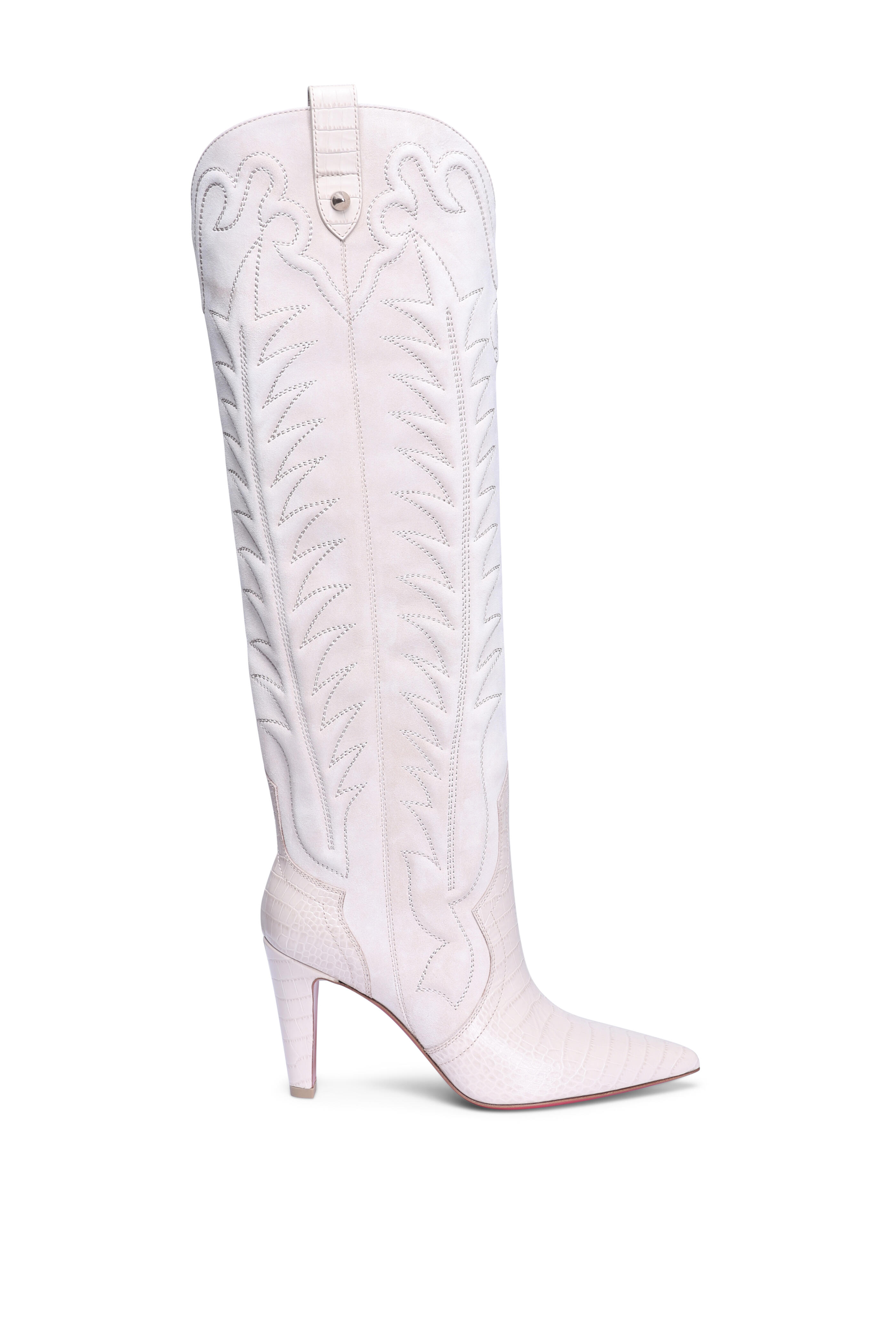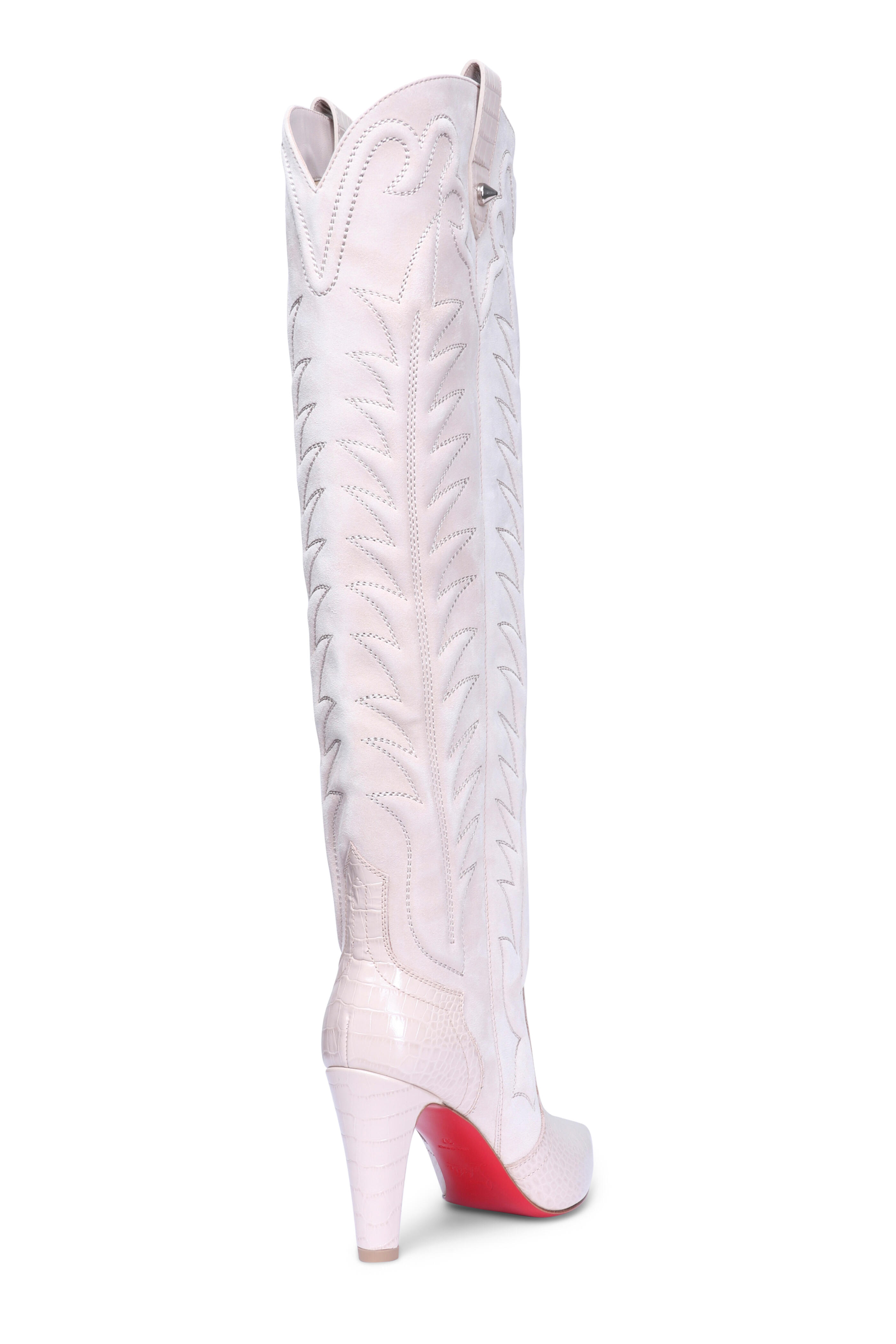 Croc-embossed calf leather and suede upper. Unlined. Signature red leather sole. Pointed toe. Pull-tabs at collar. Pull-on style. Knee-high design. Western style. Stiletto heel. Made in Italy. Heel measurement: 85mm.